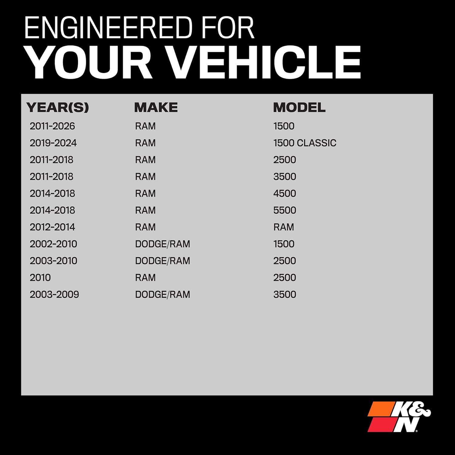K&N Filtro de ar do motor original de alto fluxo vitalício: Aumento de potência: Premium, Lavável: Compatível com Dodge/Ram 2002-2025: 1500, 2500, 3500, 4500, 5500, 33-2247