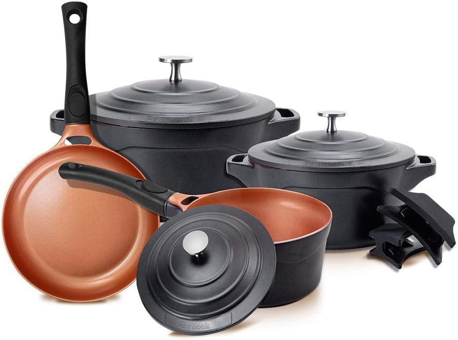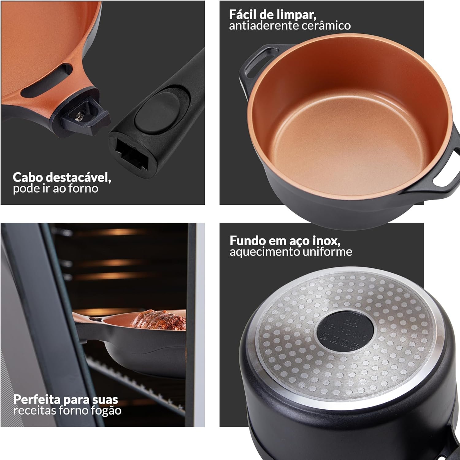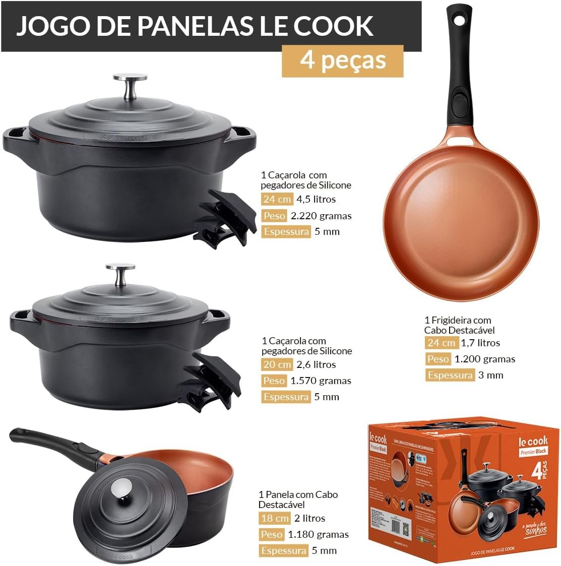 LE COOK Jogo de Panelas Antiaderente Cerâmica Preto 4 Peças Caçarolas 20cm e 24cm, Panela 18cm e Frigideira 24cm com Cabos Destacáveis Alças de Silicone Alta Performance