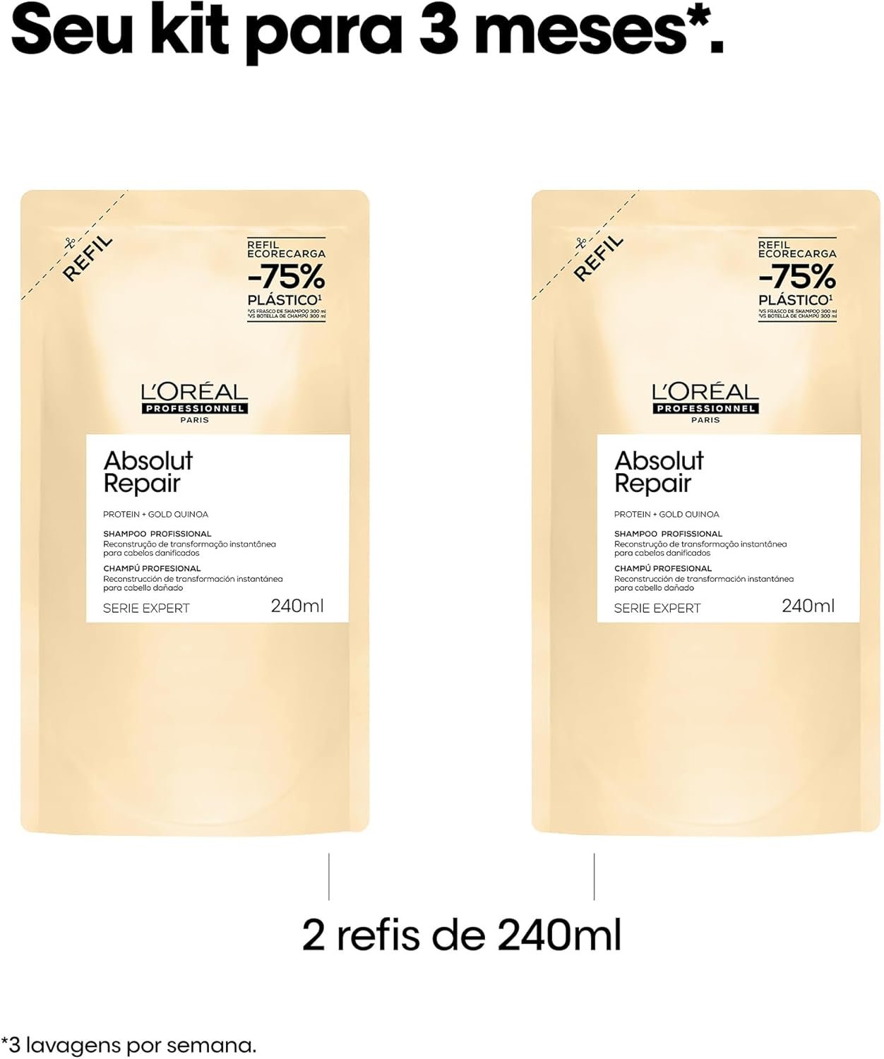 L’Oréal Professionnel Serie Expert Absolut Repair, Shampoo Reconstrutor para Cabelos Danificados e Finos Refil com Quinoa Dourada, Reparação Profunda e Brilho Intenso 240ml