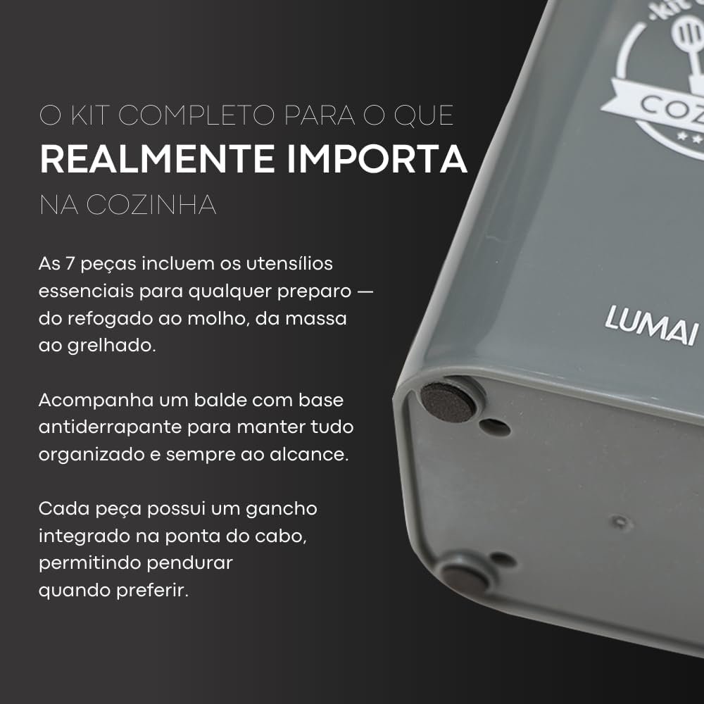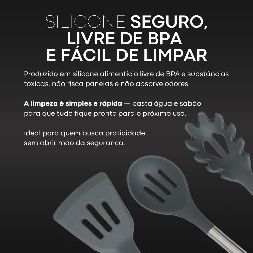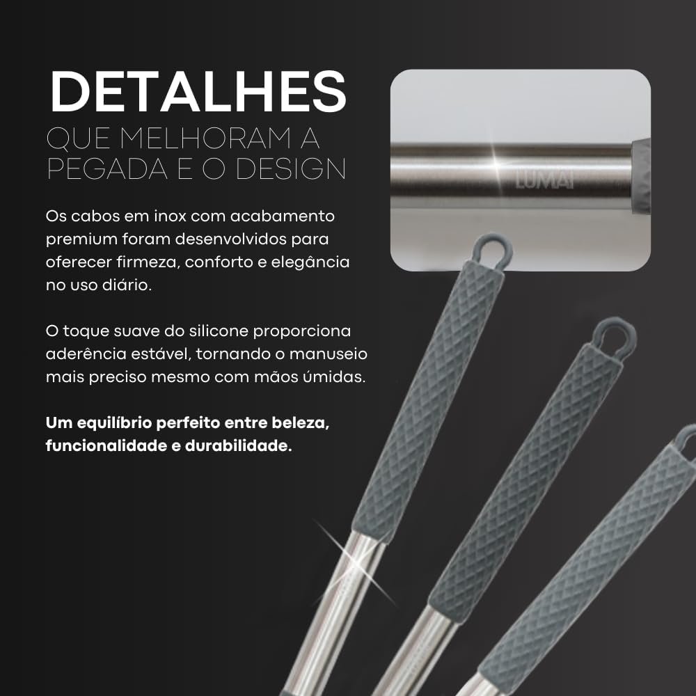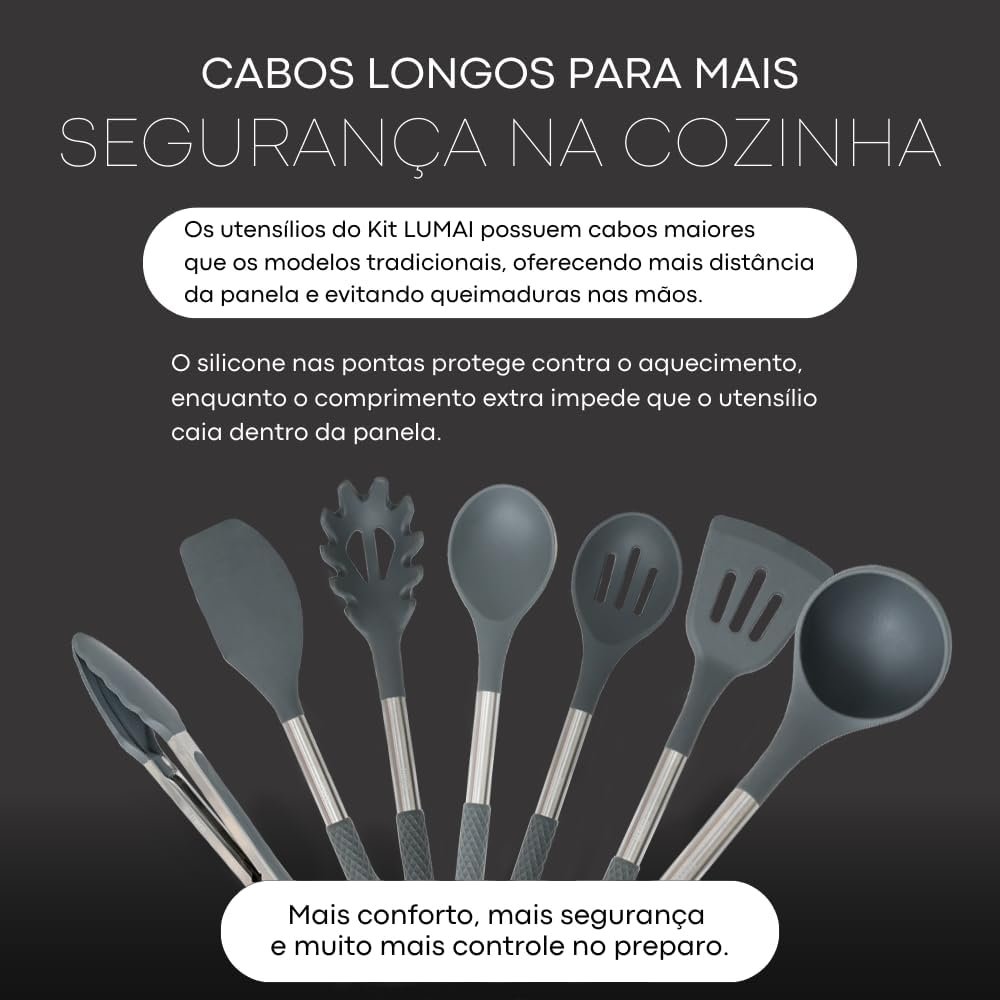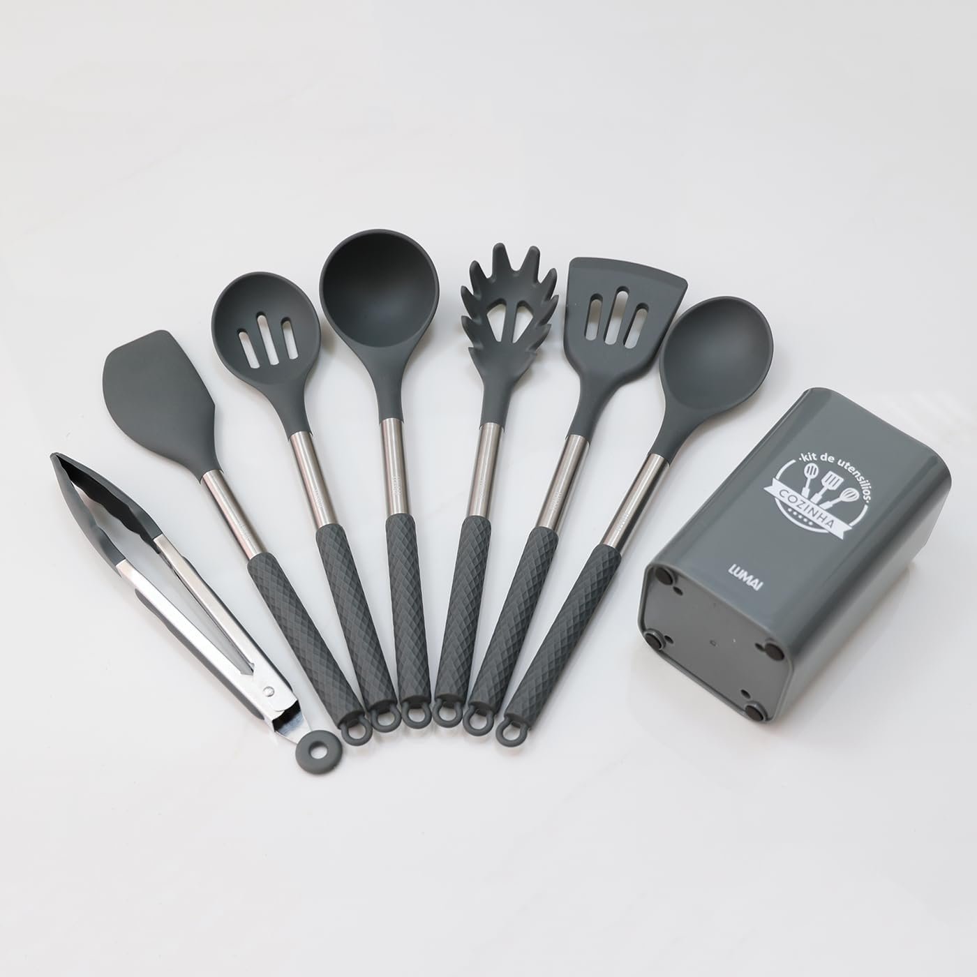 LUMAI Kit 8 Utensílios de Cozinha Grandes em Silicone e Aço Inox, Resistentes ao Calor, Antiderrapantes e Antirriscos, Acessórios de Cozinha Inclui Espátula, Colher, Pegador de Massa, Concha – Cinza