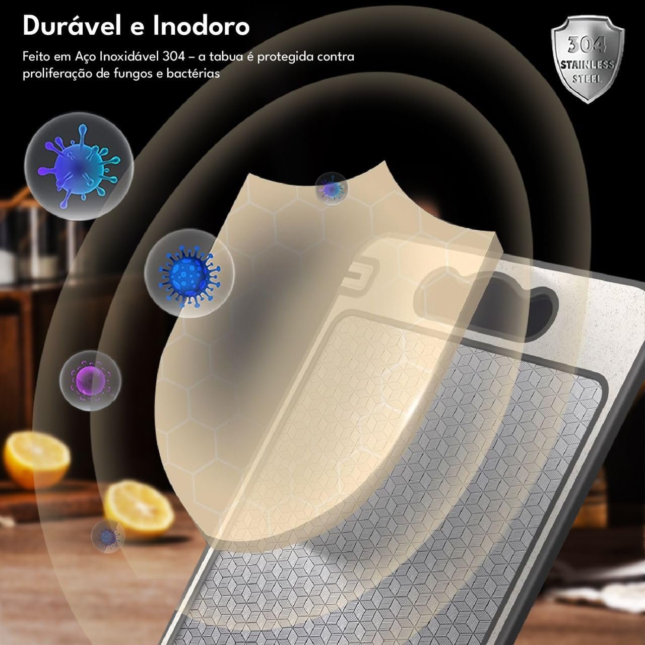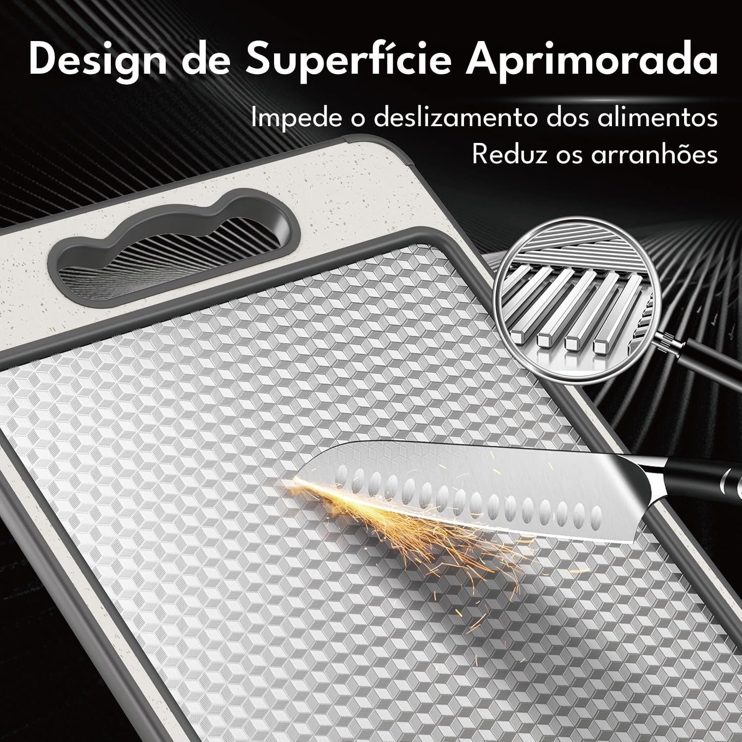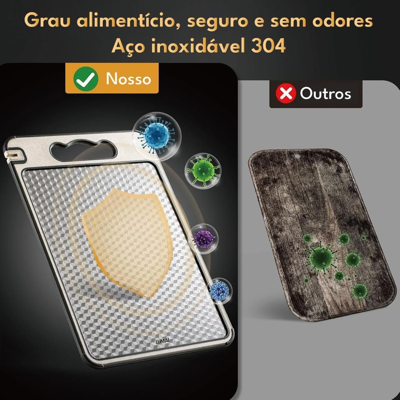 LUMAI Tábua de Corte para Cozinha Dupla Face Aço Inoxidável e PP, Superfície Higiênica para Carnes, Frutas e Vegetais, Afiador Integrado, Canaletas Antirrespingo, Base Antiderrapante e Alça ErgonômicaLUMAI Tábua de Corte para Cozinha Dupla Face Aço Inoxidável e PP, Superfície Higiênica para Carnes, Frutas e Vegetais, Afiador Integrado, Canaletas Antirrespingo, Base Antiderrapante e Alça Ergonômica