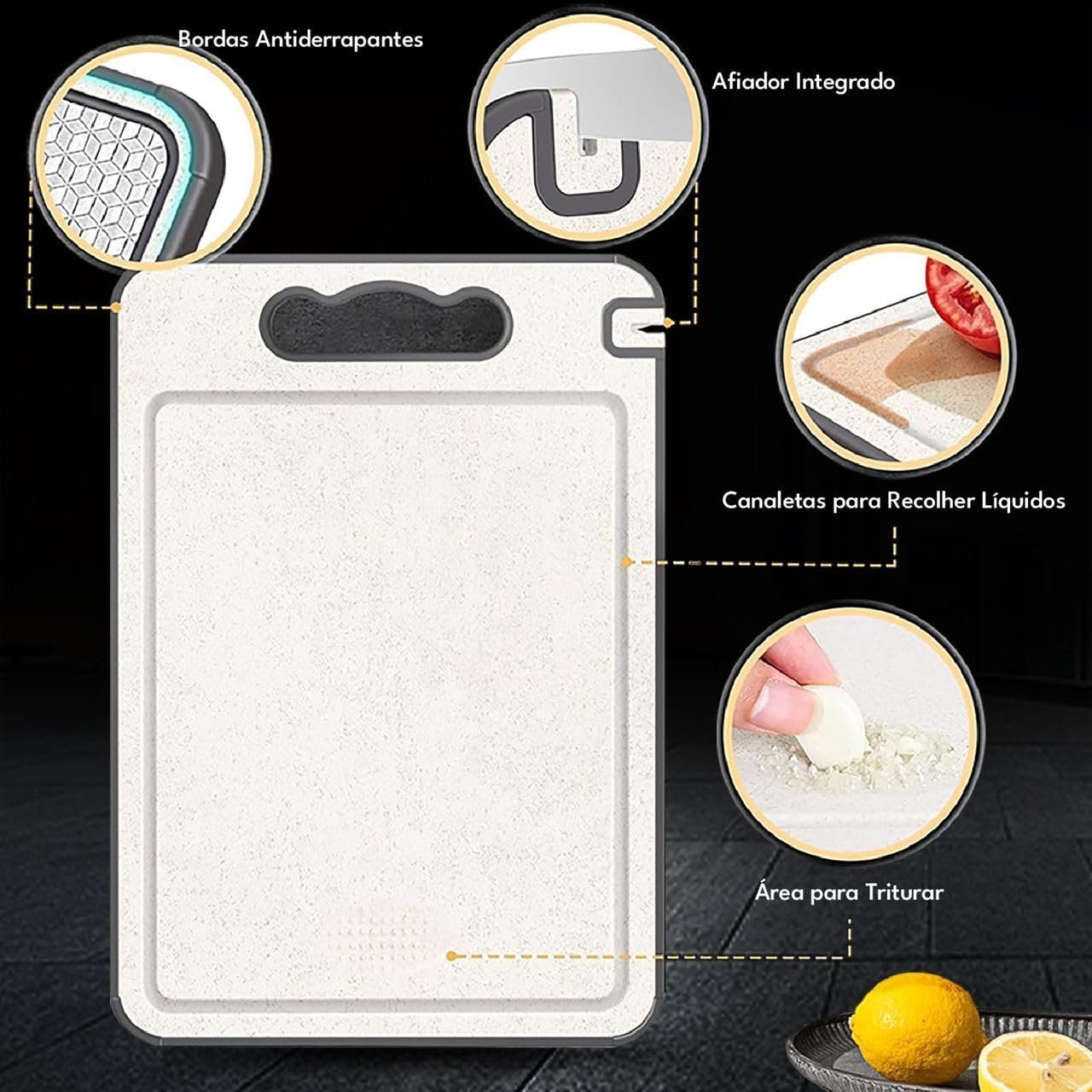 Sua superfície higiênica garante a segurança alimentar da sua família, enquanto o afiador integrado mantém suas facas sempre afiadas. As canaletas antirrespingo e a base antiderrapante tornam o processo de corte mais seguro e limpo, evitando bagunças na sua cozinha.