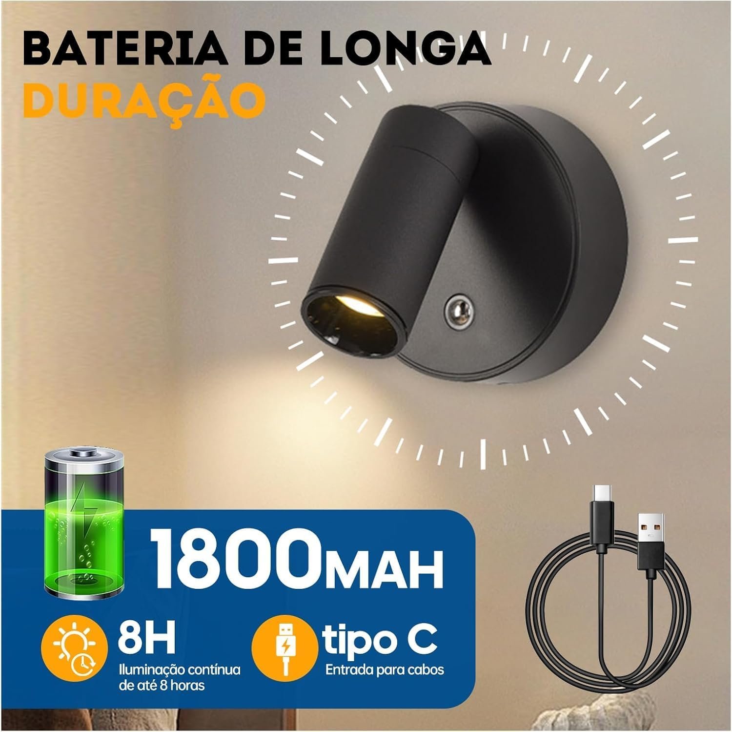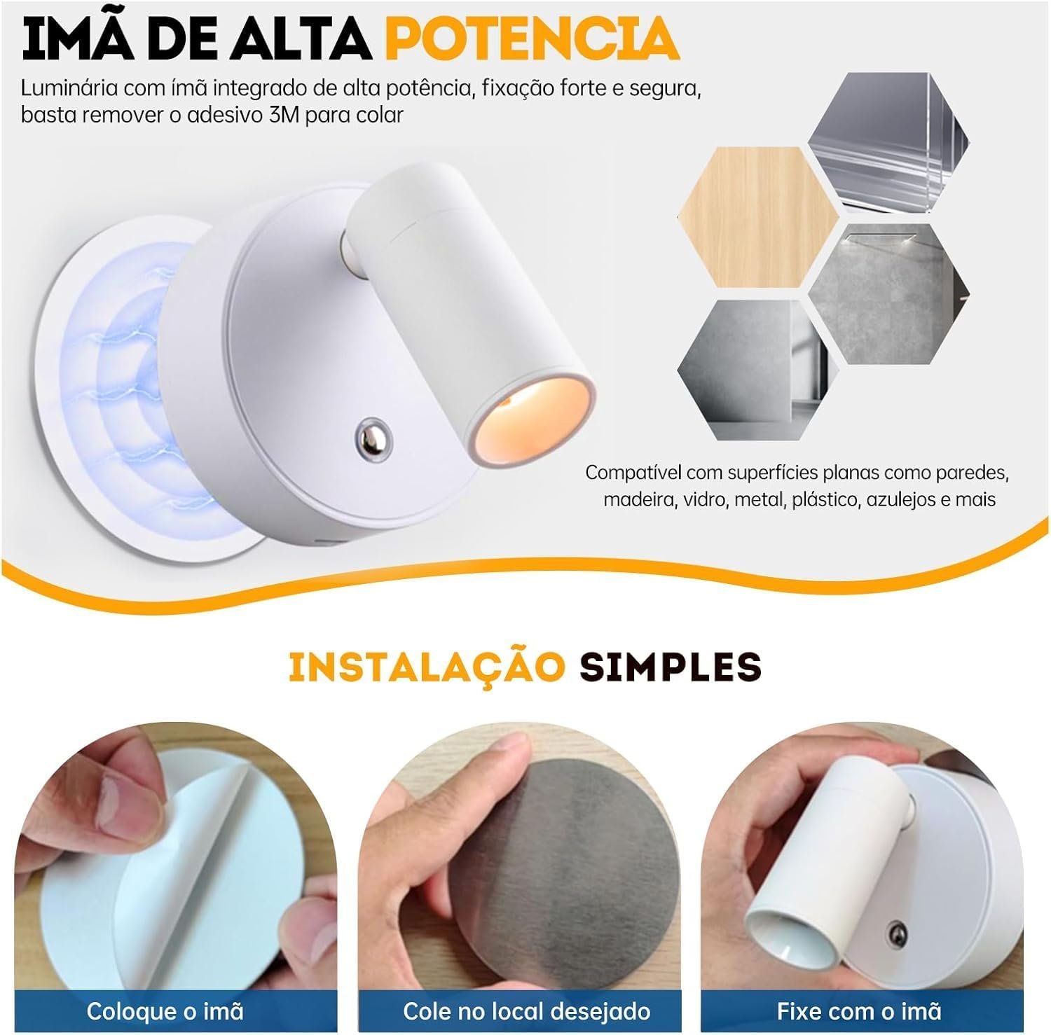 Luminária LED Recarregável Sem Fio USB‑C 3 Níveis Toque Rotação 360° Ímã Forte Abajur/Arandela Parede Cabeceira (BRANCO)