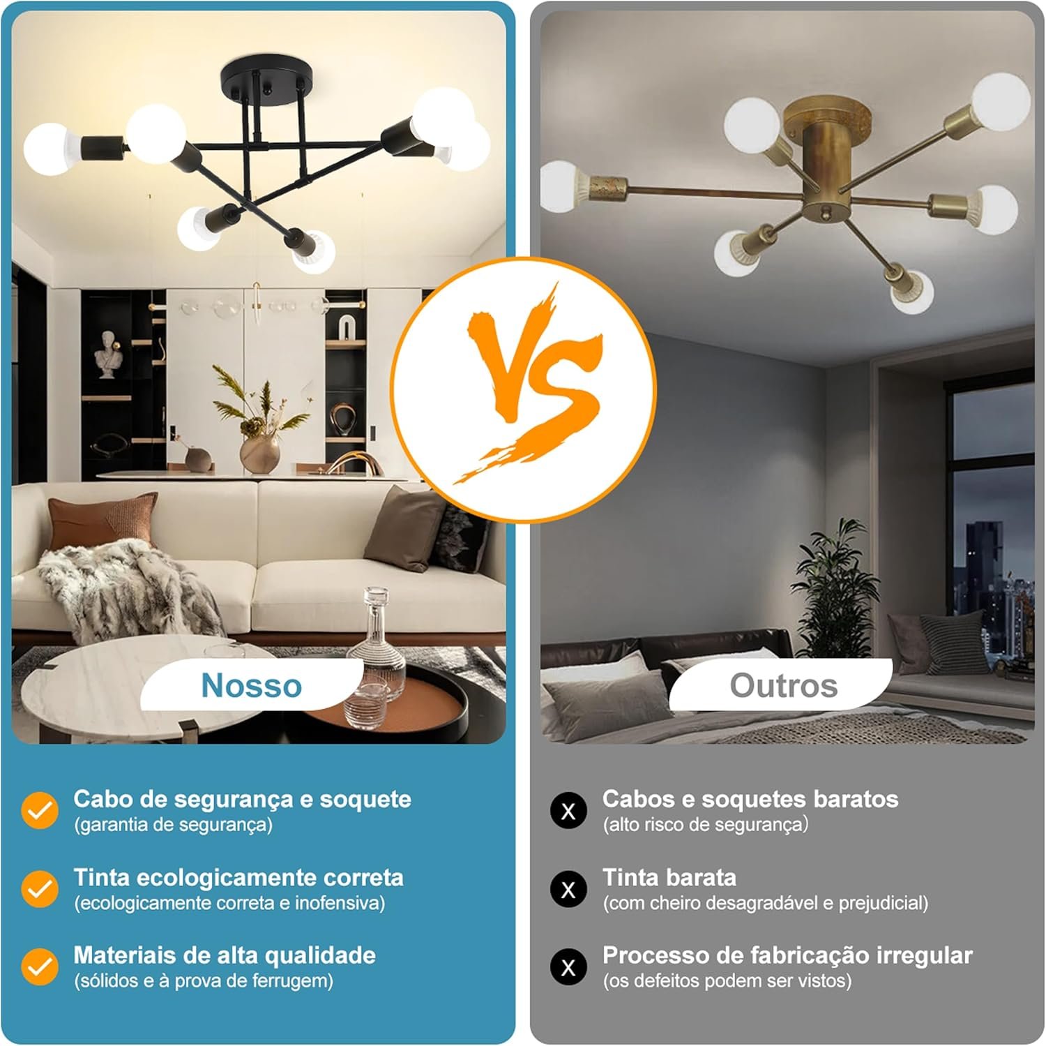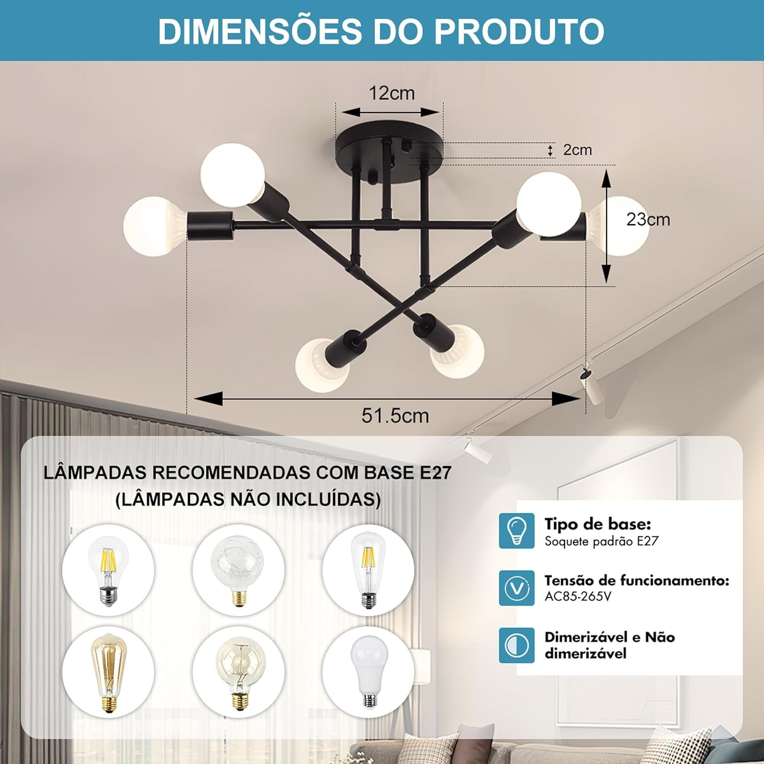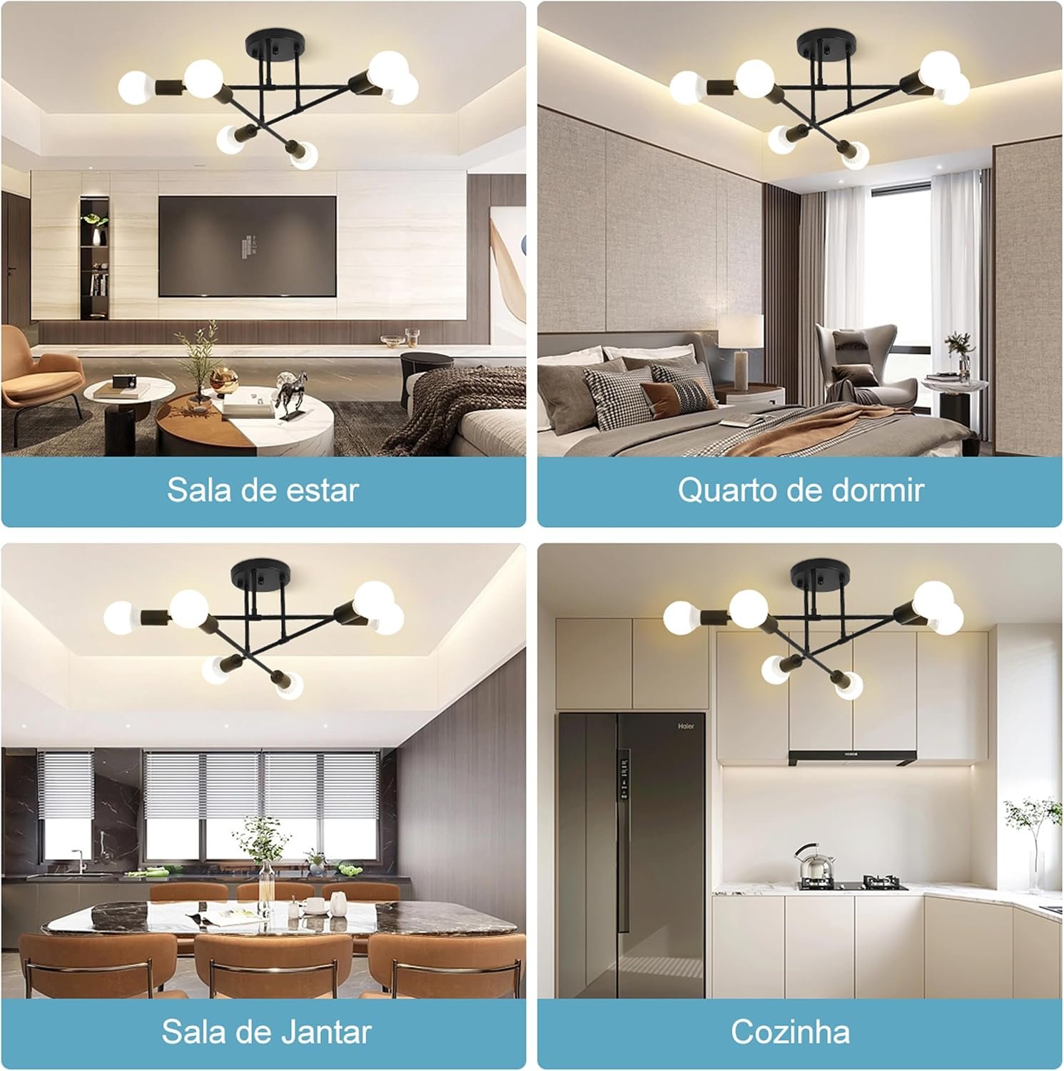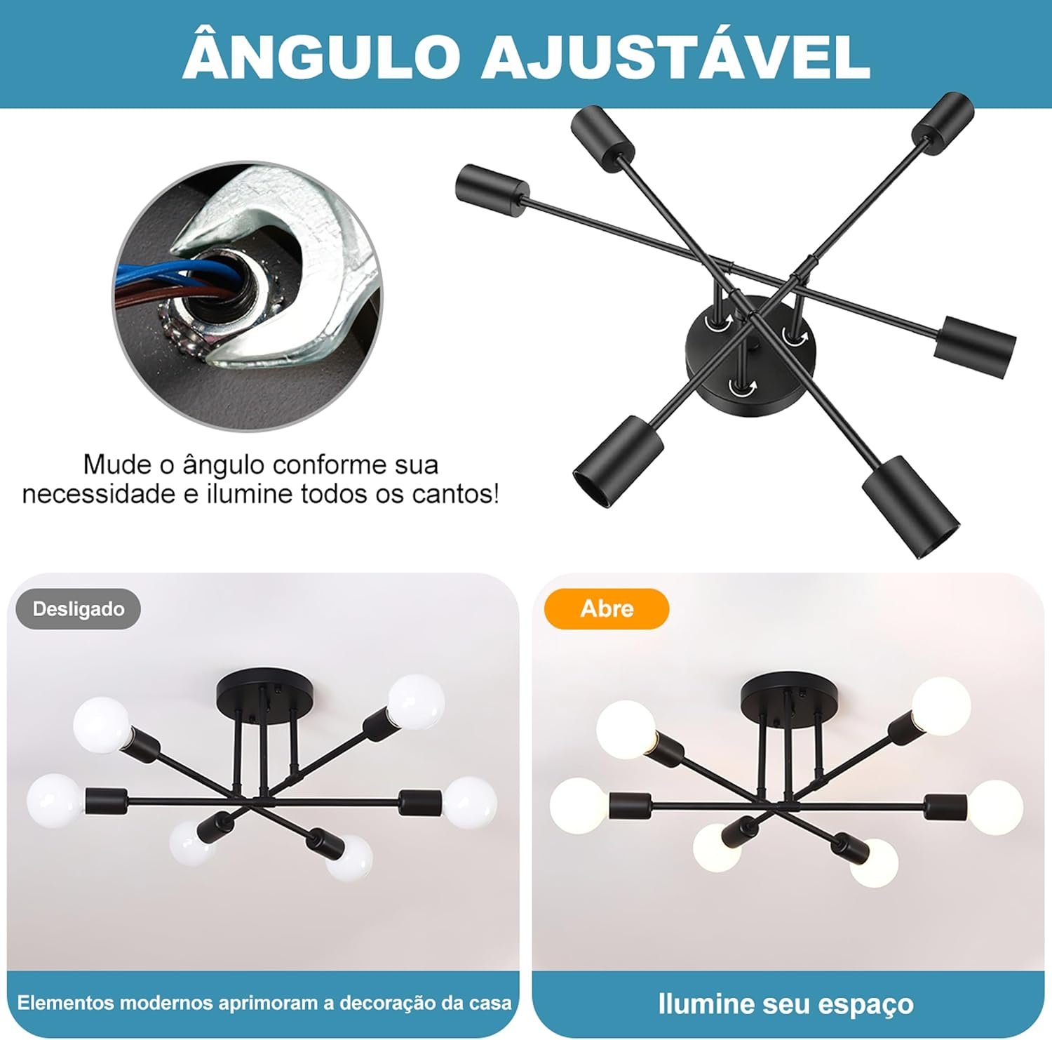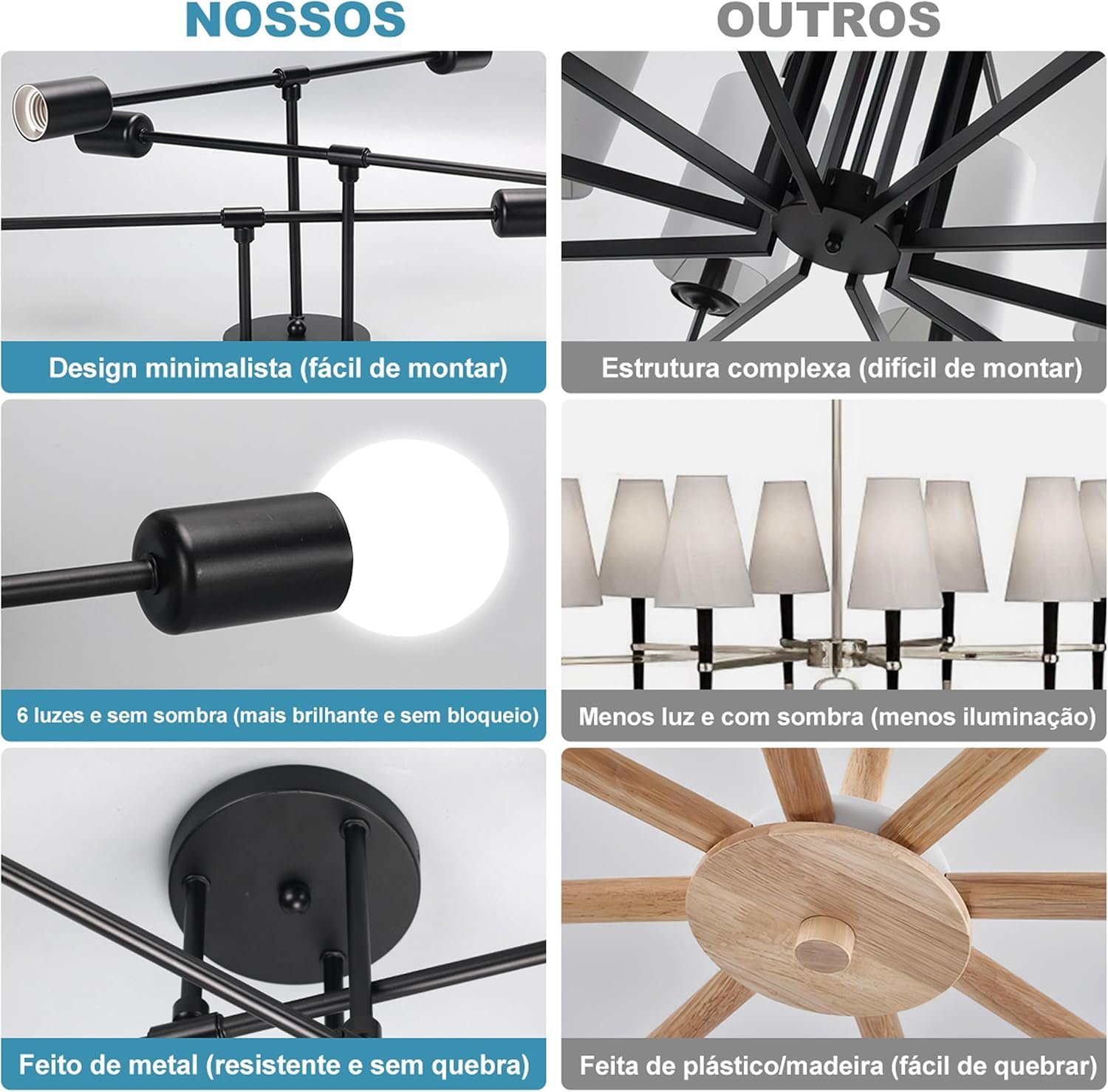 Luminária Pendente Preta Com 6 Cabeças, Pendente Luminária De Teto Regulável, Luminária Pendente Para Cozinha, Quarto, Sala De Estar (Lâmpada Não Incluída)