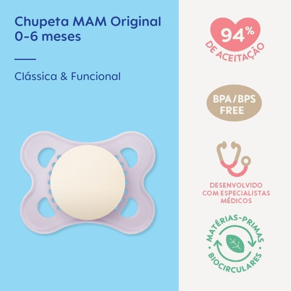MAM Baby 1 Chupeta Original Com Bico Simétrico de Silicone SkinSoft para Crianças 0-6 Meses Embalagem Blister, Lilás