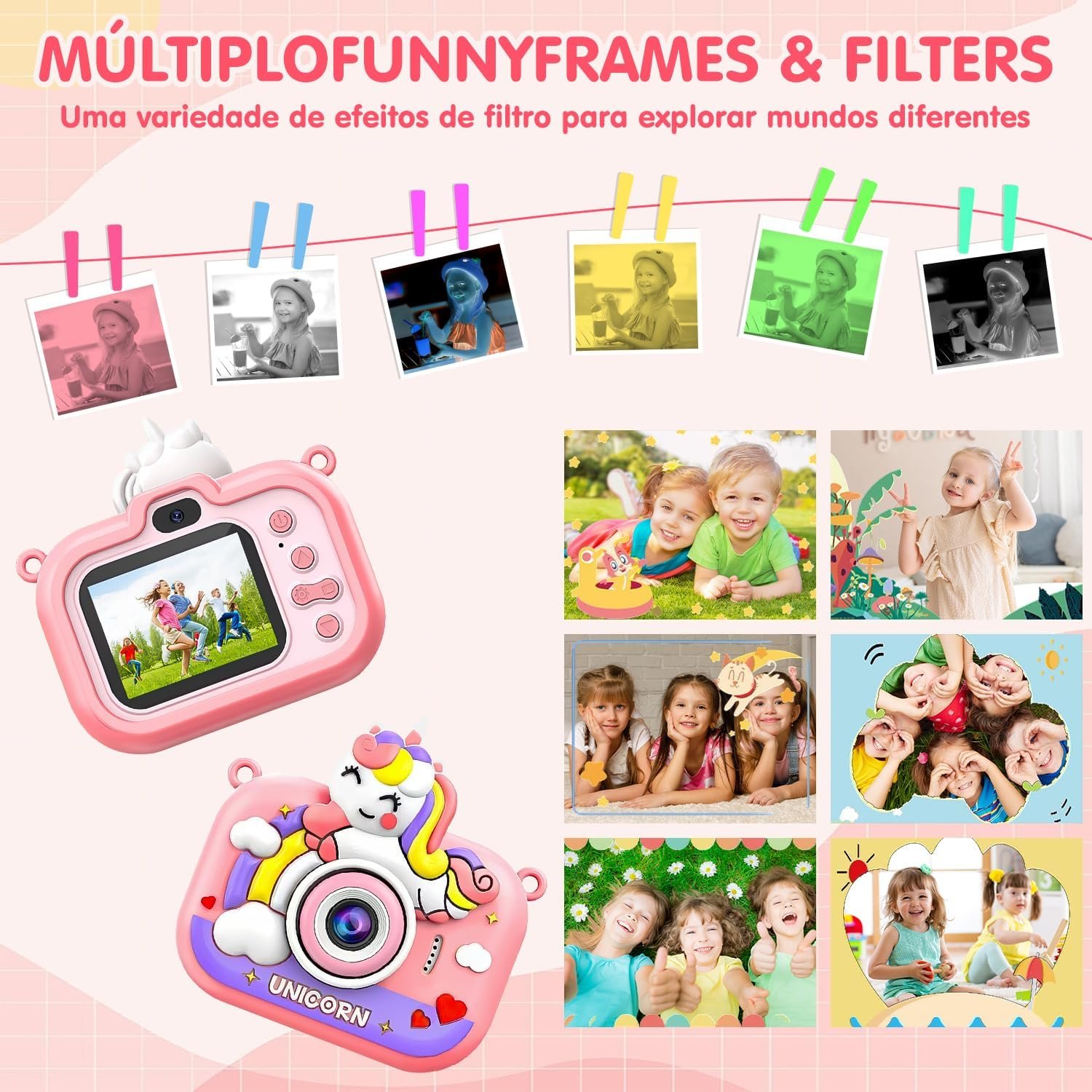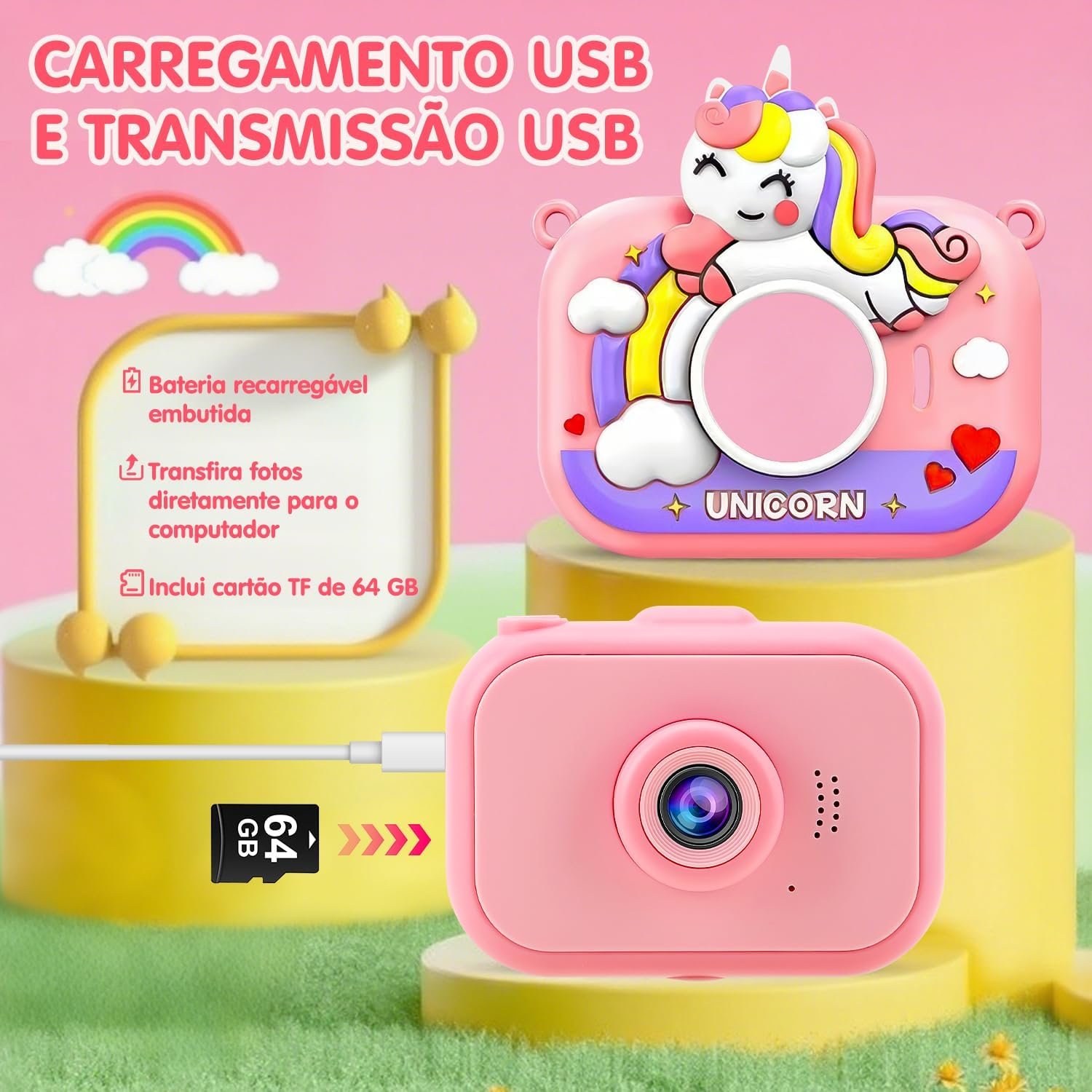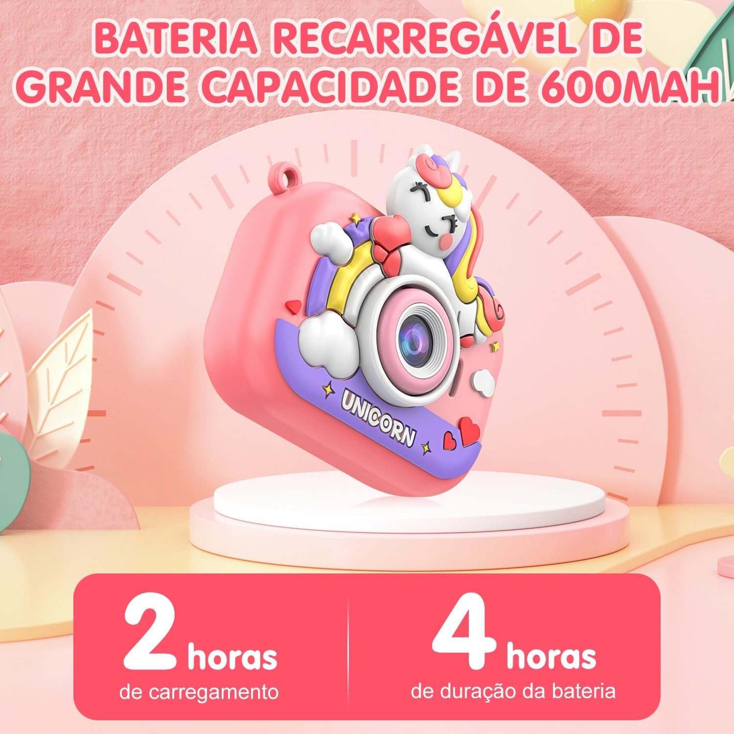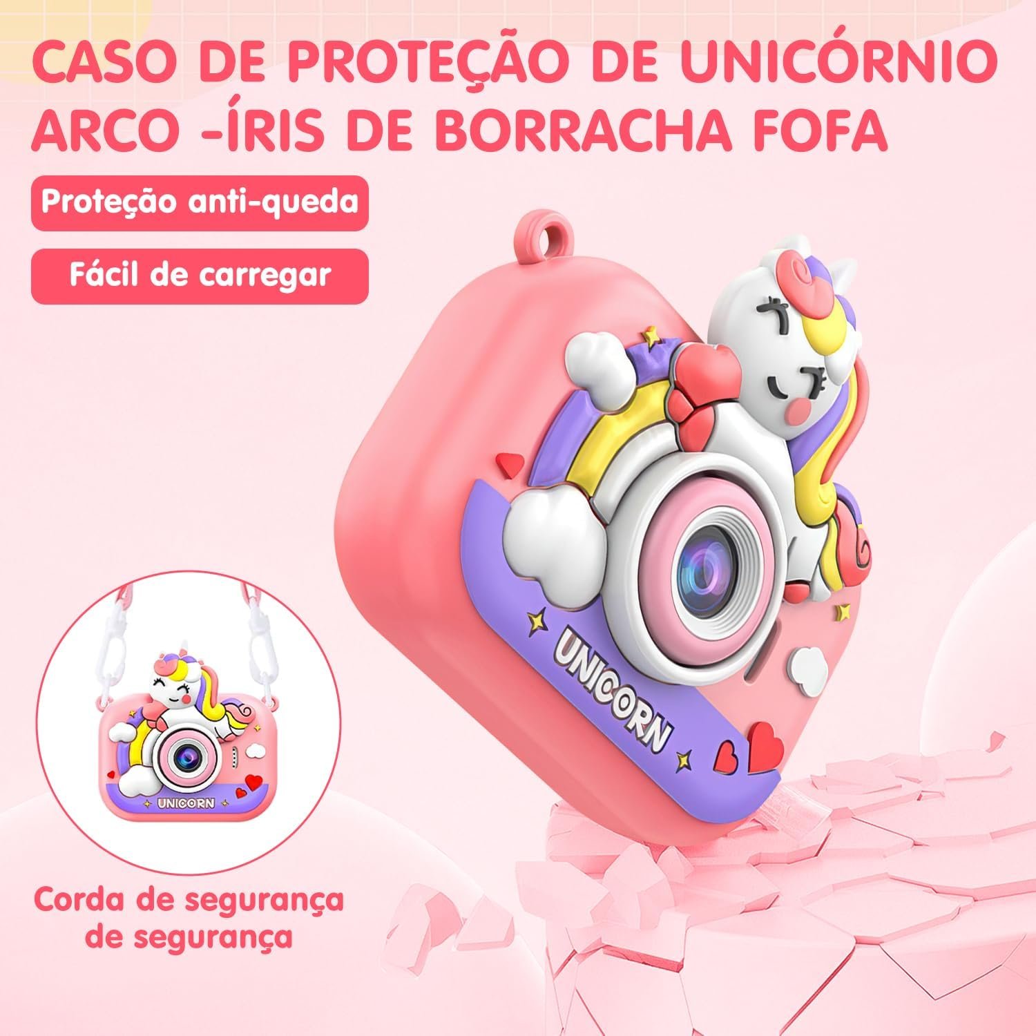 Descrição: Capture momentos inesquecíveis com a Máquina Fotográfica Infantil Selfie Câmera Digital. Ideal como presente para meninas de 3 a 12 anos, possui 96 MP para fotos de alta qualidade, tela IPS de 2″ para visualização em HD, bateria de 600mAh e jogos divertidos para entretenimento. Inclui um cartão de memória de 64GB para armazenar todas as recordações. Leve, portátil e com um design encantador de Unicórnio Rosa.