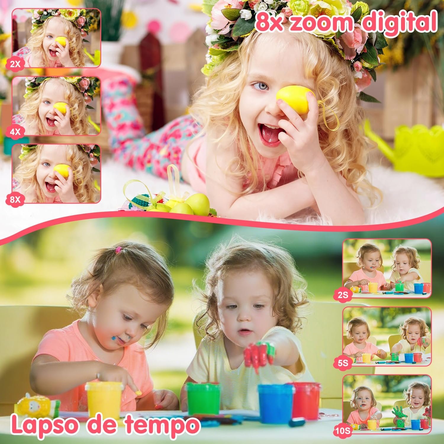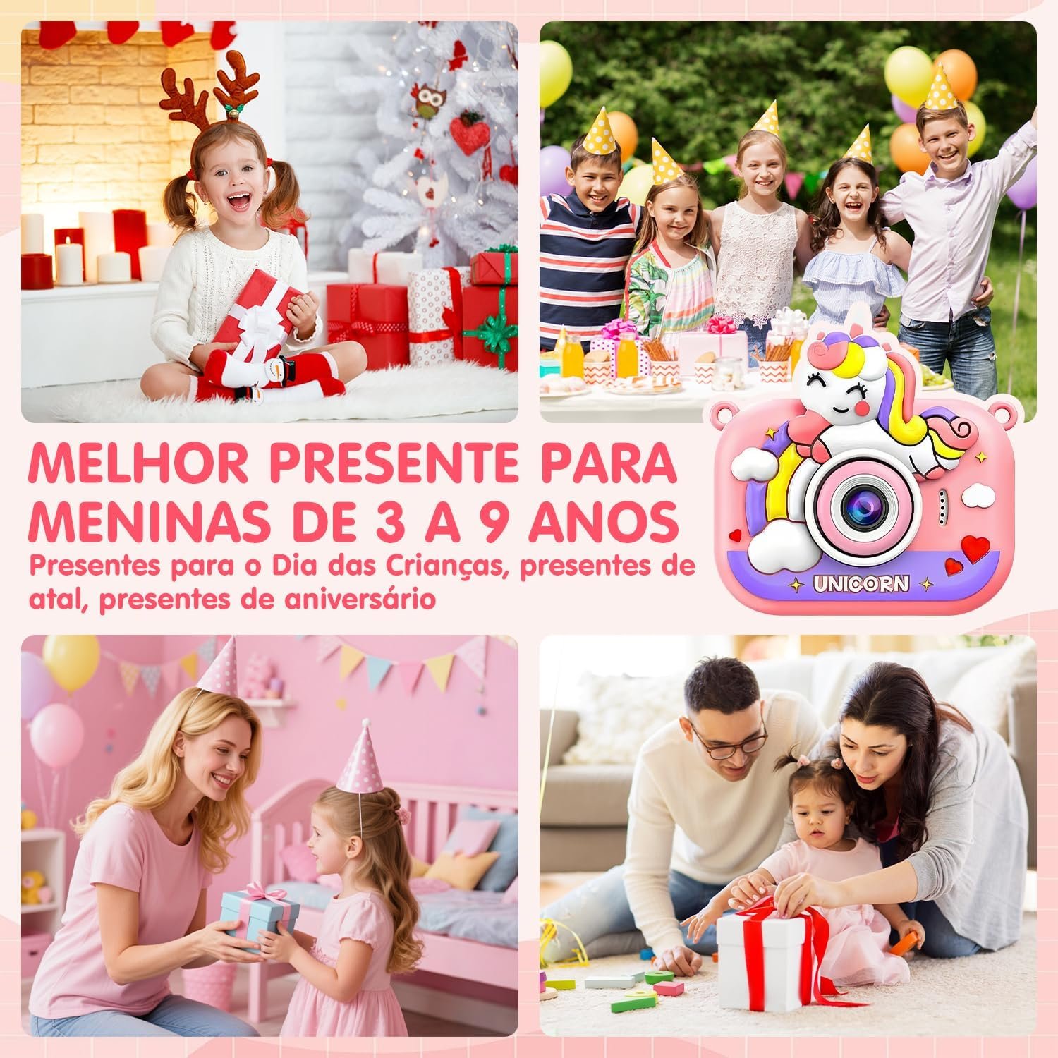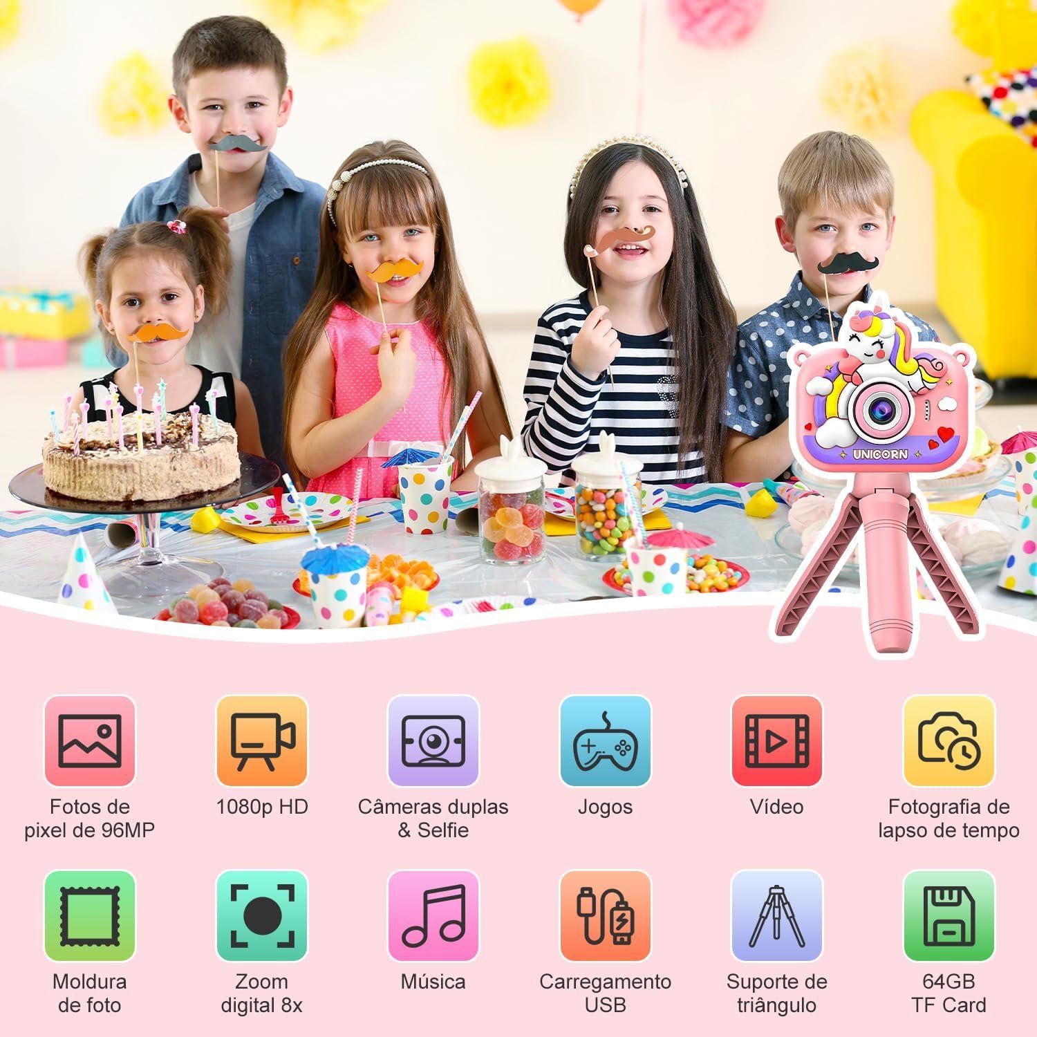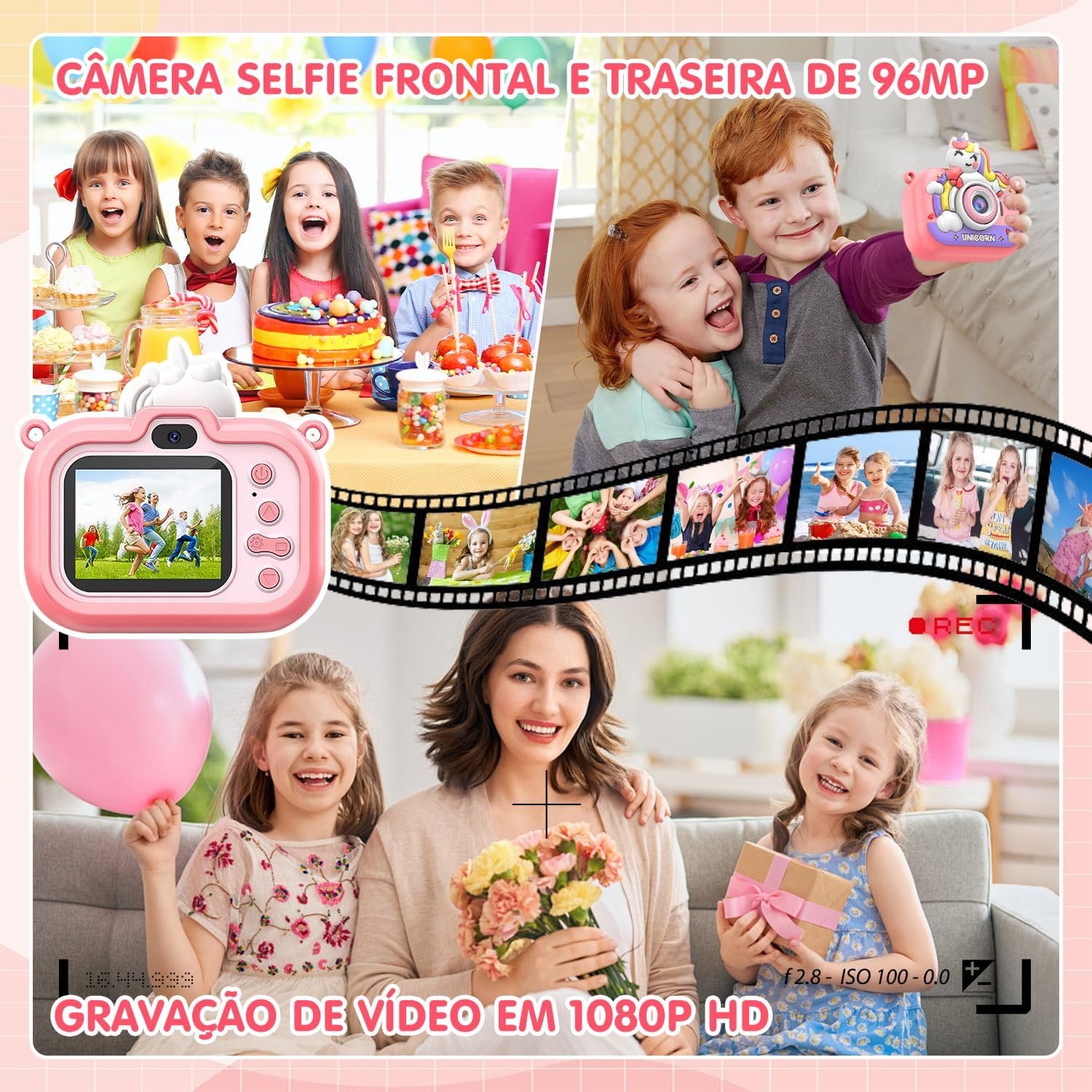 Máquina Fotográfica Infantil Selfie Câmera Digital, Presentes Brinquedo Menina de 3 a 12 anos, 96 MP, Pantalla 2″ IPS 1080P HD, 600mAh com Jogos Divertidos Portátil, 64 G SD (Unicórnio Rosa
