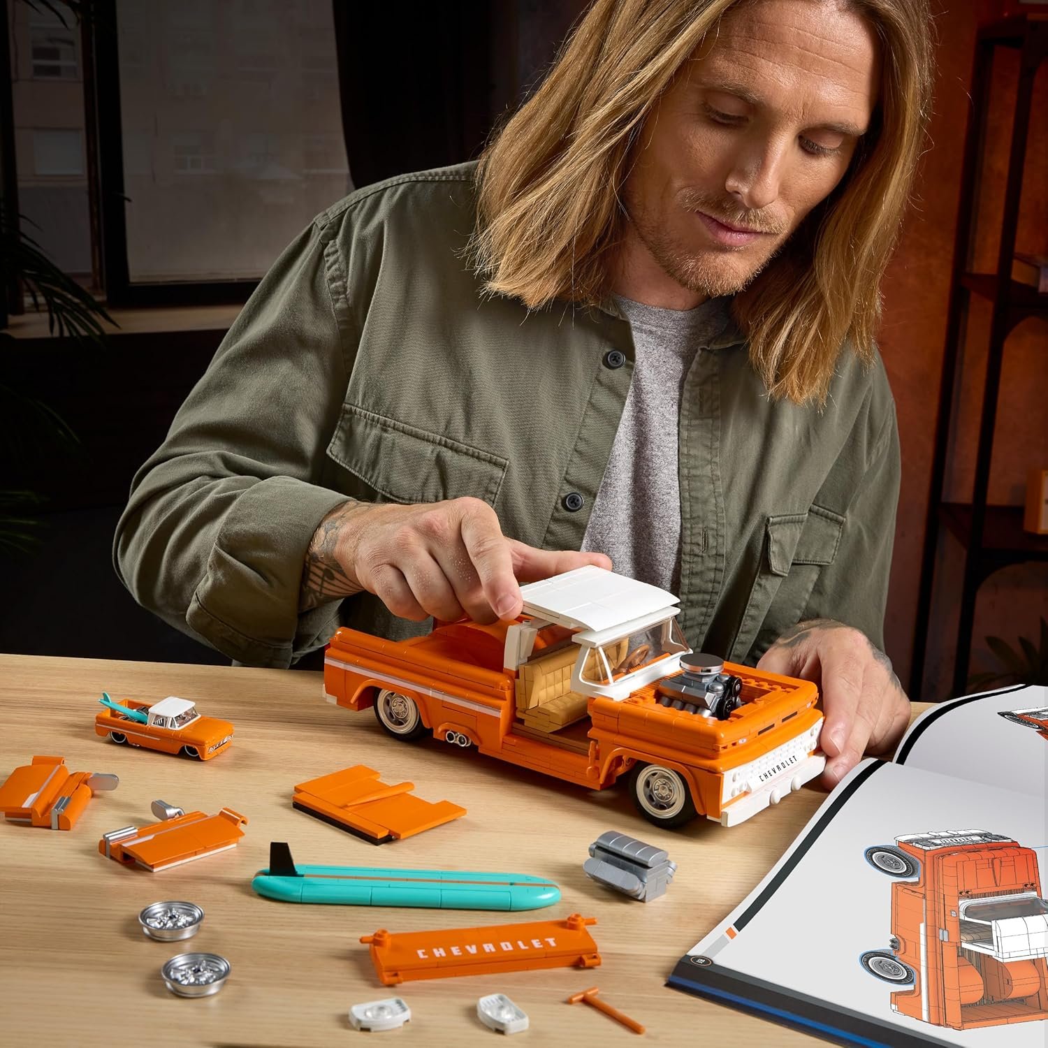 Mattel Brick Shop Hot Wheels Jogo de Construção Elite Custom Chevy Pickup em escala 1:16 com Placa de Coleção e 1 carrinho de metal Perfeito para colecionadores