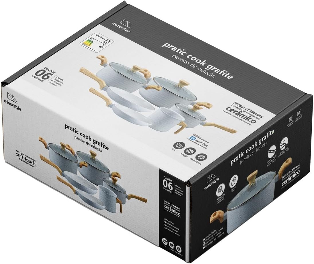 Mimo Style, Conjunto de Panelas Antiaderente com Tampa e Cabo Soft touch Pratic Cook 6 Peças – GrafiteMimo Style, Conjunto de Panelas Antiaderente com Tampa e Cabo Soft touch Pratic Cook 6 Peças – Grafite