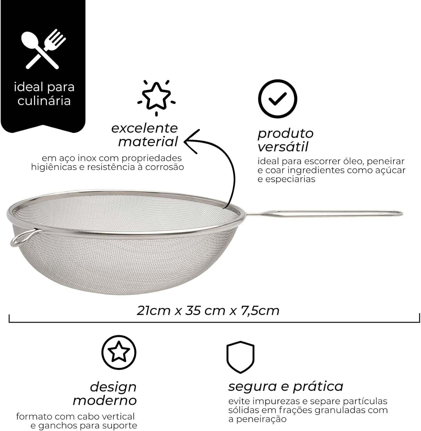 Mimo Style, Peneira em Aço Inox com Suporte para Acomodação em Panelas e Travessas — 21 cm