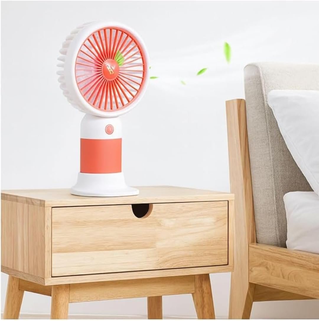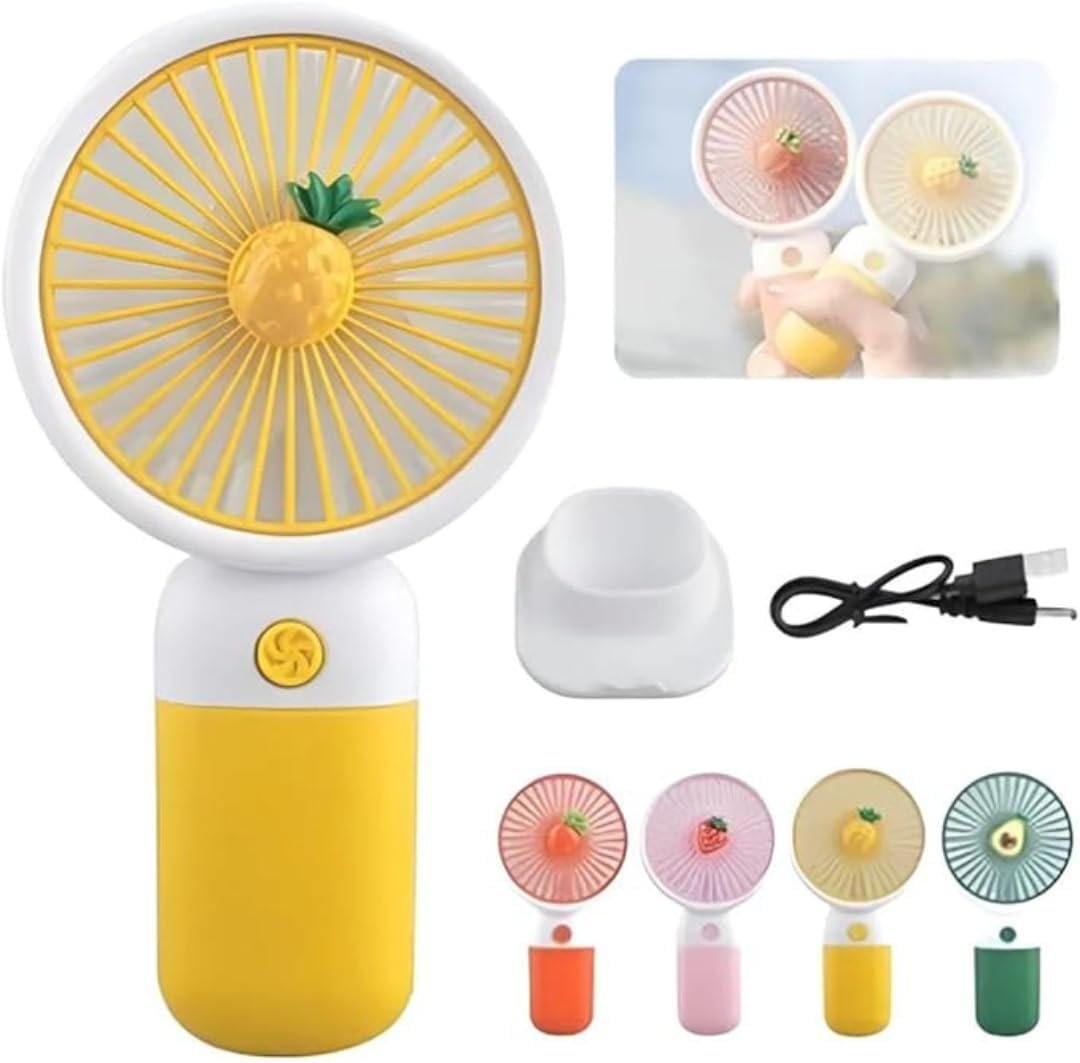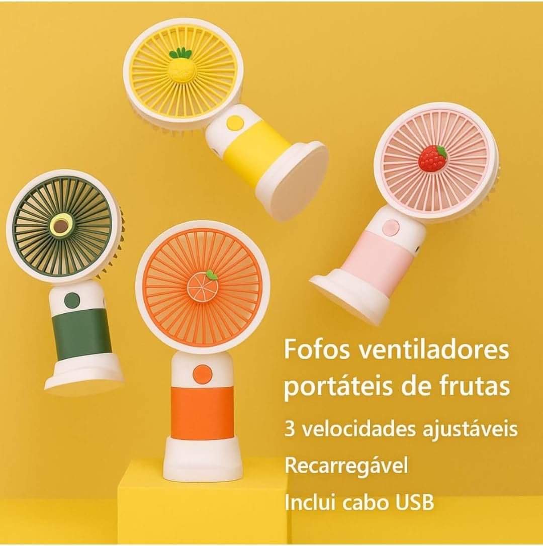 Mini Ventilador Portátil USB Recarregável, Design de Frutas, 3 Velocidades, 15 x 8 cm, com Cabo USB, Base Removível, Bateria Recarregável, para Casa e Escritório