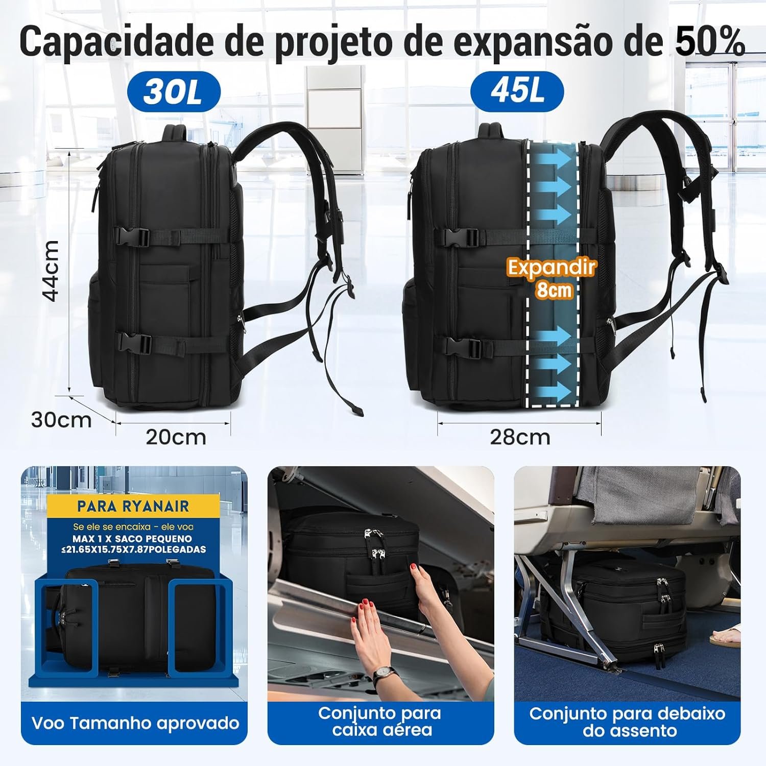 Mochila de Viagem Expansivel Grande Masculina Feminina,Mochila Avião Notebook Bolsa de Sapato,Executiva,Antifurto,Reforçada,USB,Impermeável,Escolar,Faculdade,Trabalho,Presente