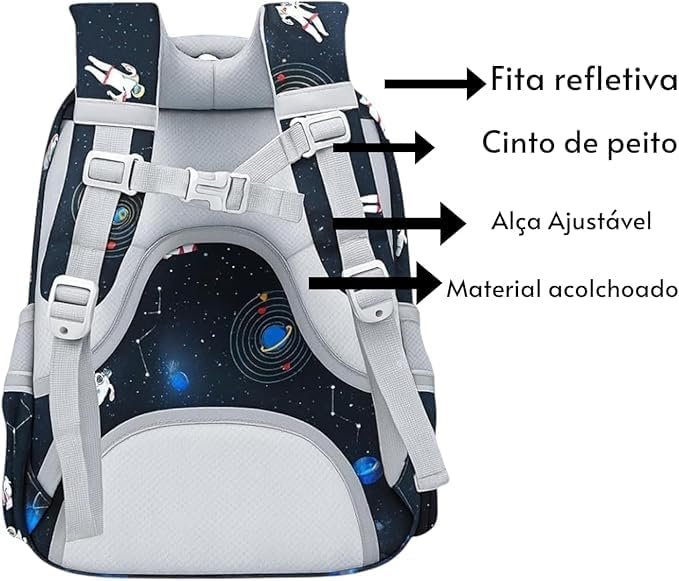 Mochila Escolar Infantil Astronauta, Ortopédica, Acolchoada, Reforçada, para Meninos 7-12 Anos, Design Espacial