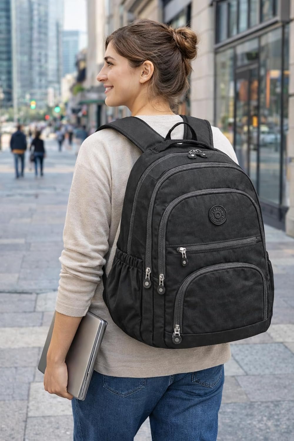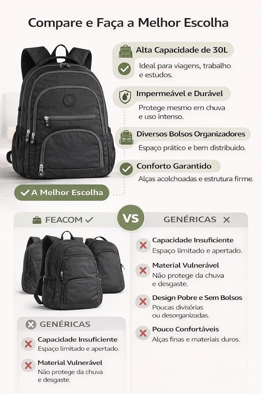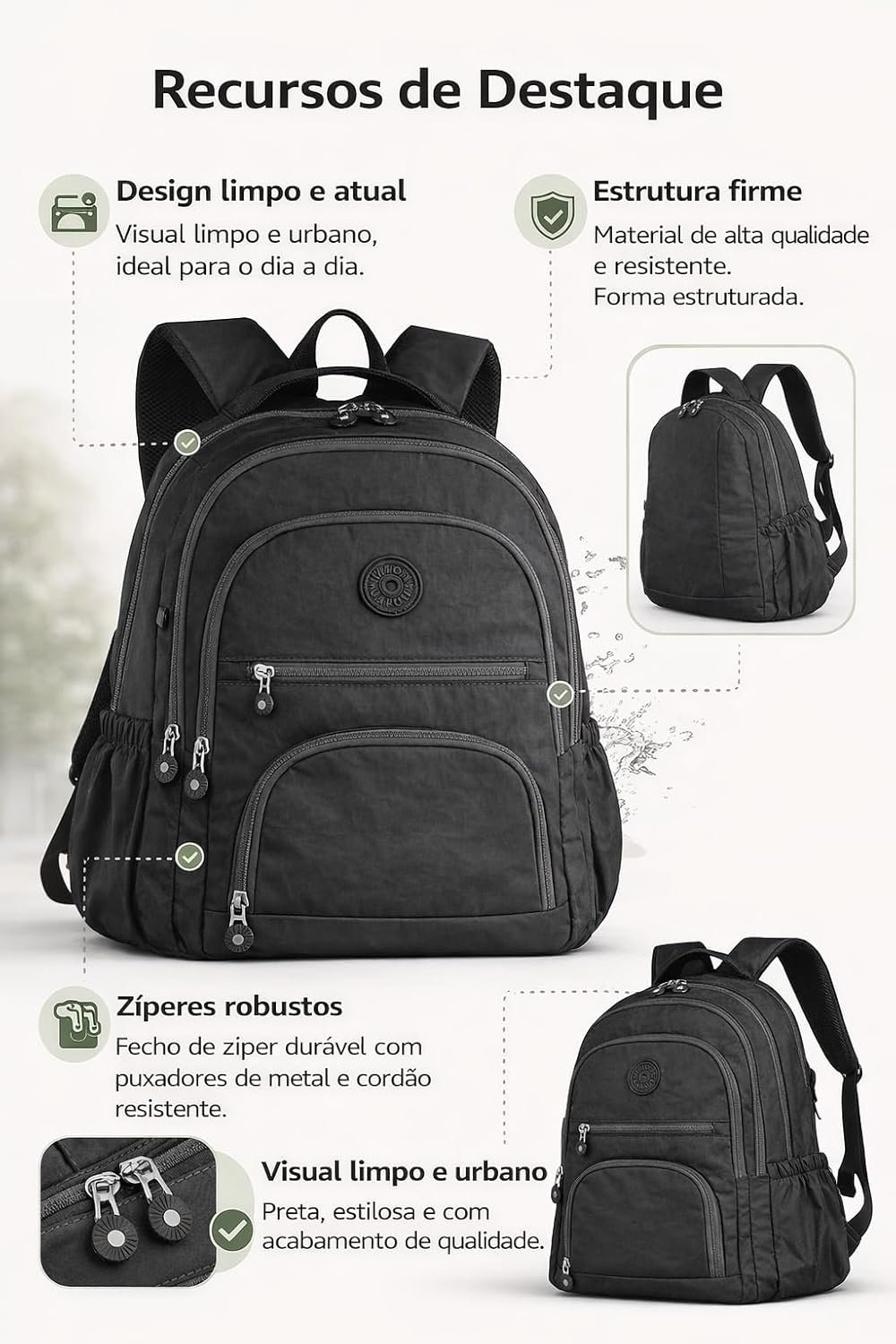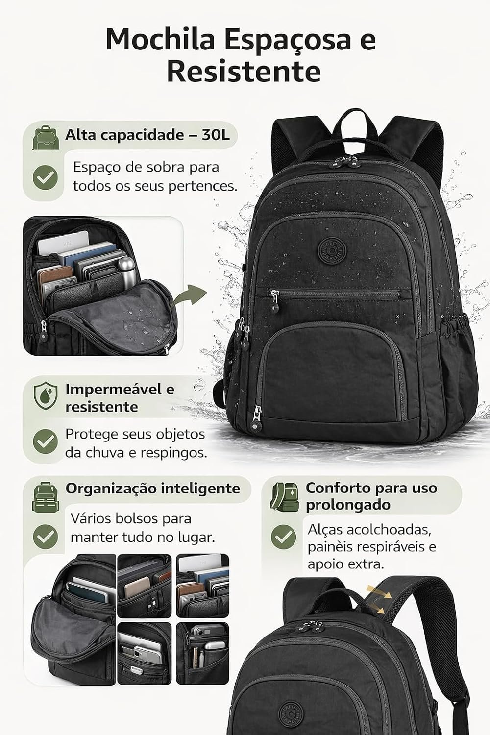 Mochila Grande 30L Nylon Impermeável Feminina Masculina Escolar Juvenil Notebook 15″ — Mochila Preta Resistente com Múltiplos Bolsos, Leve, Casual e Reforçada para Escola e ViagensMochila Grande 30L Nylon Impermeável Feminina Masculina Escolar Juvenil Notebook 15″ — Mochila Preta Resistente com Múltiplos Bolsos, Leve, Casual e Reforçada para Escola e Viagens