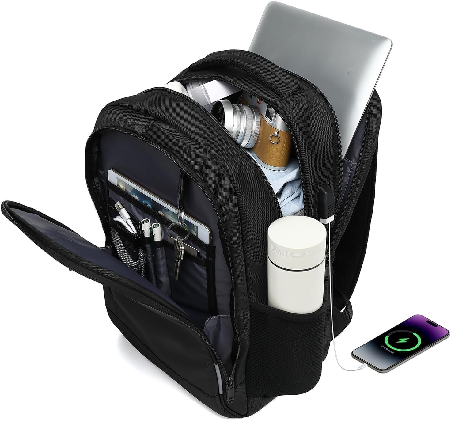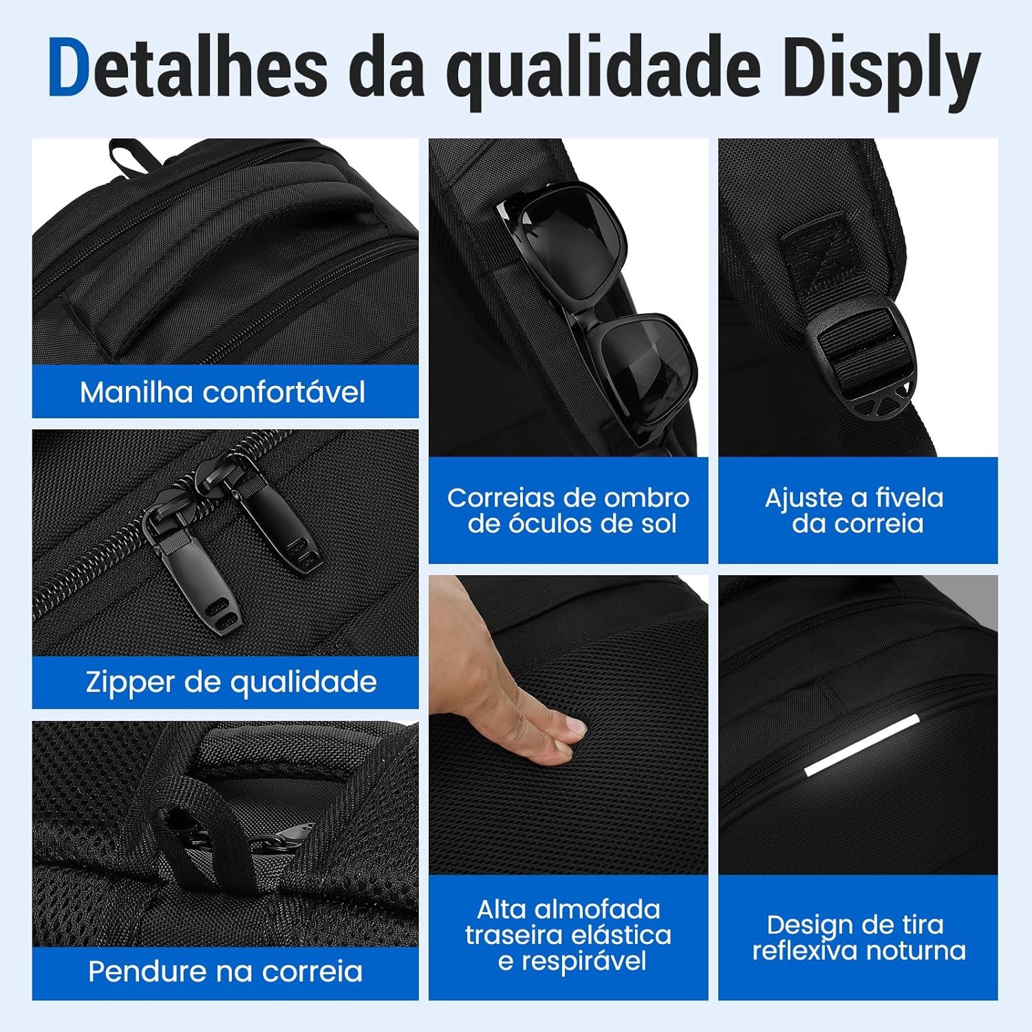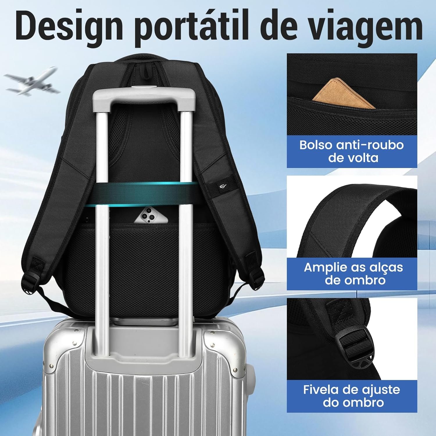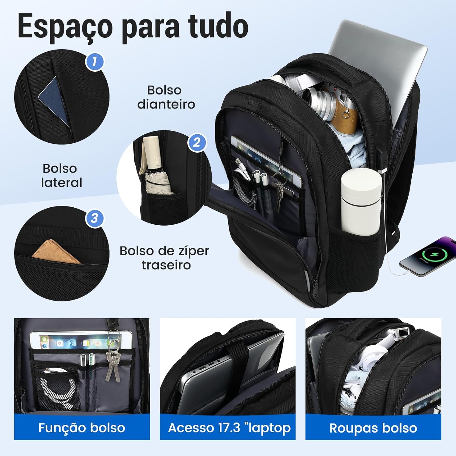 Além disso, possui design reforçado, saídas USB integradas para carregamento prático, material impermeável para proteger seus pertences em dias chuvosos e amplo espaço interno para organizar seus itens com facilidade.