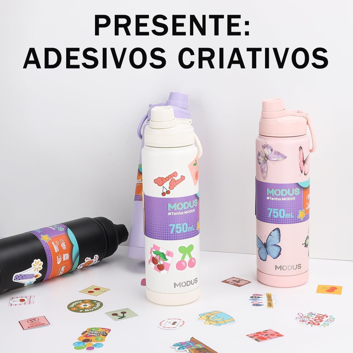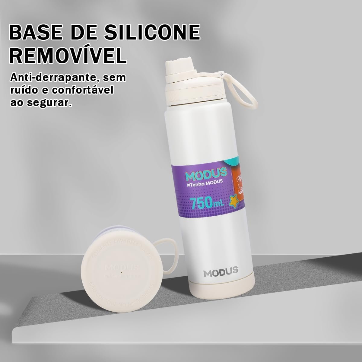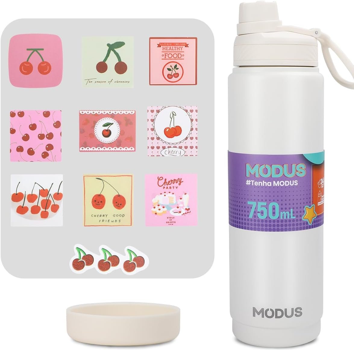 MODUS Garrafa Térmica em Aço Inoxidável 750mL com Base Emborrachada Anti Derrapante, Alça e Adesivos (Branco)