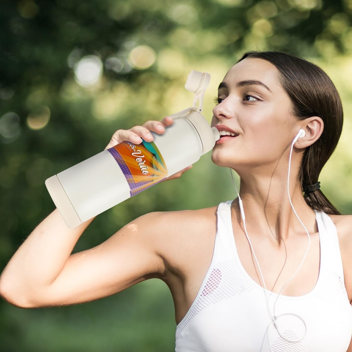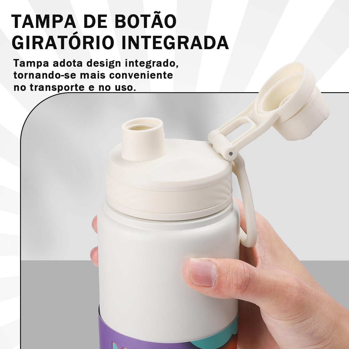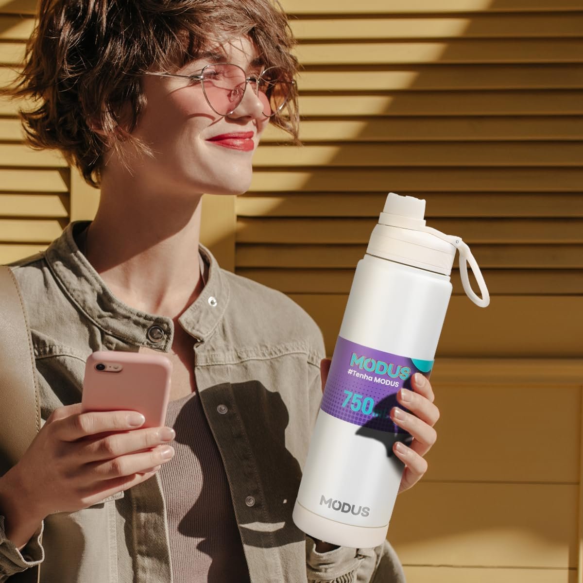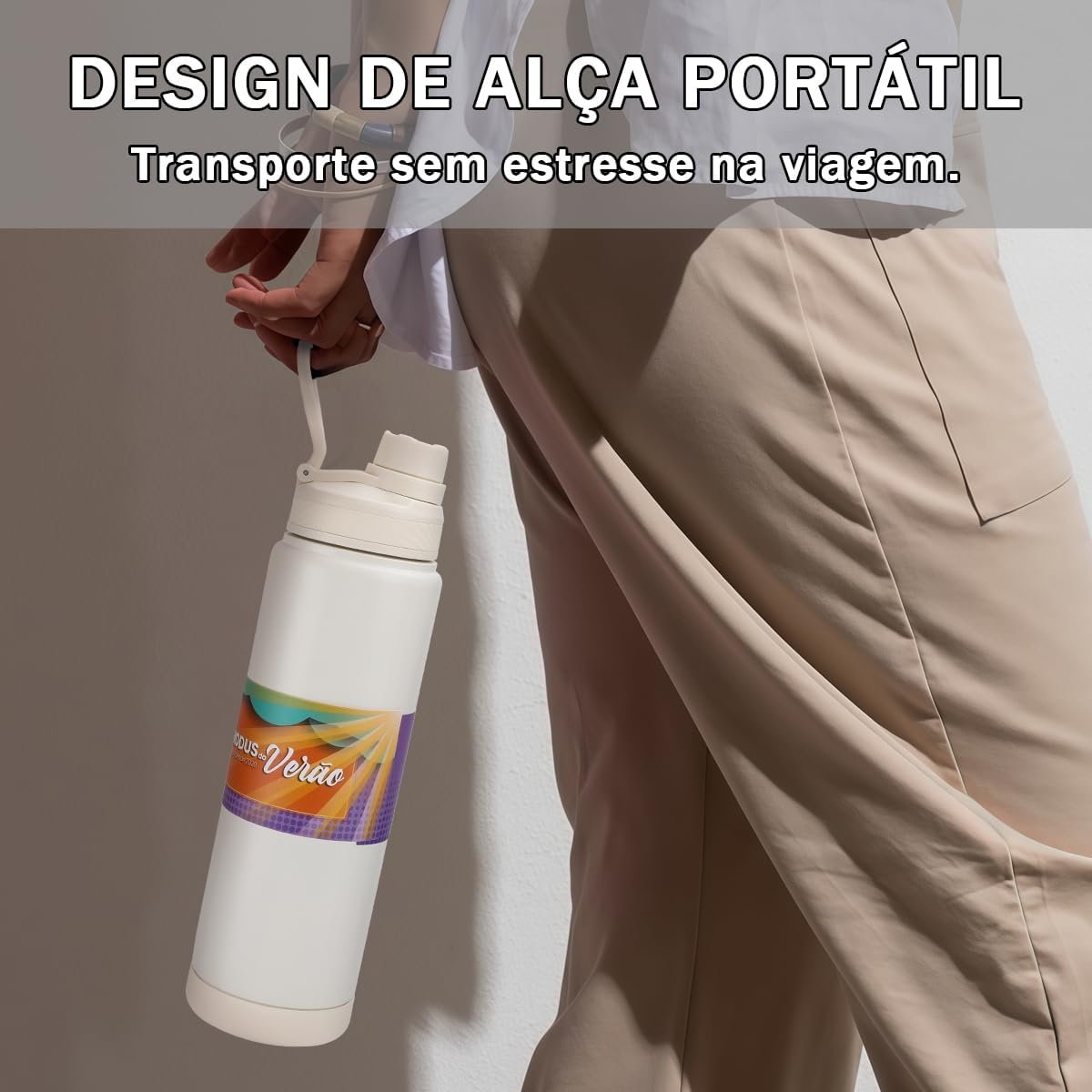 MODUS Garrafa Térmica em Aço Inoxidável 750mL com Base Emborrachada Anti Derrapante, Alça e Adesivos (Branco)