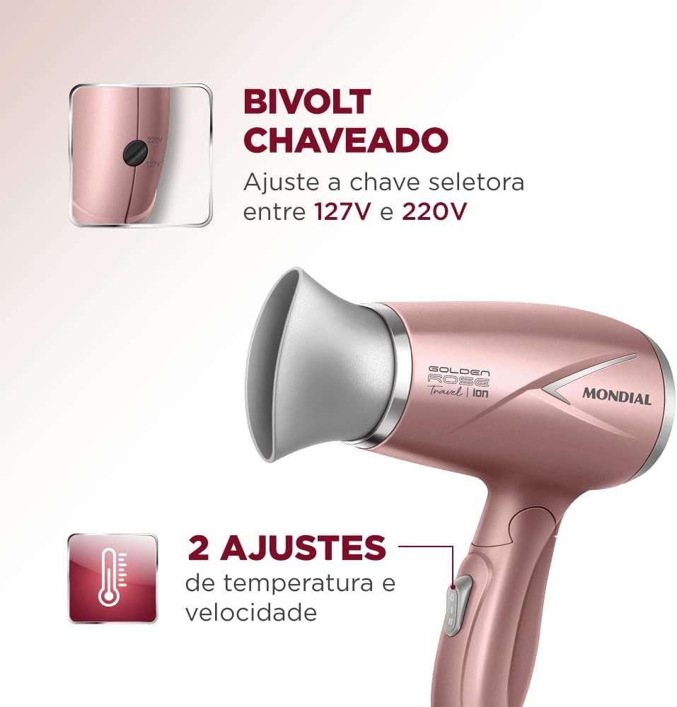 Prepare-se para ter cabelos sempre lindos e secos em qualquer lugar com o Secador de Cabelos Travel Mondial. Com design elegante Golden Rose, potência de 1200W e versatilidade bivolt, este secador é o companheiro ideal para suas viagens. Leve, compacto e eficiente, você terá o cuidado que seus cabelos merecem em todos os momentos. Adquira já o seu e desfrute de praticidade e estilo incomparáveis!