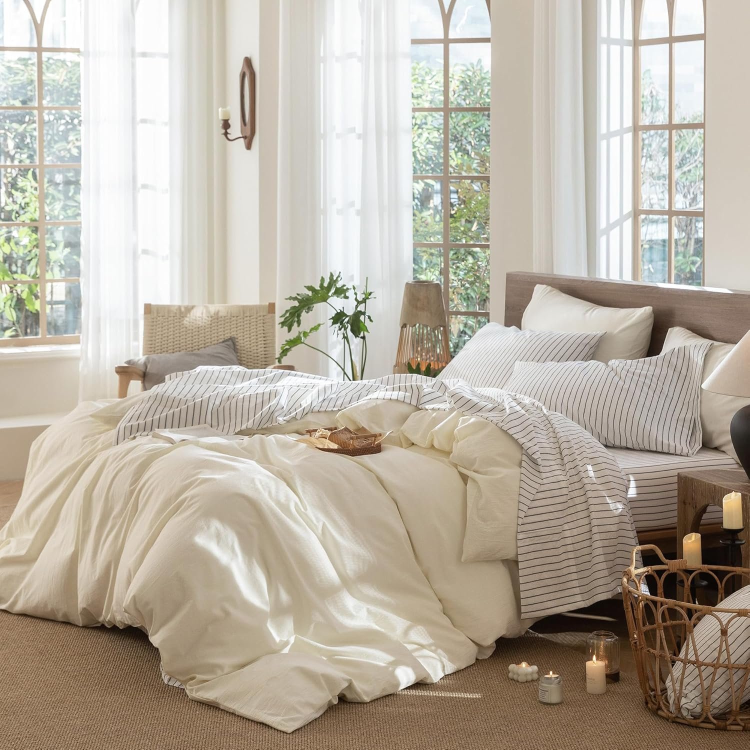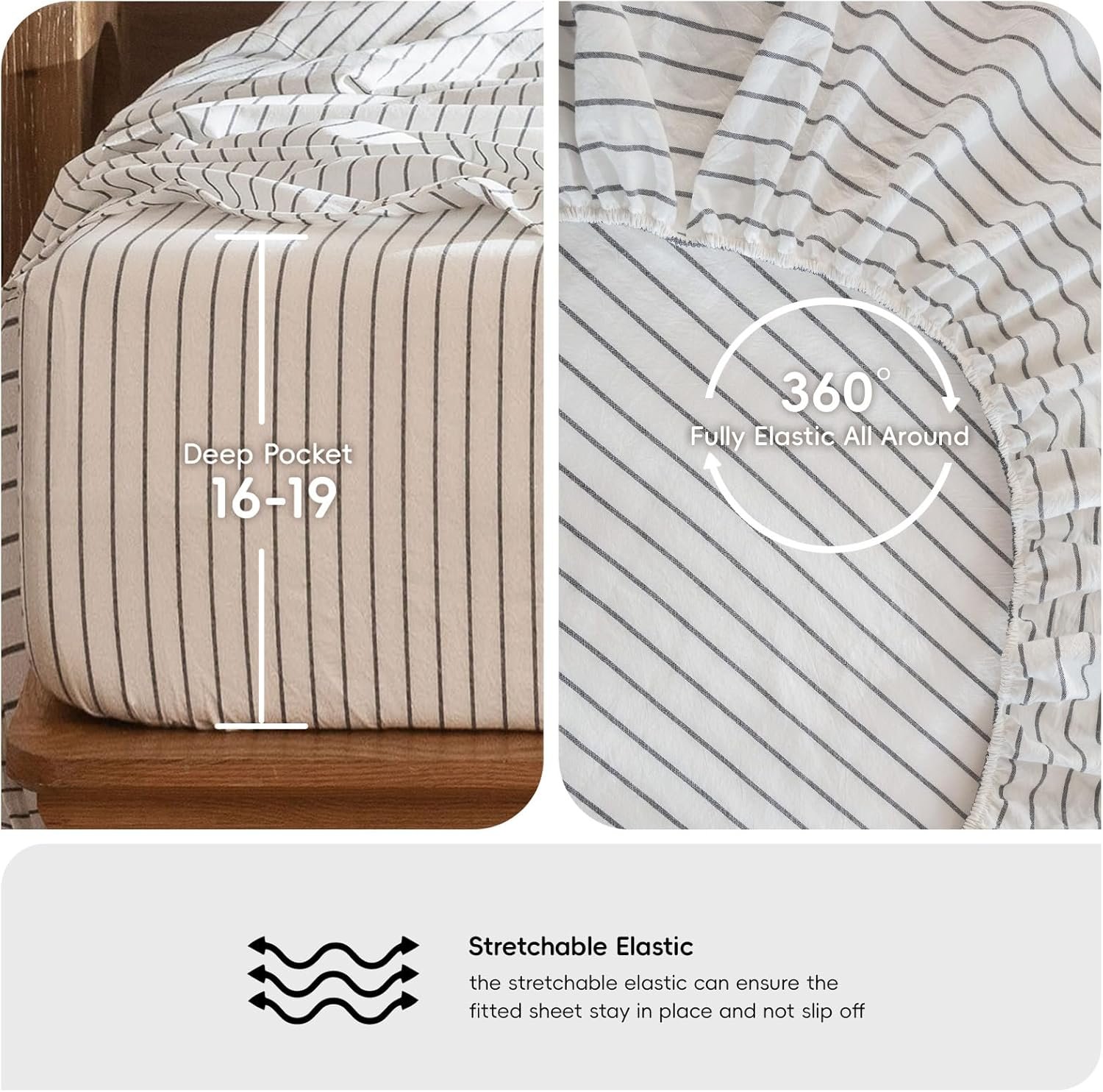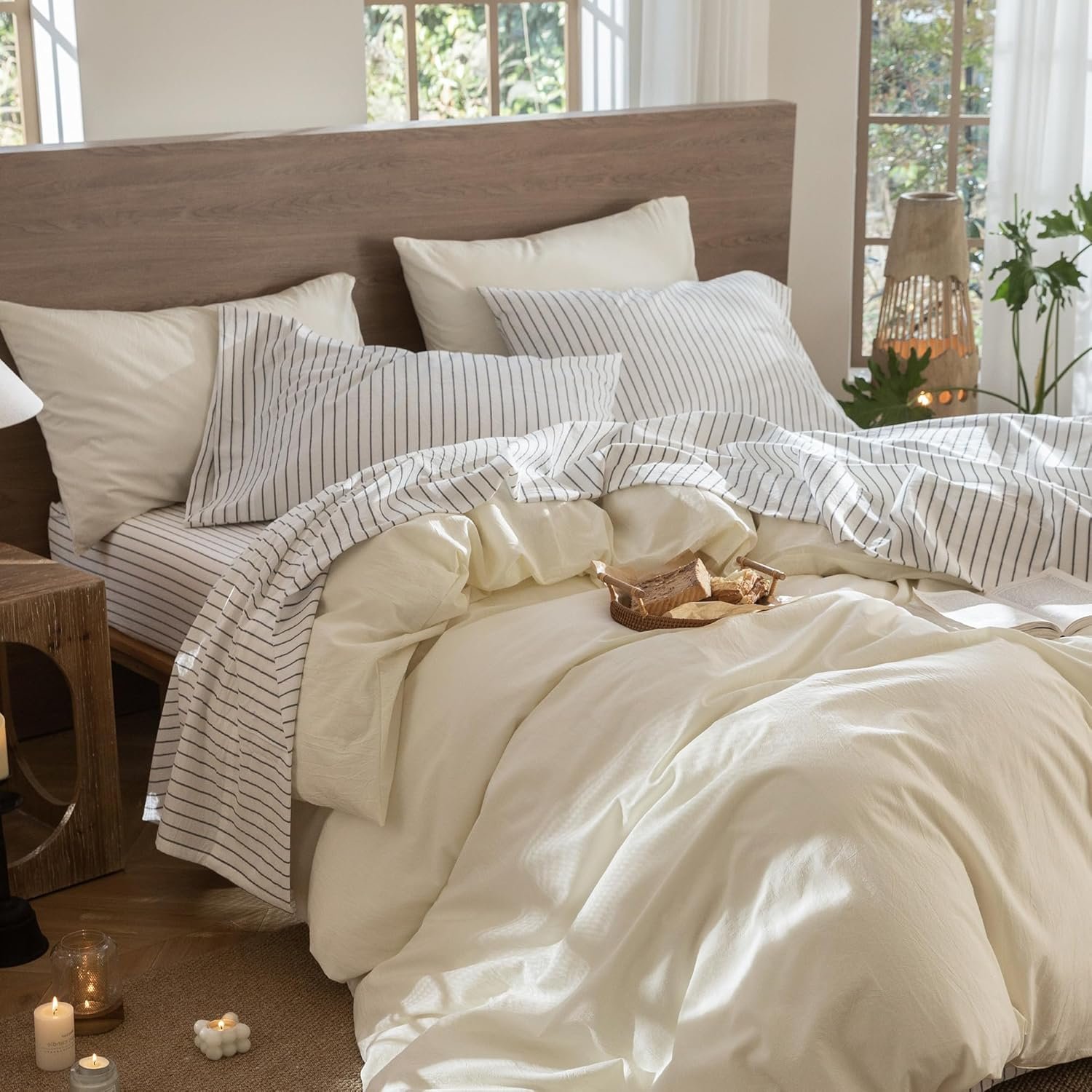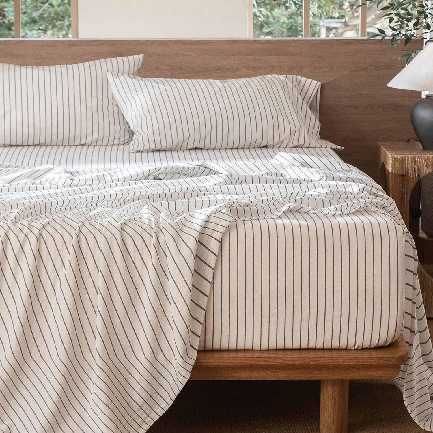 MooMee Jogo de lençol listrado 100% algodão lavado como linho texturizado respirável durável macio confortável (branco cinza escuro listras largas, California King)