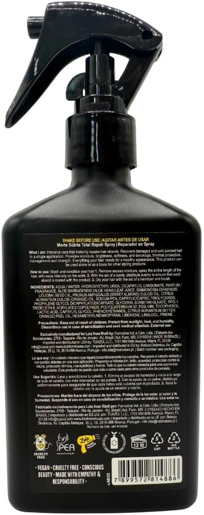 Descrição Curta: Transforme seus cabelos instantaneamente com o Morte Súbita Spray Reparação Total da Lola Cosmetics. Fórmula exclusiva que repara, nutre e protege, deixando seus fios macios, brilhantes e saudáveis. Experimente agora e surpreenda-se com os resultados!