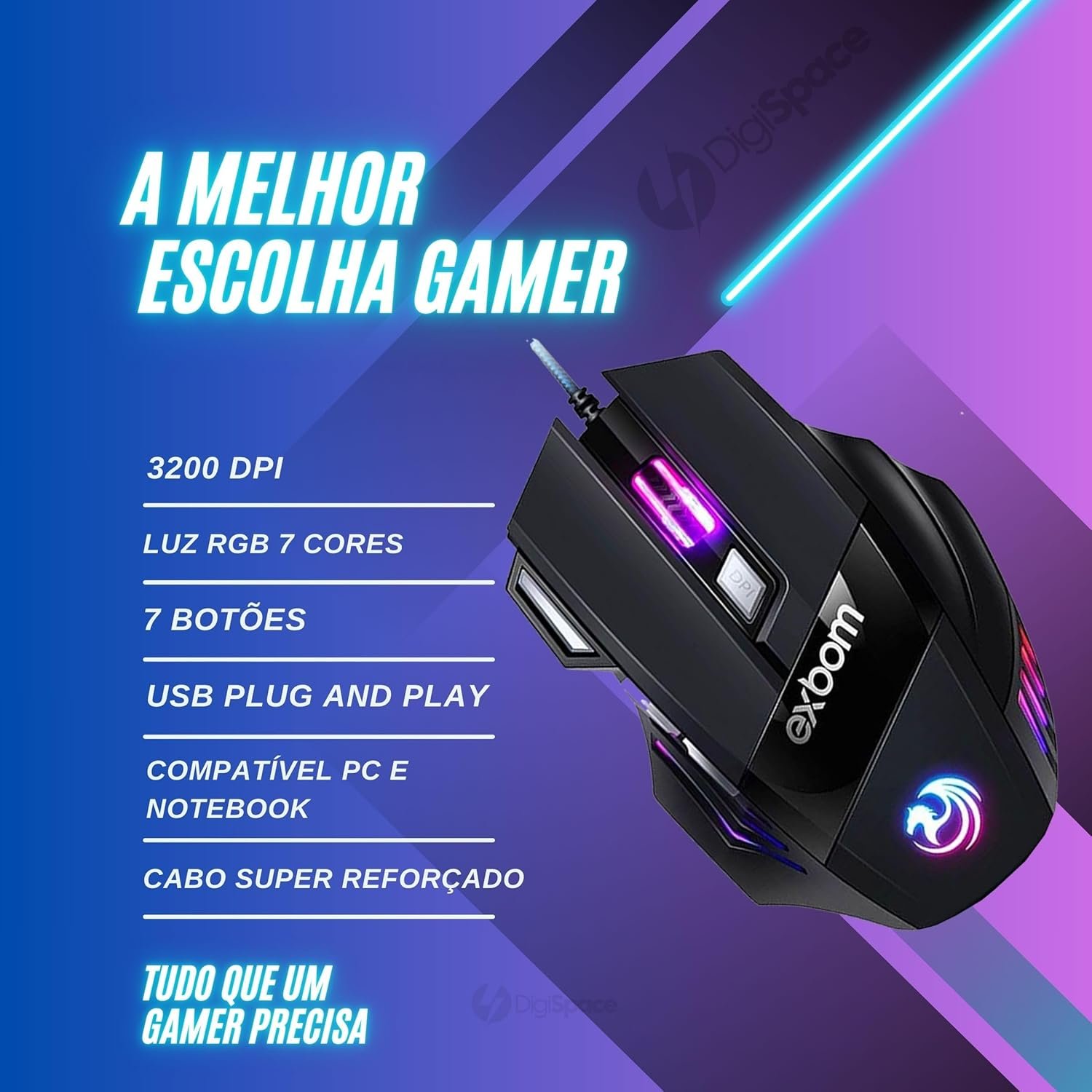 Mouse Gamer 7D 3200 DPI Ajustável 7 Botões Luzes Led RGB