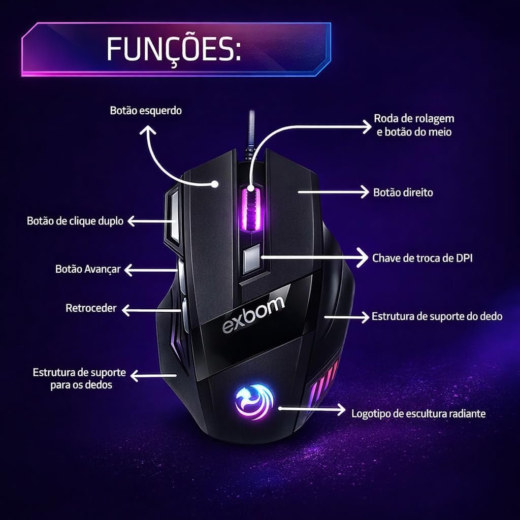 Mouse Gamer USB 7D 3200 DPI Ajustável 7 Botões Luzes LED RGB Alta Precisão e Velocidade, Jogos Games, Trabalho, Estudos, Cabo Reforçado Super Rápido Ergonômico Antideslizante Clique Duplo Premium