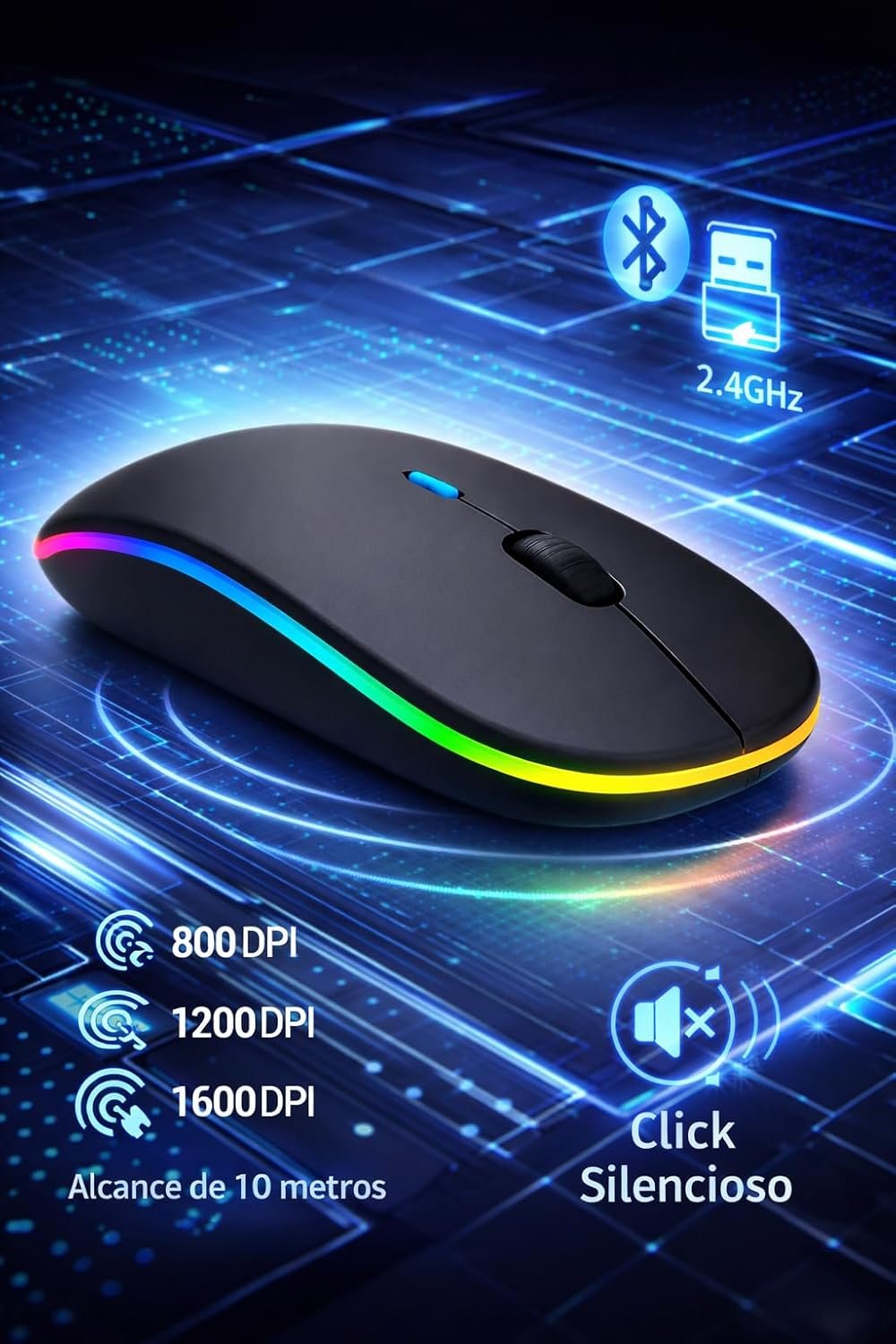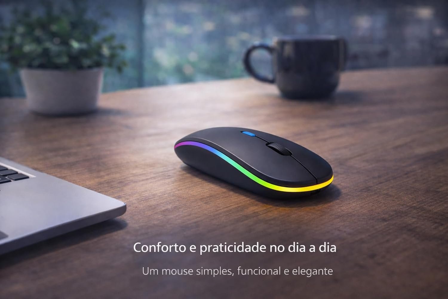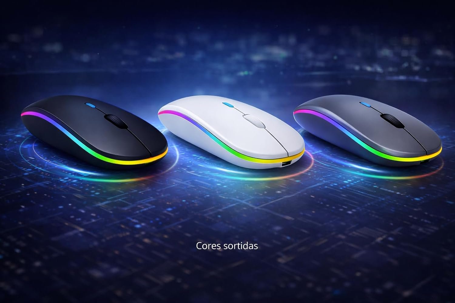 Mouse Sem Fio Recarregável Bluetooth e USB 2.4G, Silencioso RGB, DPI Ajustável, Ergonômico – Compatível com Notebook, PC, Mac e Smart TV