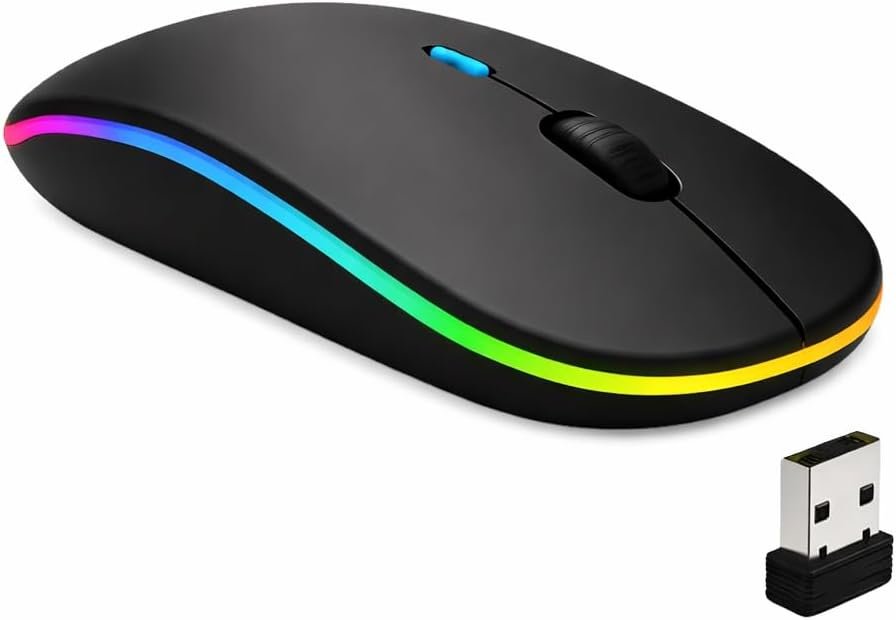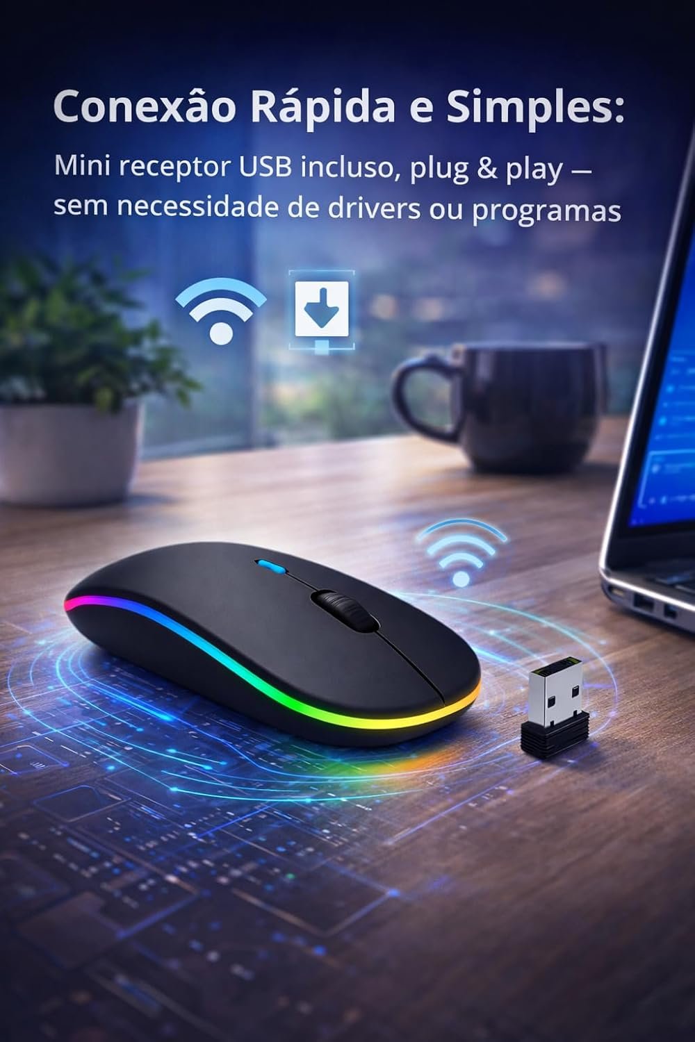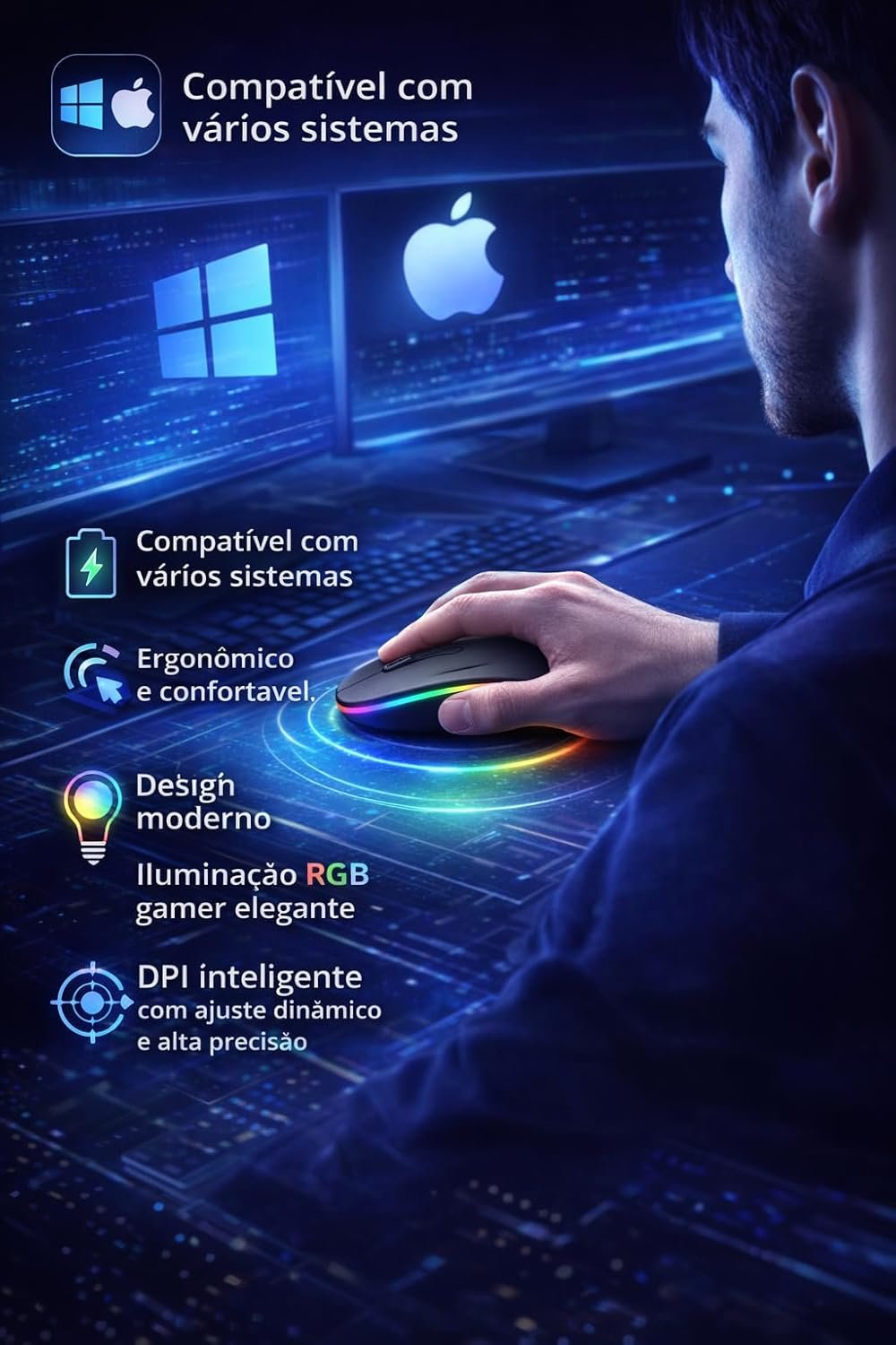 Mouse Sem Fio Recarregável Bluetooth e USB 2.4G, Silencioso RGB, DPI Ajustável, Ergonômico – Compatível com Notebook, PC, Mac e Smart TV