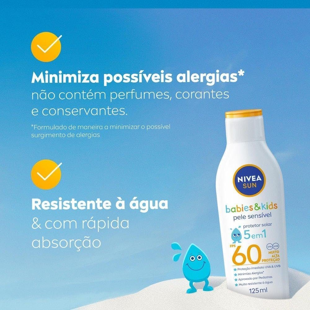 NIVEA SUN Protetor Solar Kids & Babies Pele Sensível FPS 60 125ml – Infantil, muito alta proteção UVA/UVB, minimiza o surgimento de alergias, muito resistente à água com proteção imediataNIVEA SUN Protetor Solar Kids & Babies Pele Sensível FPS 60 125ml – Infantil, muito alta proteção UVA/UVB, minimiza o surgimento de alergias, muito resistente à água com proteção imediata