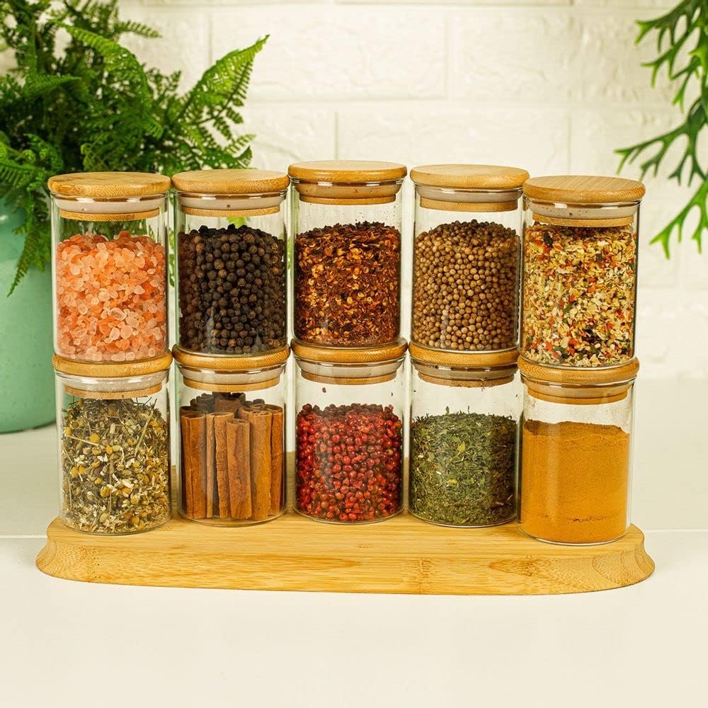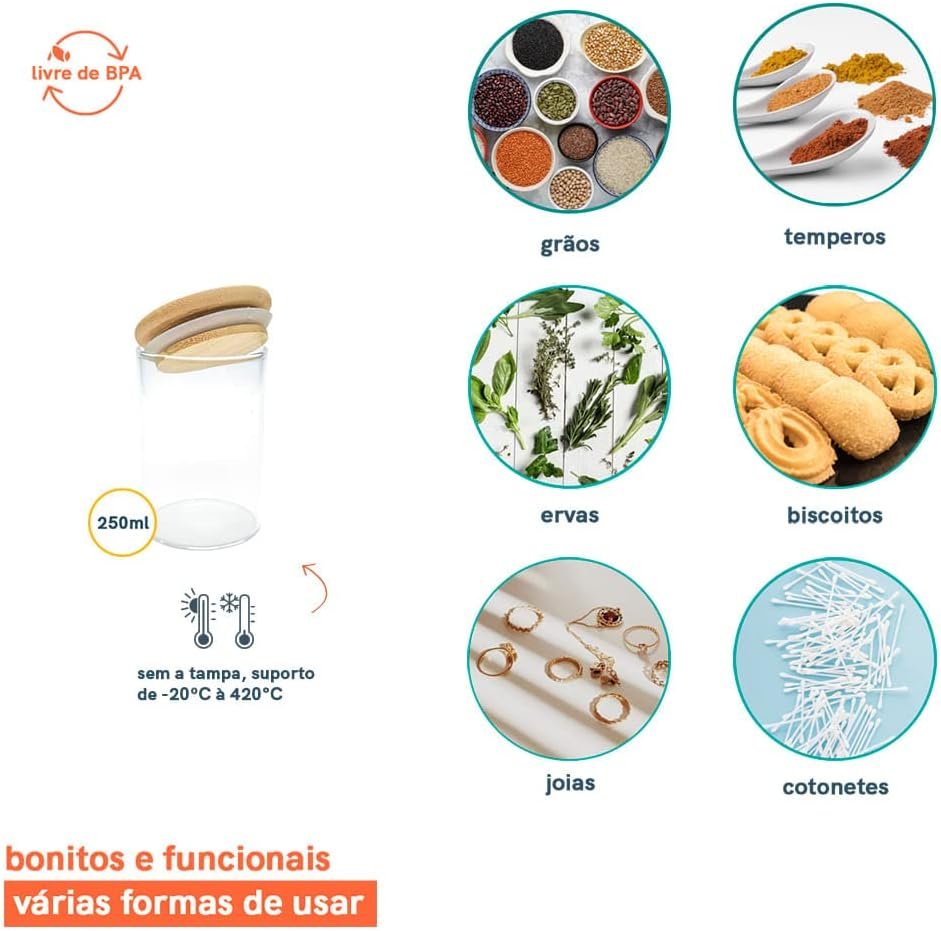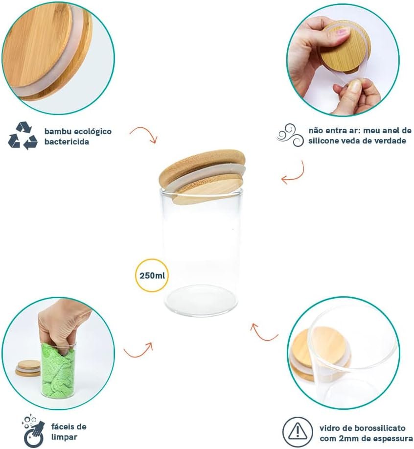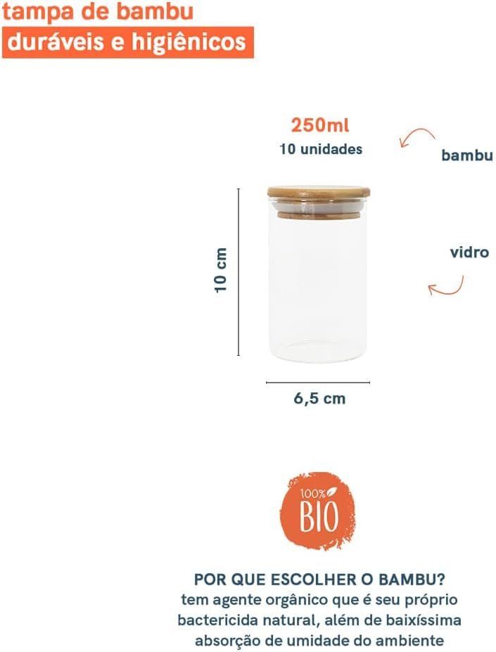 Oikos – Kit 10 Potes de Vidro 250ml com Tampa de Bambu Herméticos Redondos