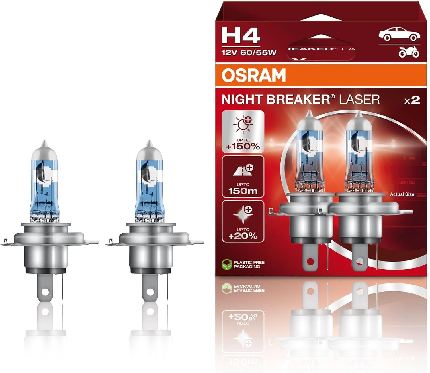 OSRAM NIGHT BREAKER LASER H4, +Lâmpada de farol de halogêneo 150% mais brilhante, 64193NL-HCB, 12V, caixa dobrável suspensa (2 lâmpadas) (branca/amarela)