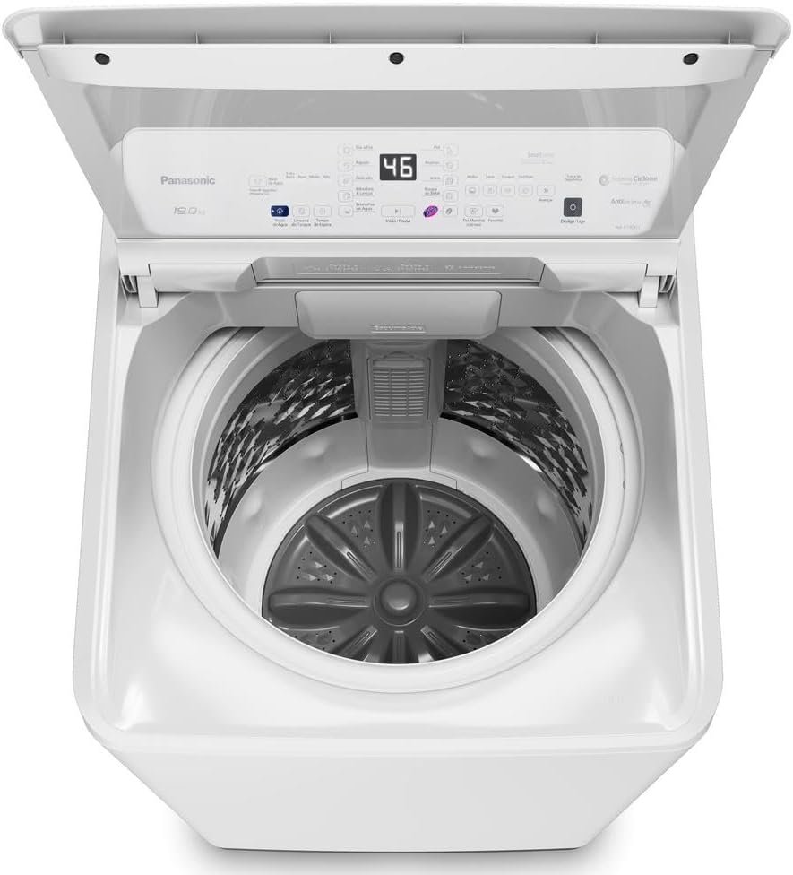 Panasonic NA-F190G1 Máquina de Lavar Top Load, Branco, Classe A, 115x64x72cm, 19Kg, Sistema Ciclone sem Agitador, Painel Digital, Ciclo Pet, Aço Inox
