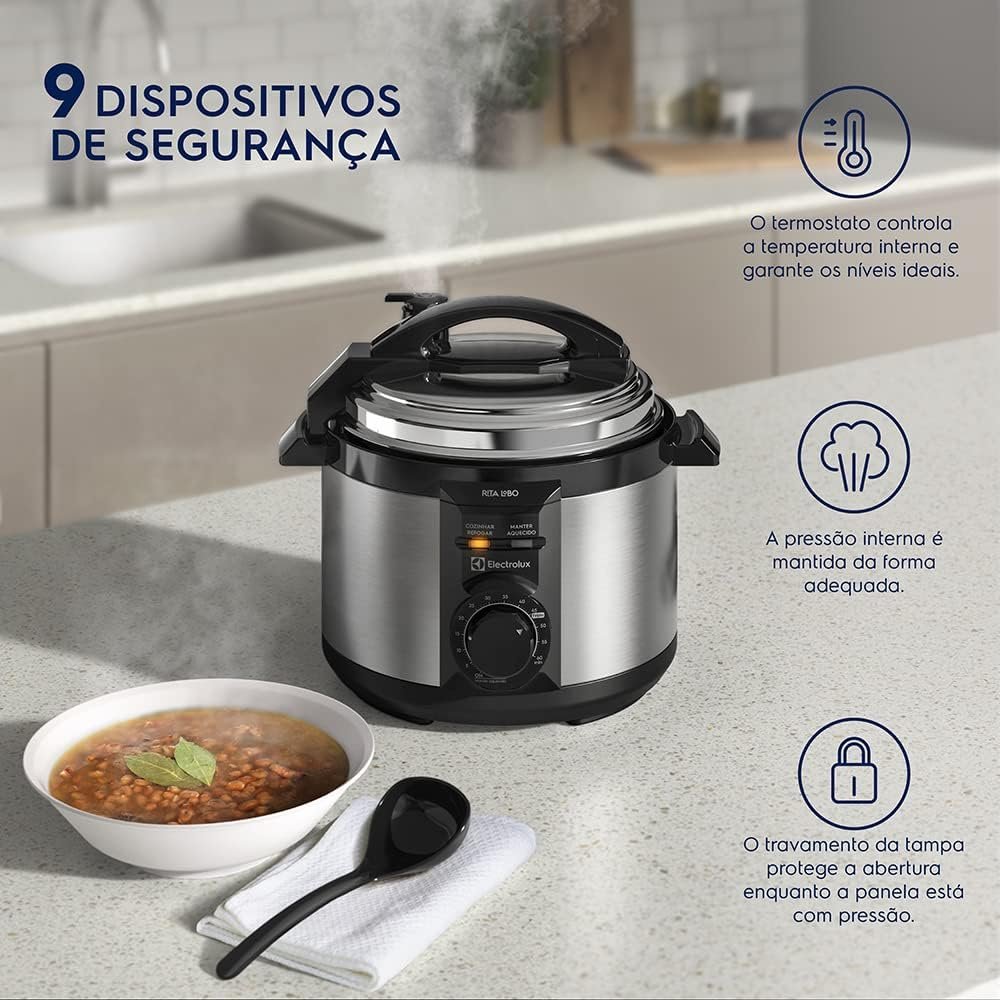 Panela pressão elétrica electrolux 3 Litros inox compacta feijão segura 9 travas segurança silenciosa PCE15 Rita Lobo 220v