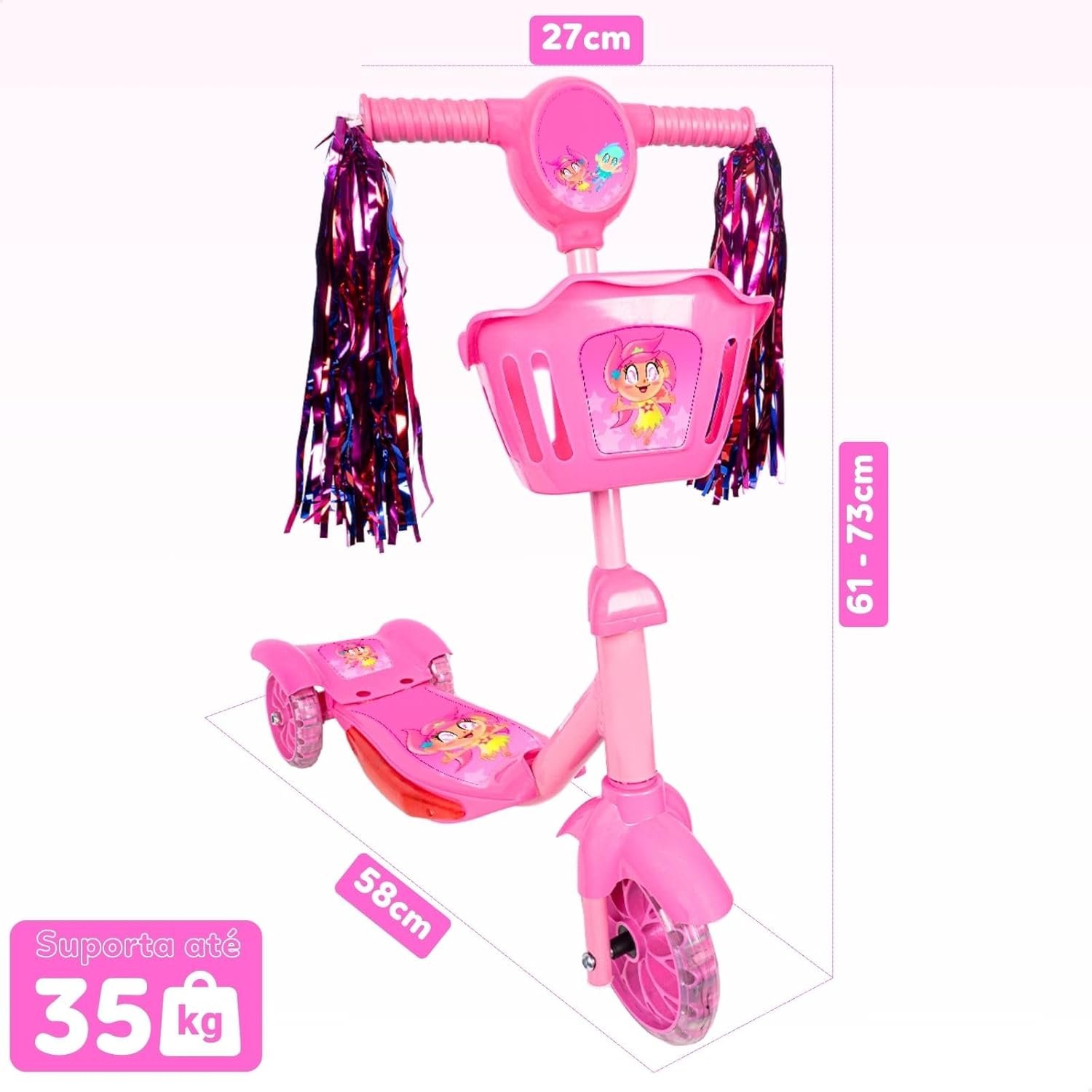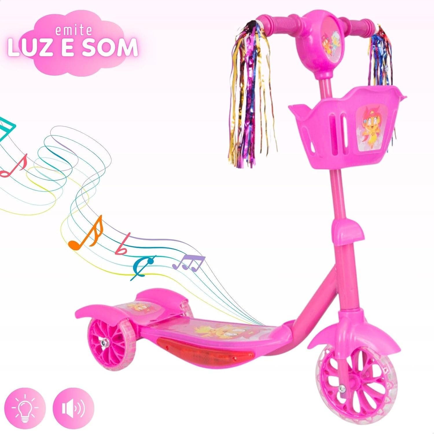 Patinete Infantil 3 Rodas com Luzes Led e Cesta Emite Som Musical Altura Regulável e Freio Traseiro (Rosa)