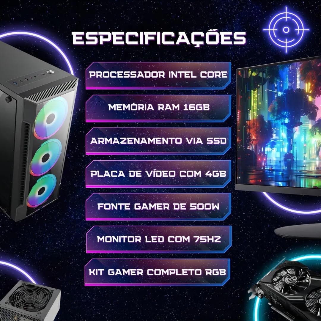 PC GAMER COMPLETO INTEL CORE I7 16GB RAM PLACA DE VIDEO RX 550 4GB SSD 480GB FONTE 500W – MONITOR 20” 75HZ – KIT GAMER TECLADO/MOUSE/HEADSET/MOUSEPAD