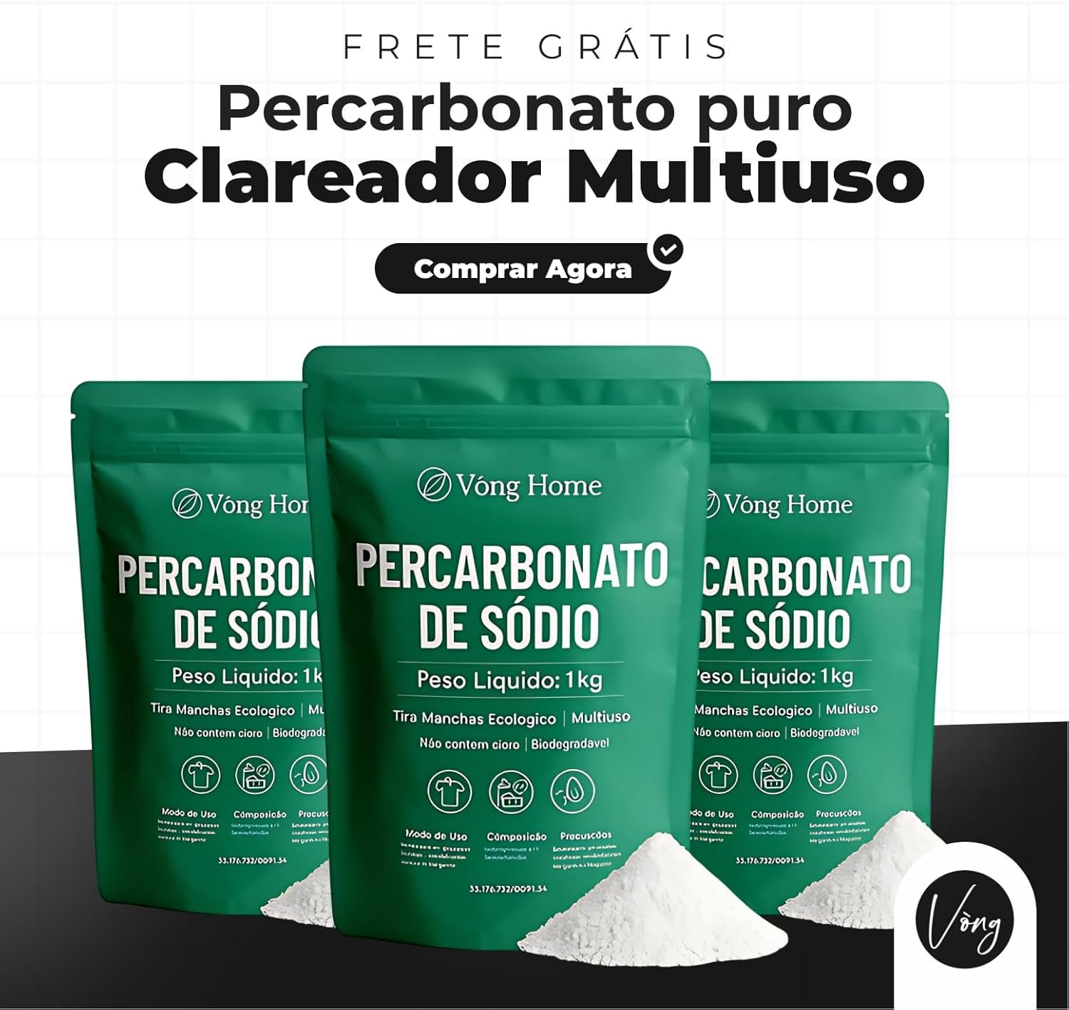 Tenha roupas impecáveis com o Percabonato de Sódio Vòng! Este poderoso removedor de manchas multiuso, biodegradável e com 1kg, garante uma limpeza profunda e um branqueamento eficaz. Deixe suas roupas limpas e brilhantes com praticidade e sustentabilidade.