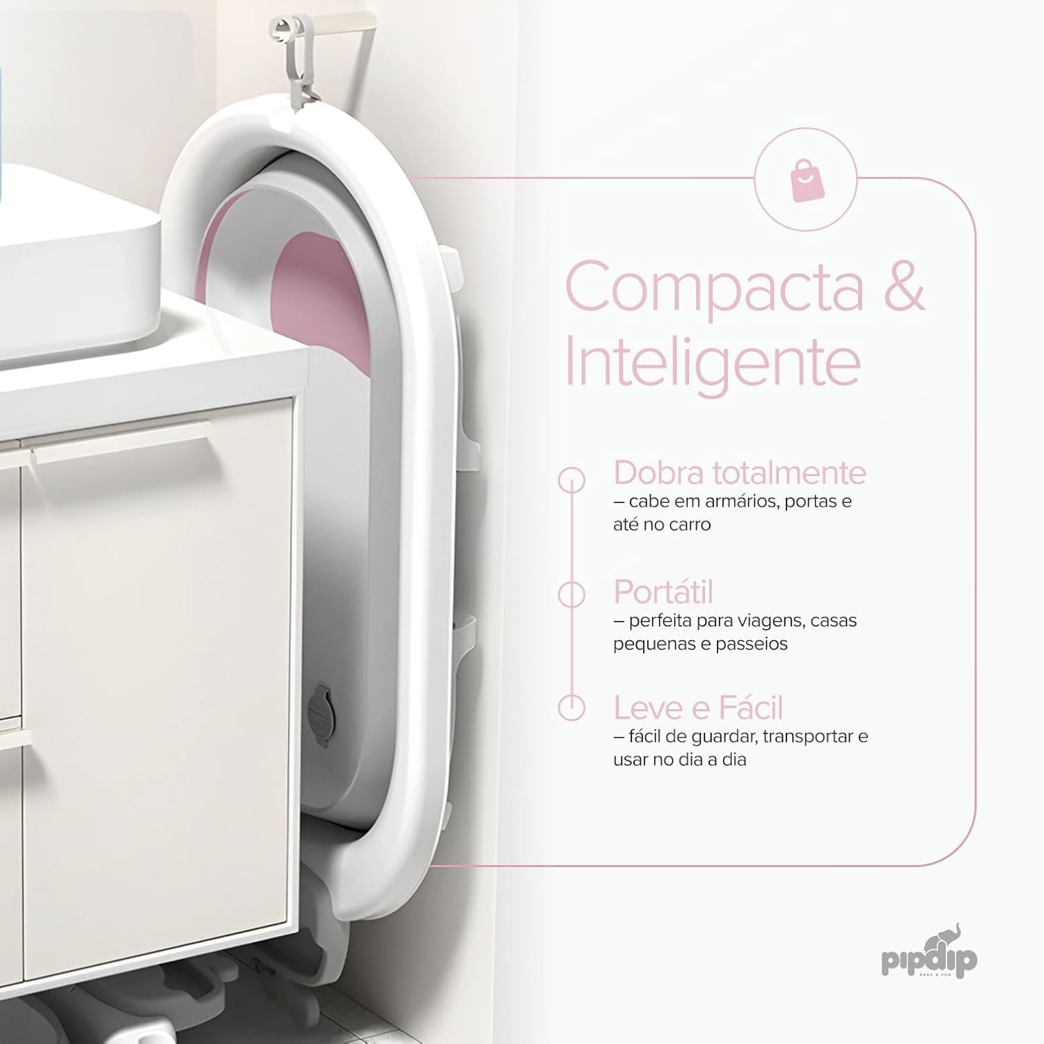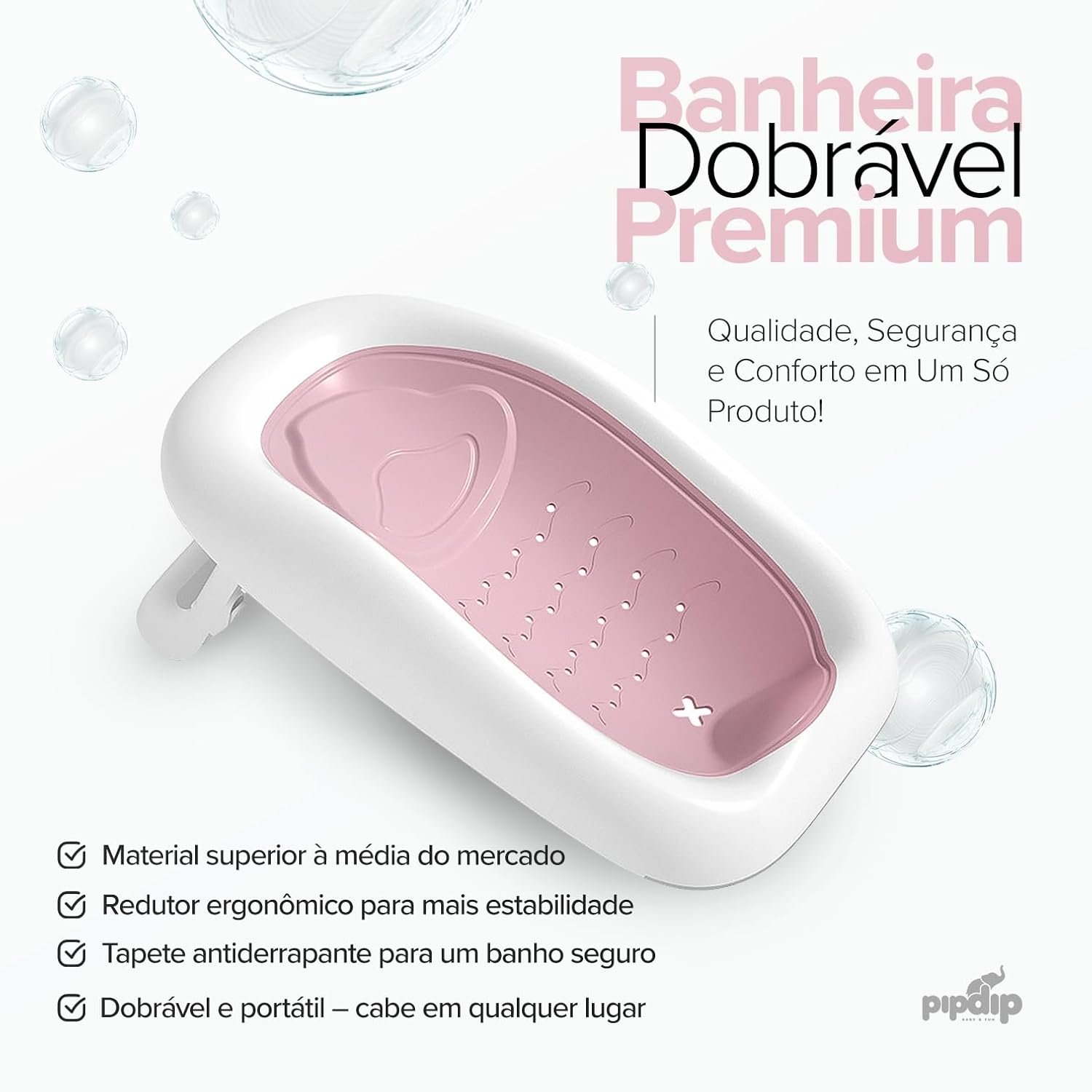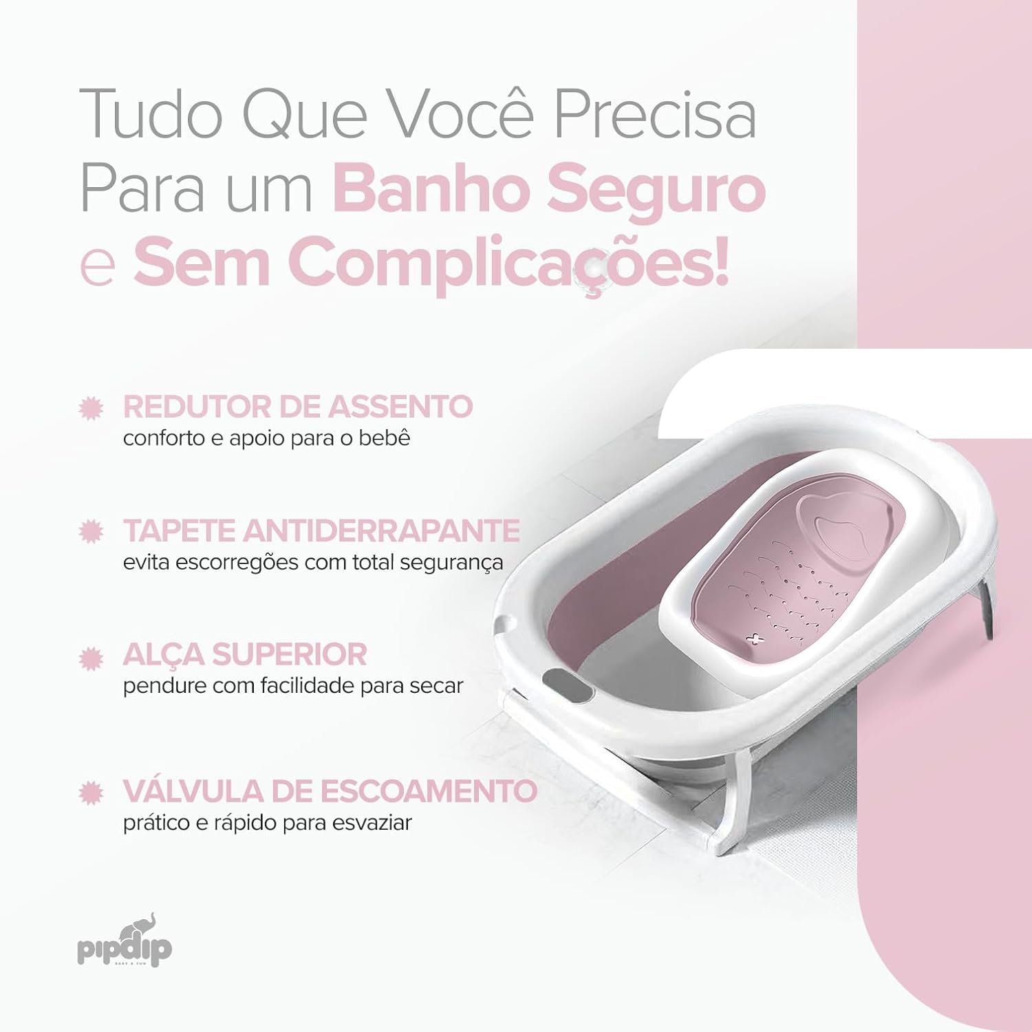 PIPDIP Kit Banheira Dobrável 2 em 1 para Bebê, Capacidade de até 44 Litros, Com Encosto, Portátil, Plástico e Borracha, Branco e Rosa.