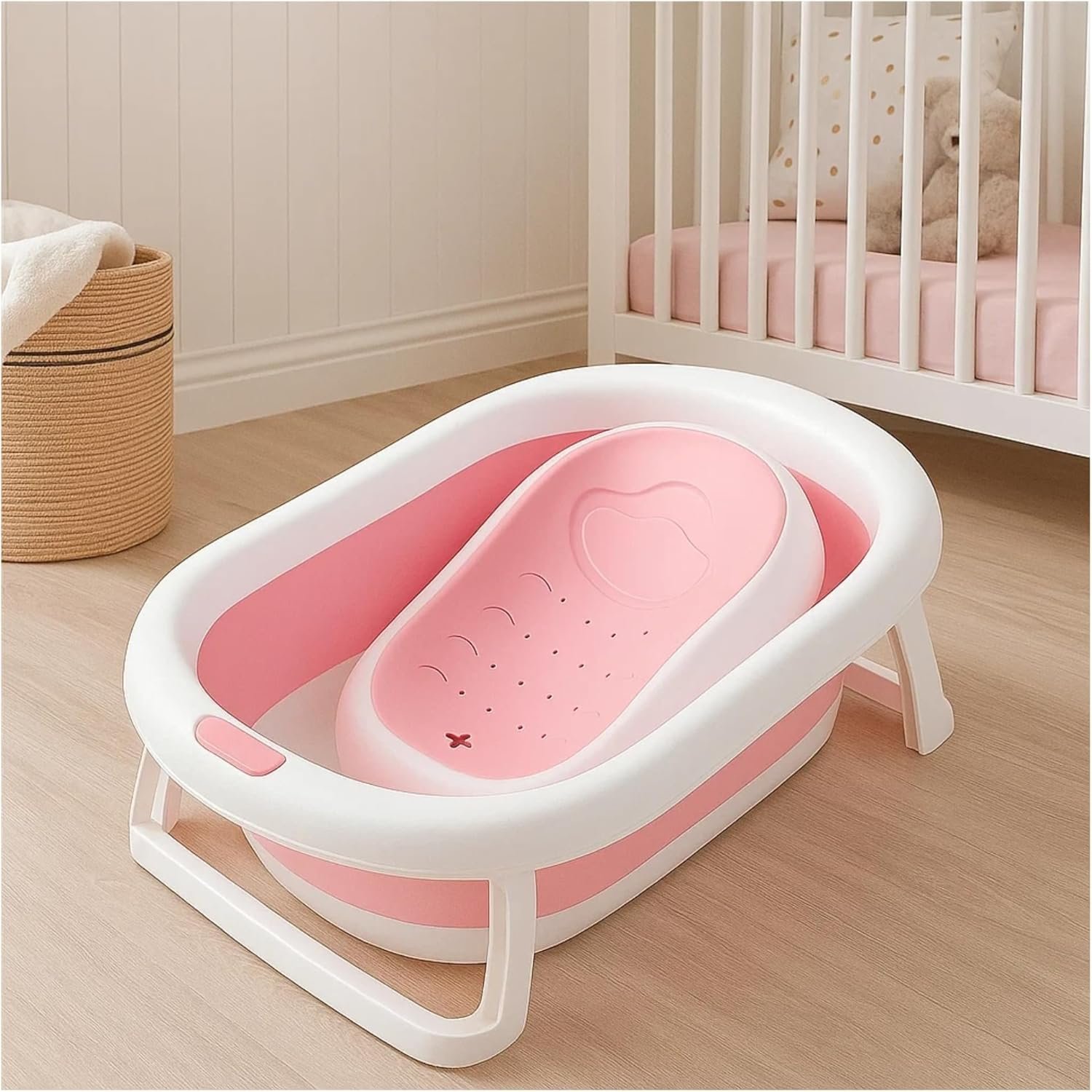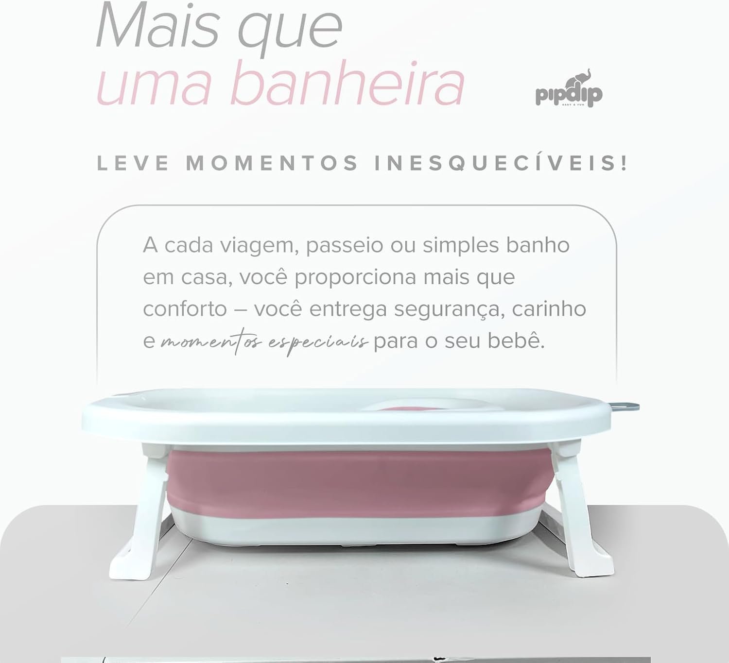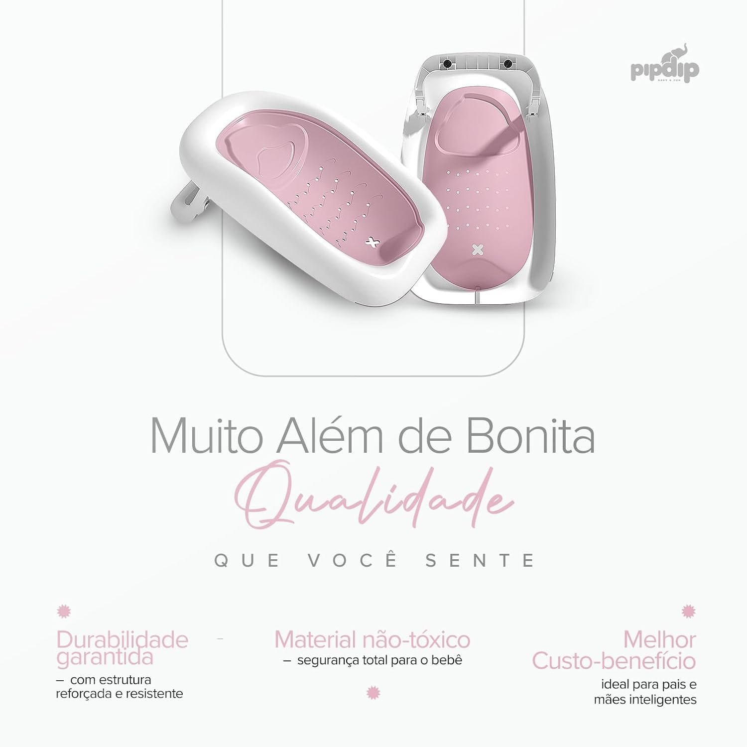 PIPDIP Kit Banheira Dobrável 2 em 1 para Bebê, Capacidade de até 44 Litros, Com Encosto, Portátil, Plástico e Borracha, Branco e Rosa.