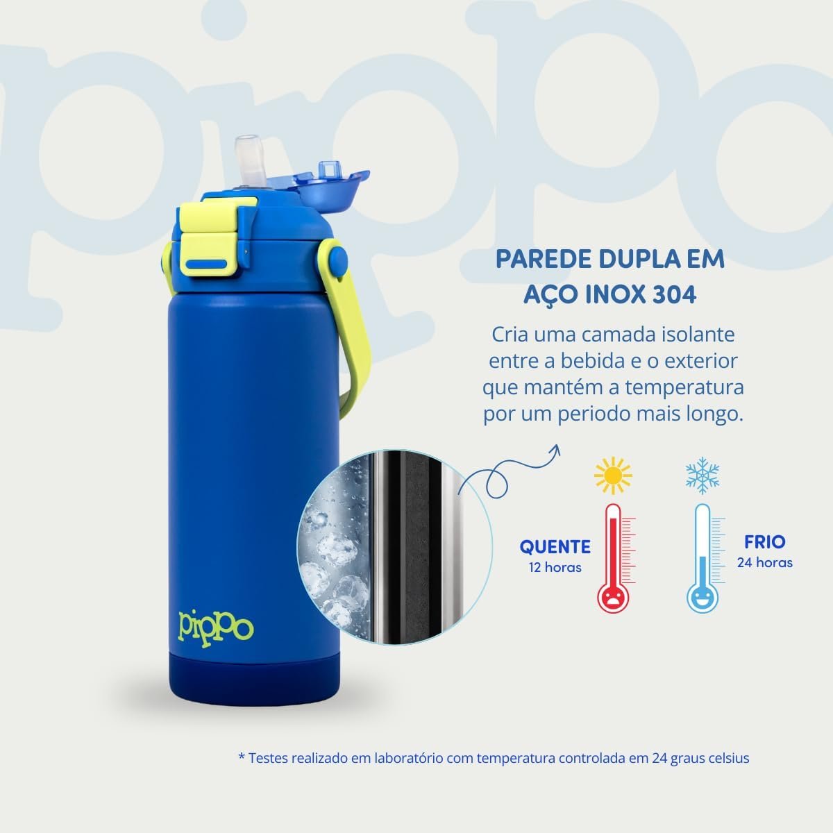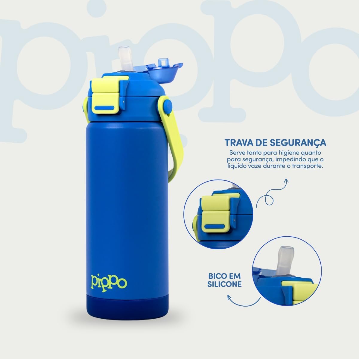 Pippo Garrafa Termica Infantil Tampla Dupla Função com Parede Dupla em Aço Inox Com Alça Sem BPA (Azul)