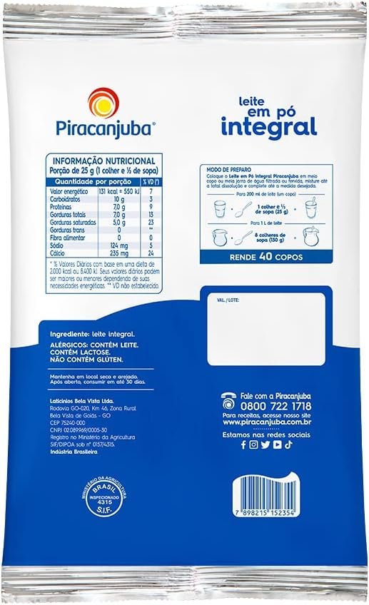 Piracanjuba Leite Em Pó Integral 1Kg