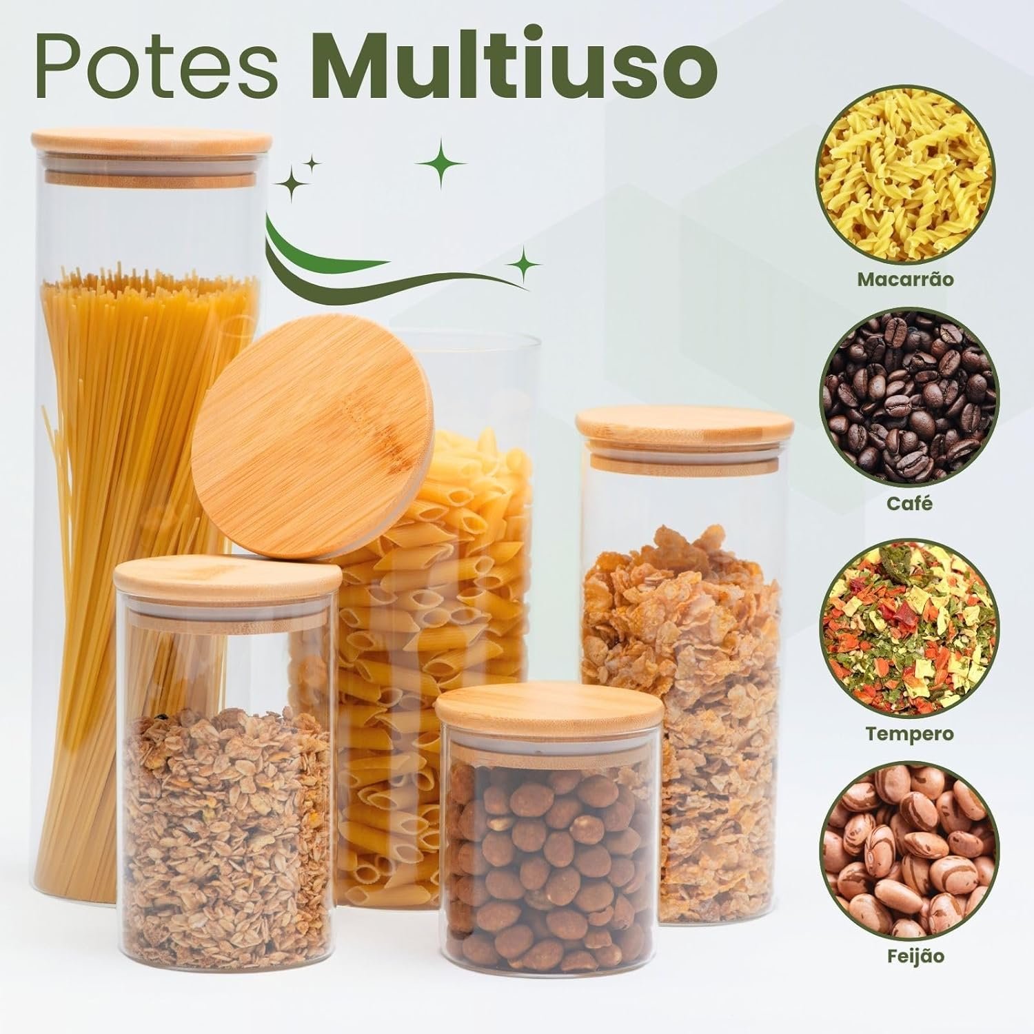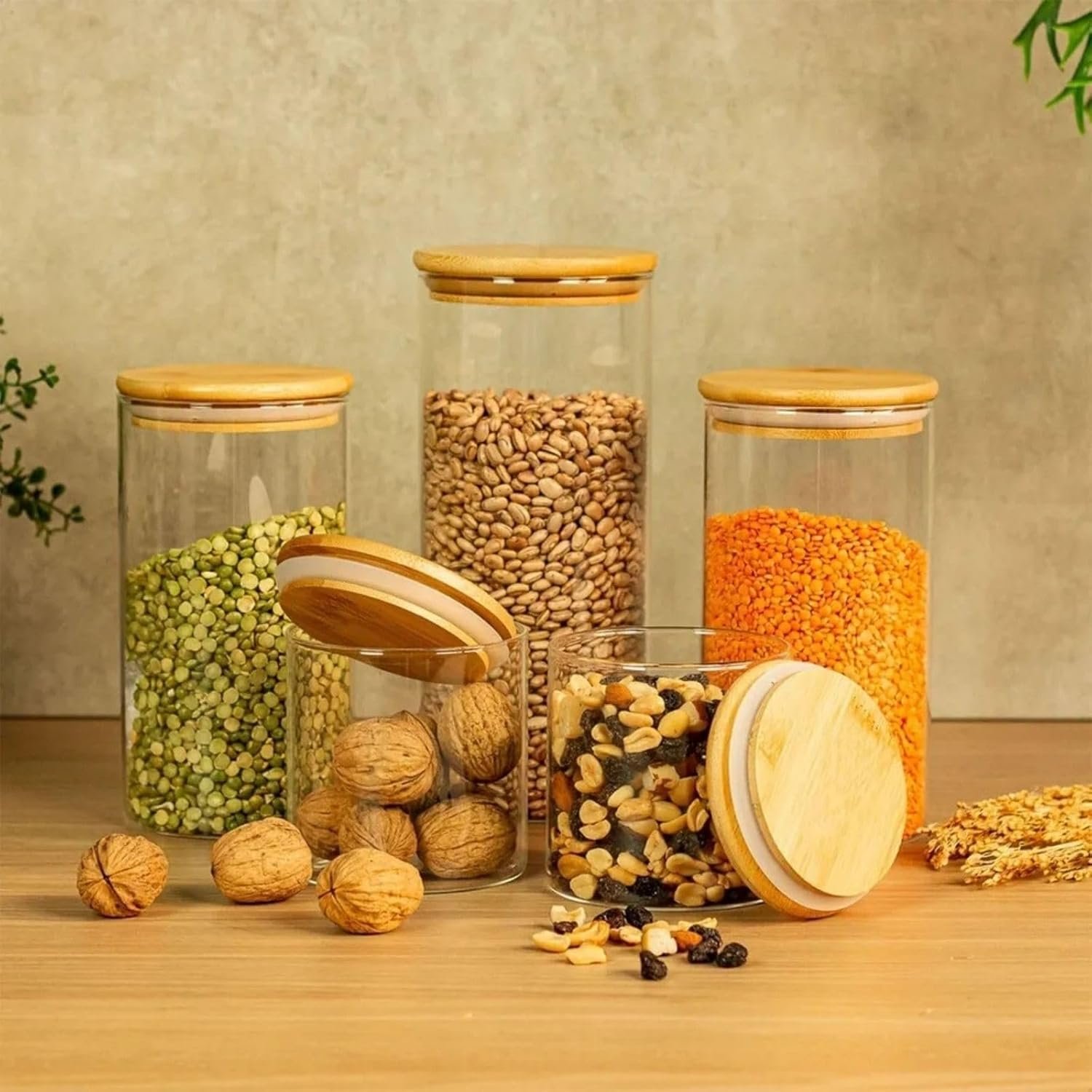 Organize sua cozinha com estilo e praticidade usando o Kit de 5 Potes Herméticos de Vidro. Com tampas de bambu e design transparente, você terá seus mantimentos sempre frescos e visíveis, facilitando a identificação do conteúdo. Feitos com materiais duráveis, esses potes são ideais para armazenar grãos, temperos, chás e muito mais. Mantenha sua despensa organizada e seus alimentos protegidos com elegância!