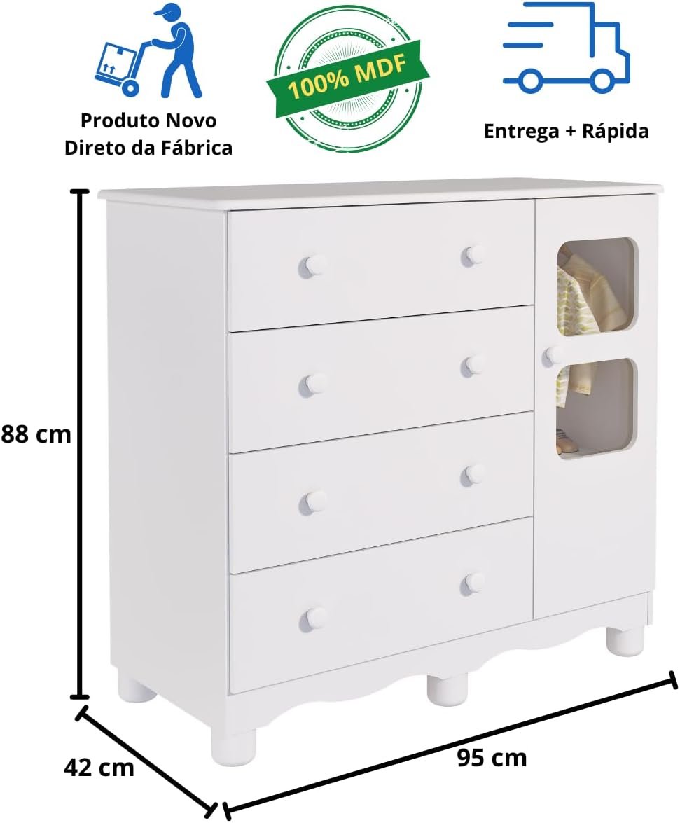 - A Cômoda Uli de 4 gavetas oferece amplo espaço para organizar roupas e acessórios do bebê, mantendo tudo sempre à mão.