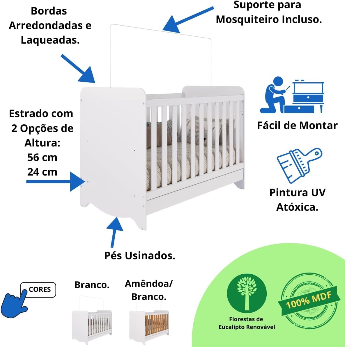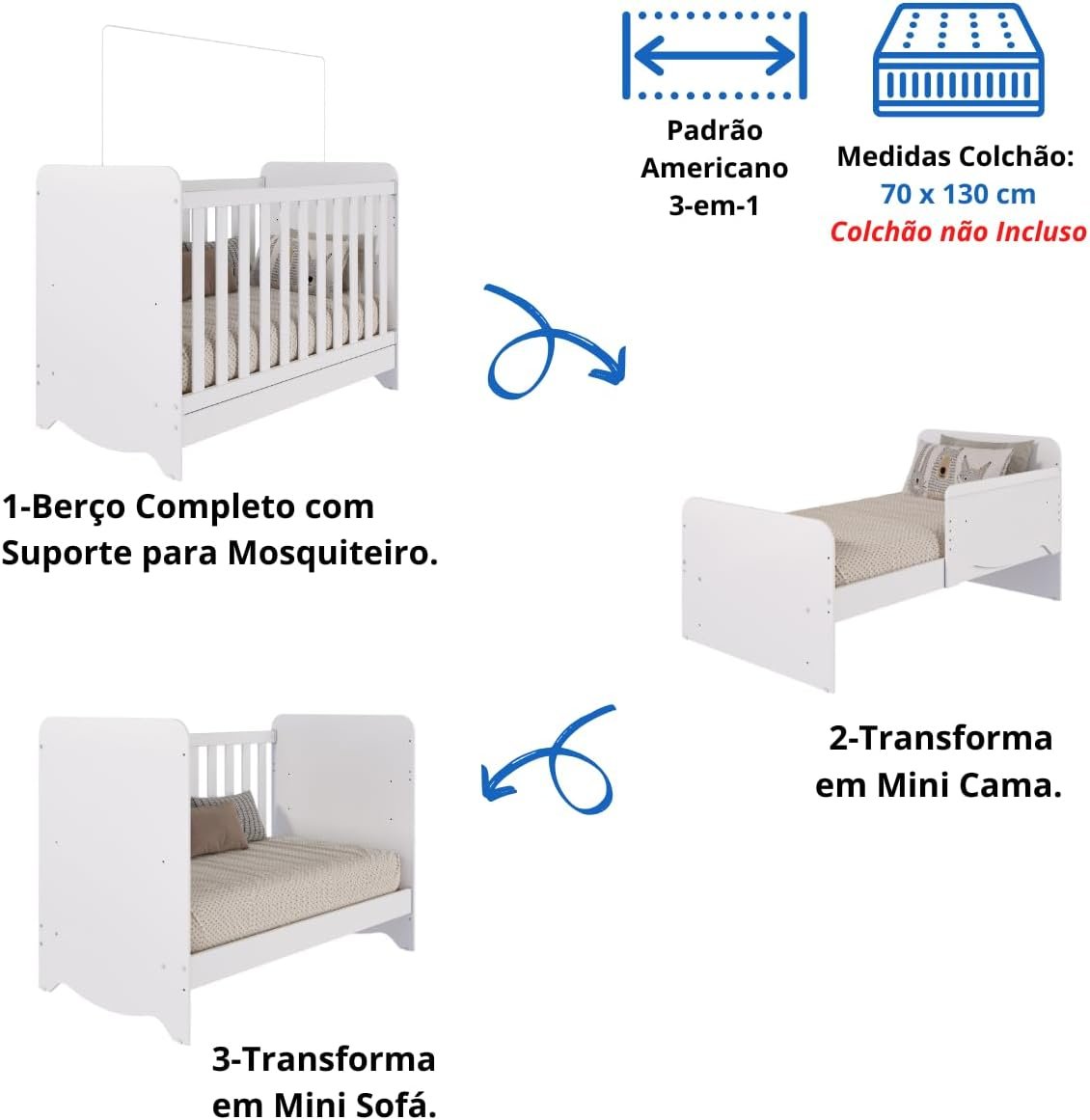 - O Berço Americano Ben 3 em 1 se adapta ao crescimento do seu bebê, podendo ser transformado em mini cama e sofá.