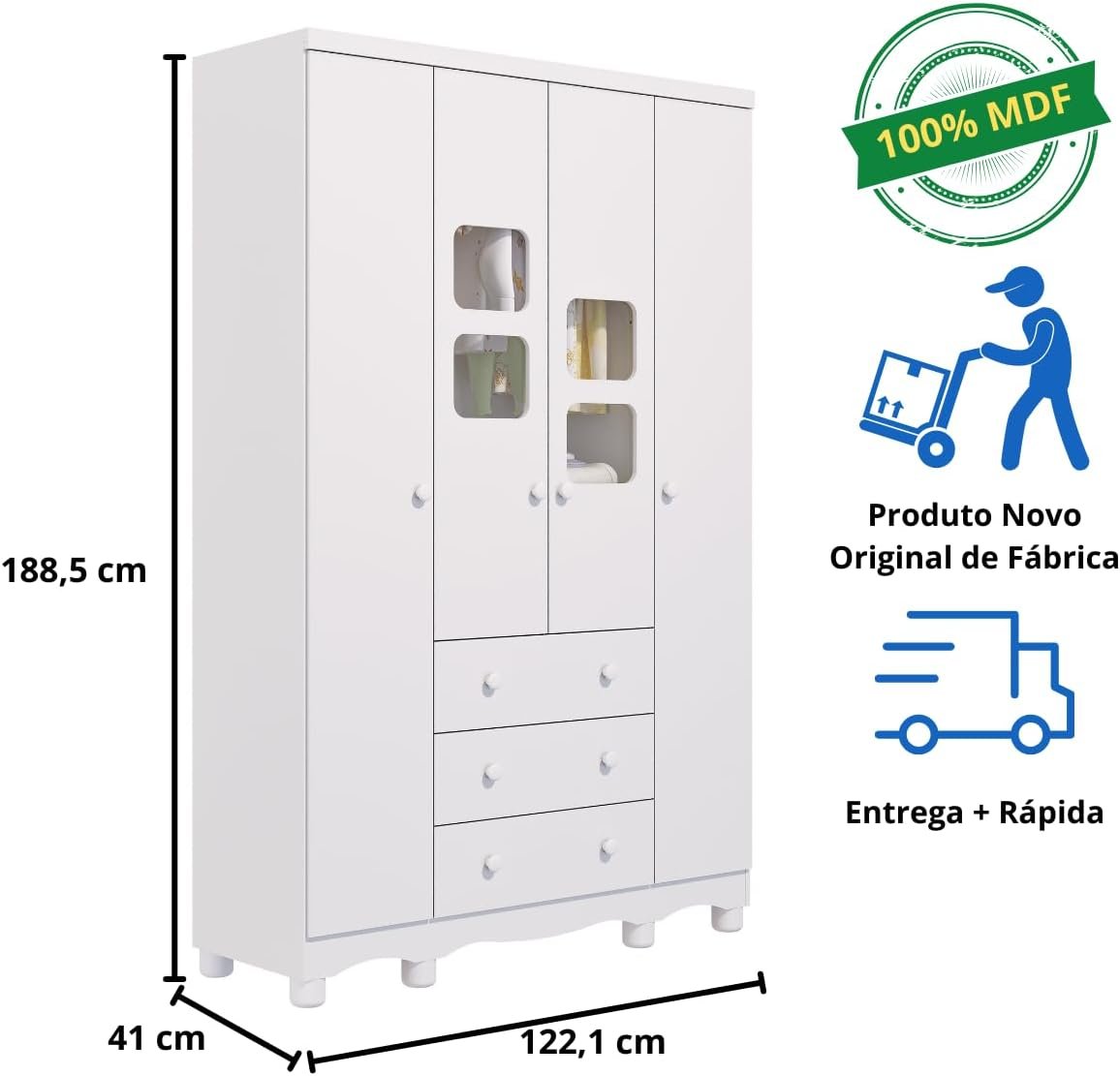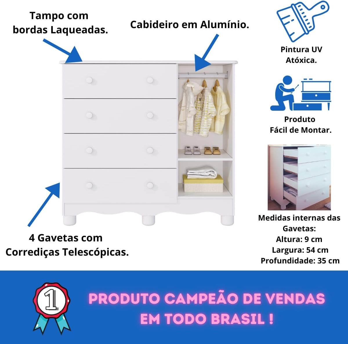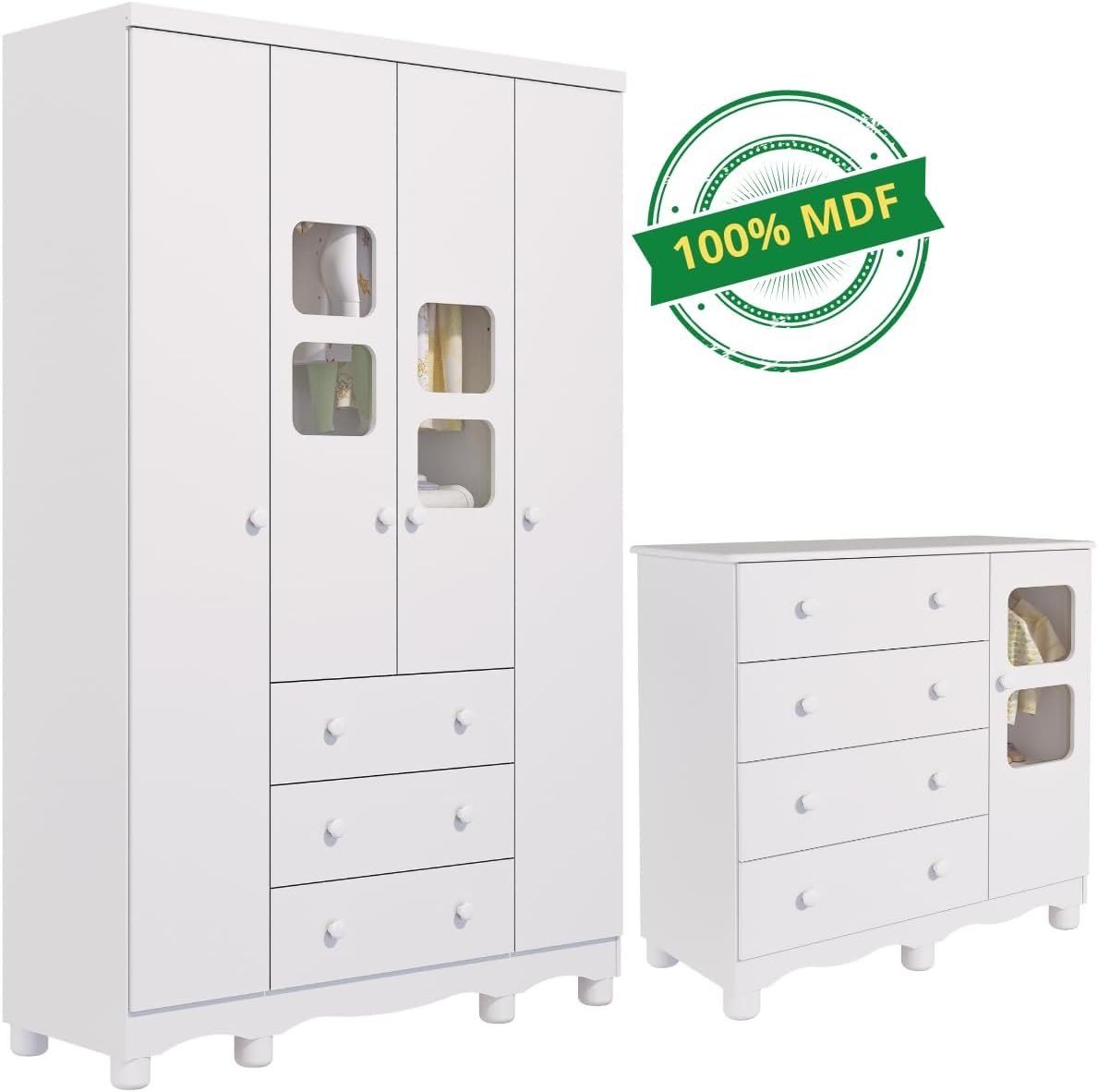 Quarto de Bebê Completo com Guarda Roupa Uli 4 Portas Cômoda Uli 4 Gavetas Móveis Peroba Branco Brilho
