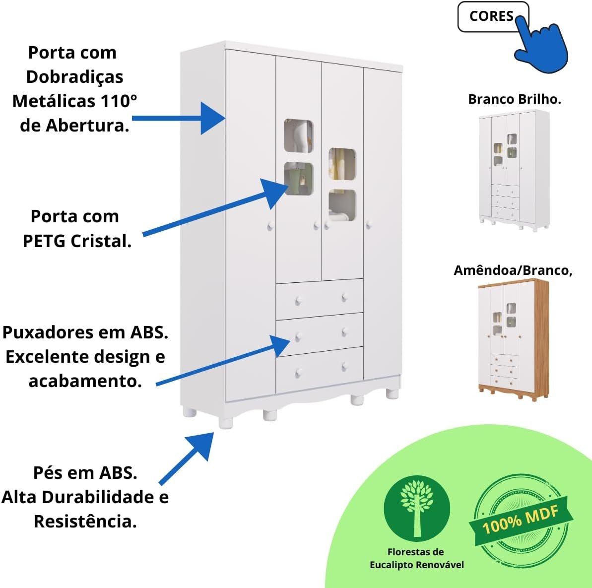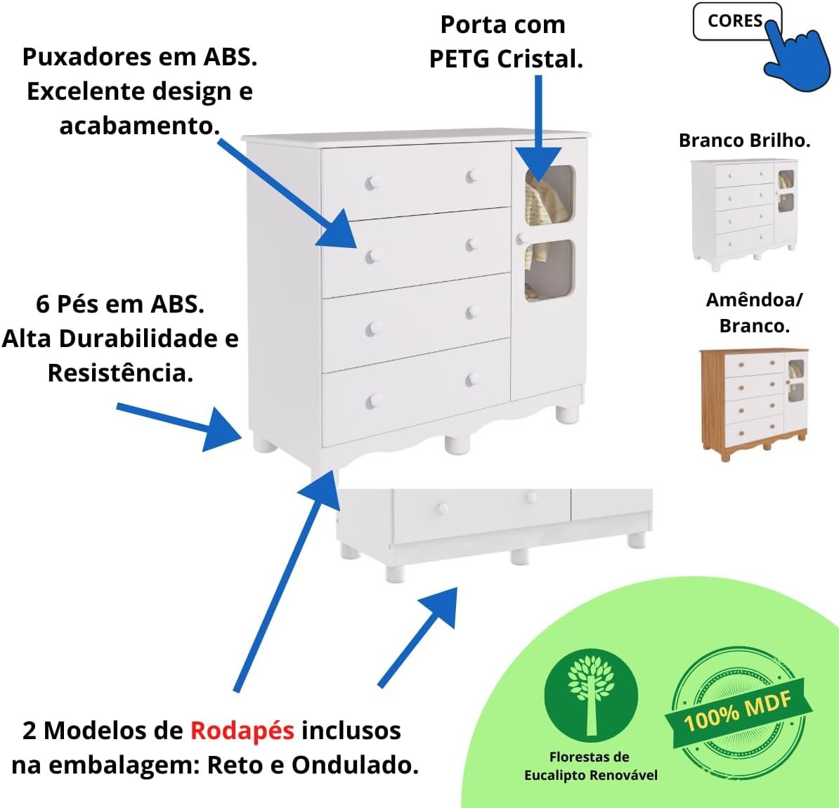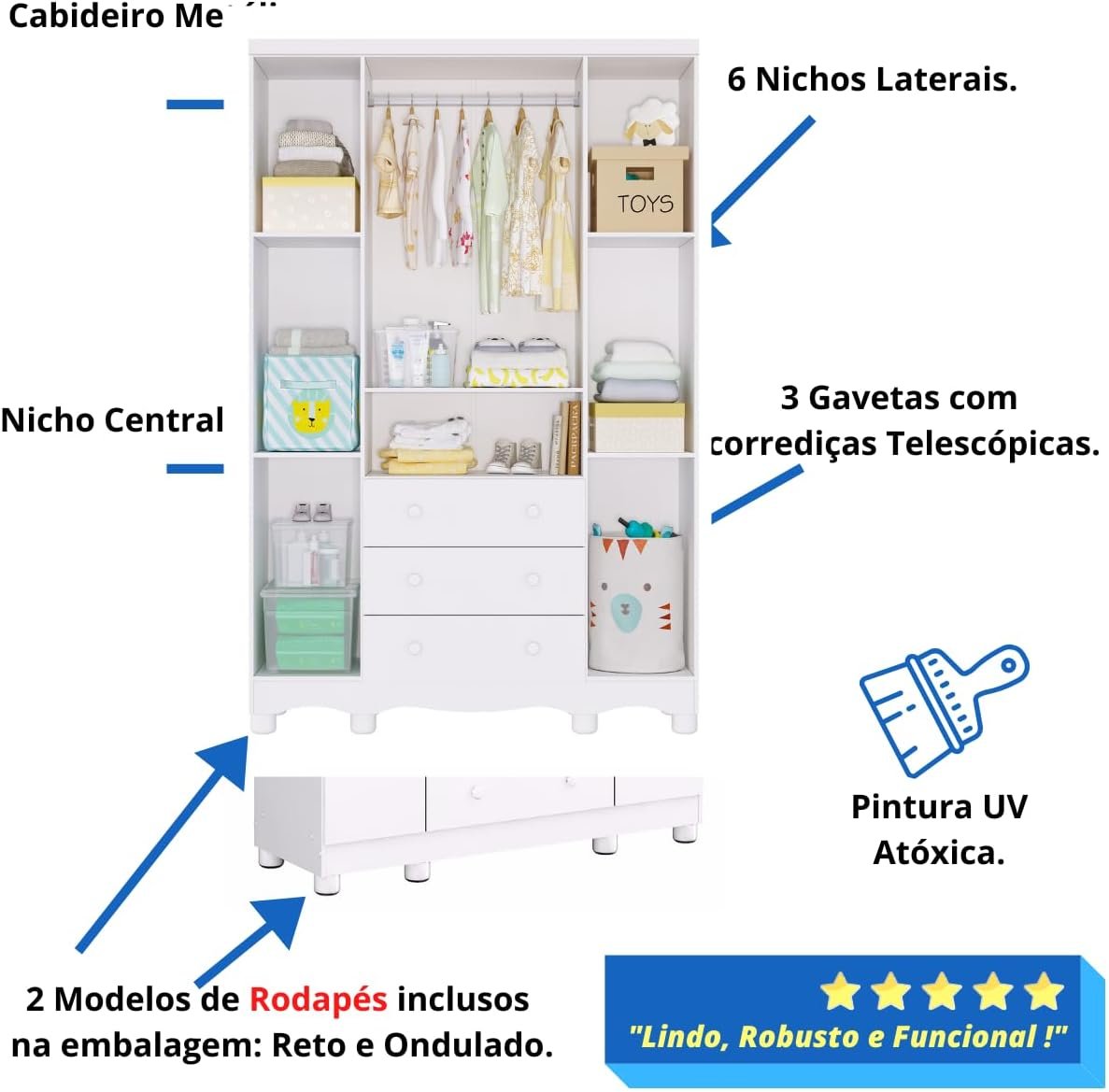Quarto de Bebê Completo com Guarda Roupa Uli 4 Portas Cômoda Uli 4 Gavetas Móveis Peroba Branco Brilho