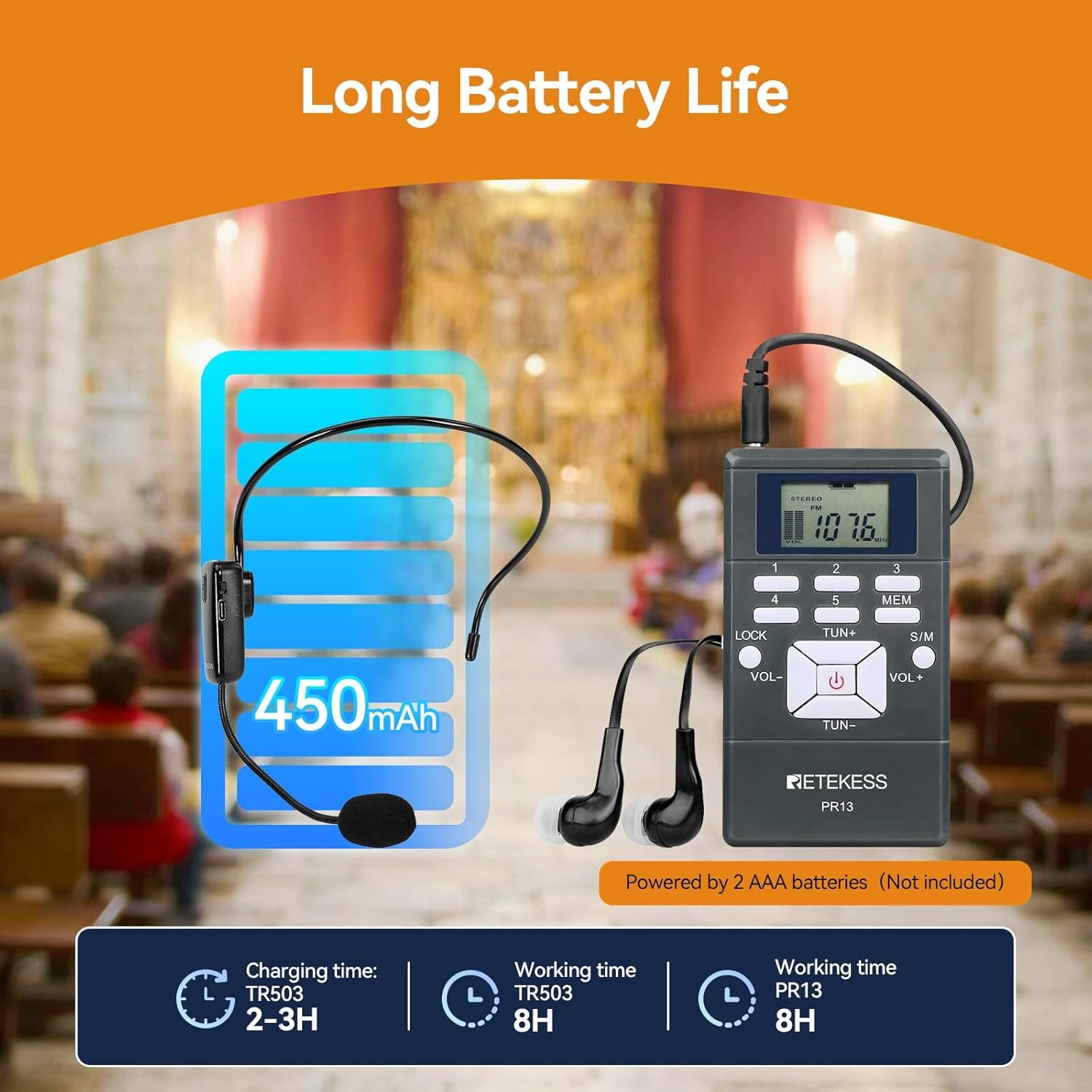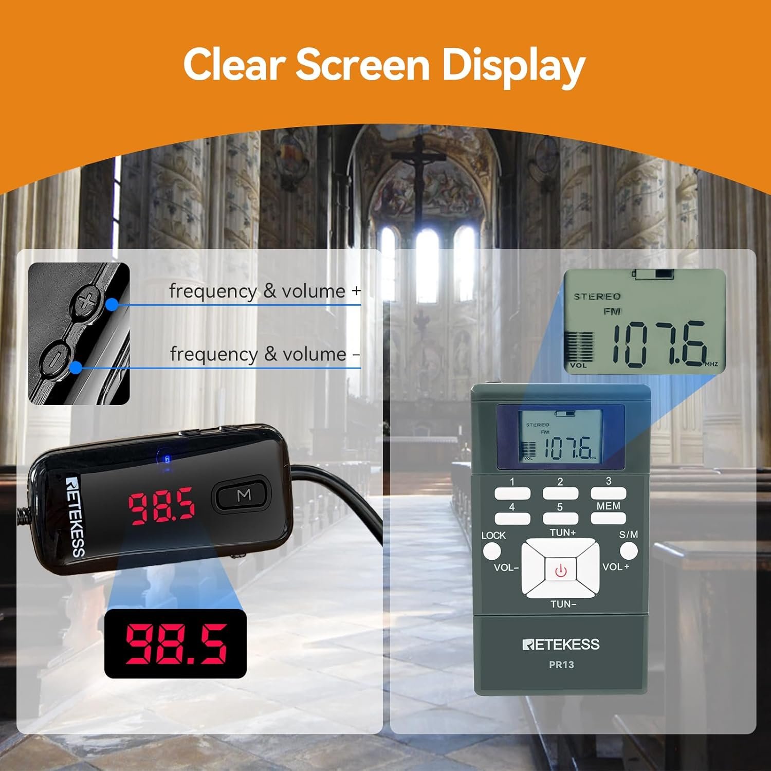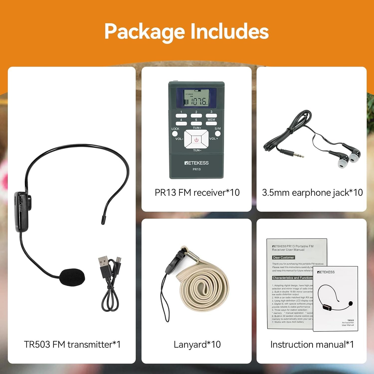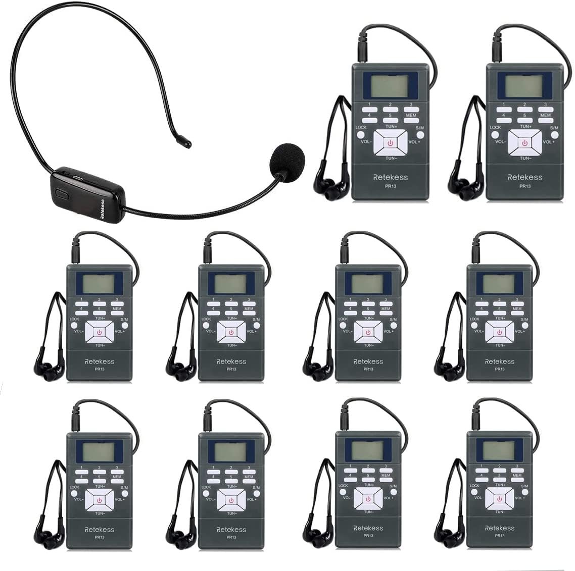 Retekess Sistema de tradução de igreja com 1 fone de ouvido transmissor FM TR503 e 10 receptores de rádio FM PR13, sistema de audição para igreja escolar e museu da fábrica (1 transmissor e 10