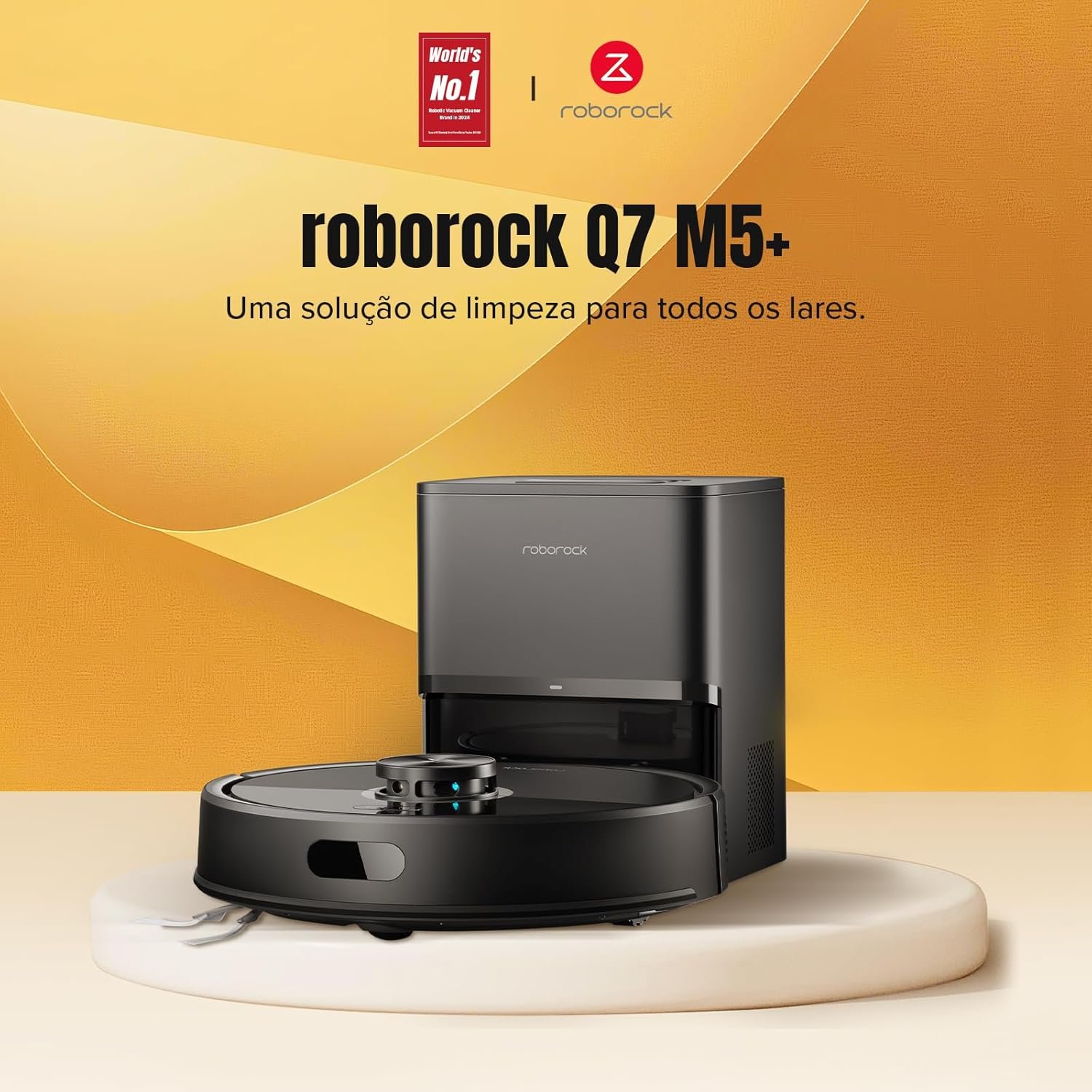 Robô aspirador de pó e esfregão roborock Q7 M5+, base com esvaziamento automático, sucção de 10.000 Pa, sistema duplo antiemaranhamento, navegação PreciSense LiDAR, para carpetes, pretoRobô aspirador de pó e esfregão roborock Q7 M5+, base com esvaziamento automático, sucção de 10.000 Pa, sistema duplo antiemaranhamento, navegação PreciSense LiDAR, para carpetes, preto
