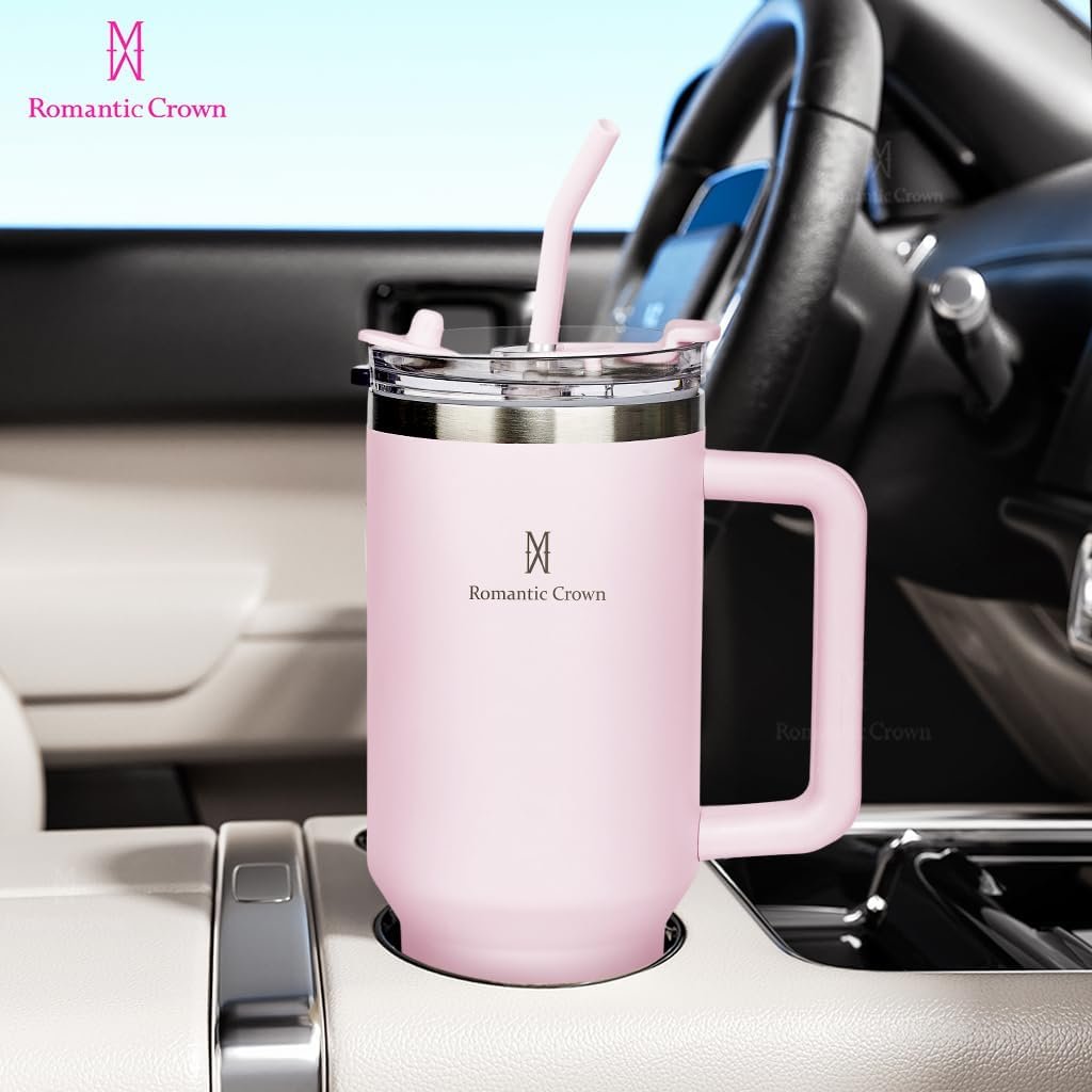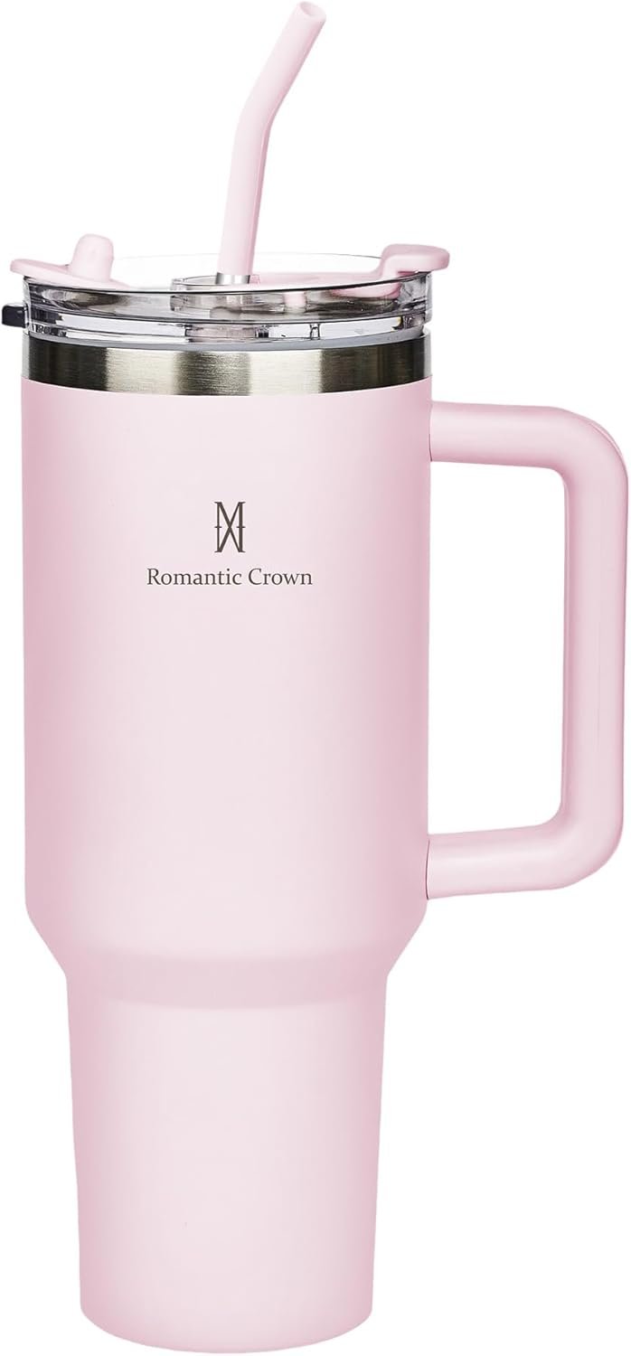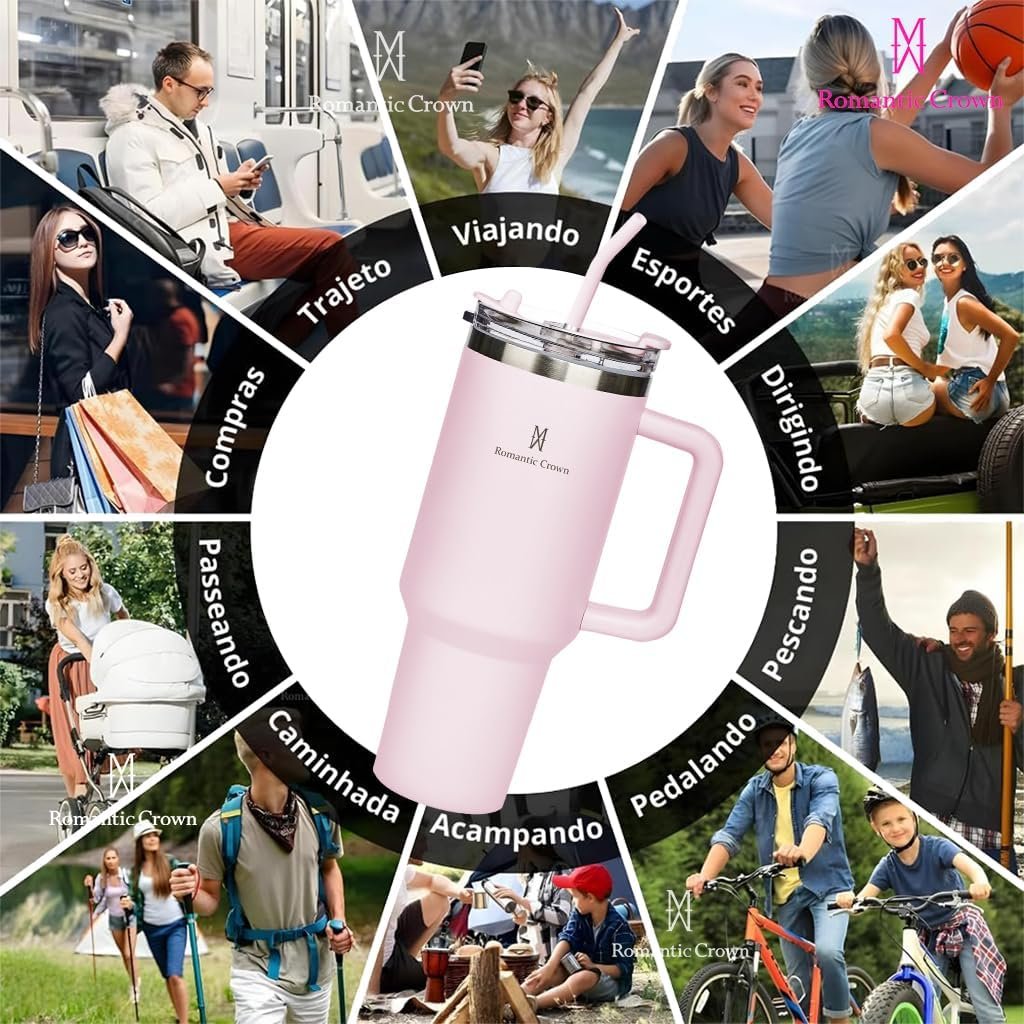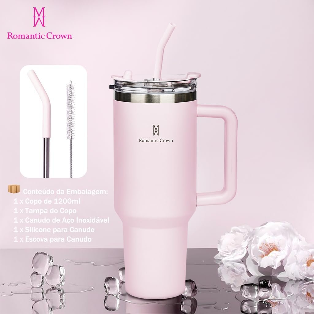 Romantic Crown Copo Térmico com Canudo Tampa e Alça 1,18L, Copos Garrafas Termico para viagem vácuo dupla camada aço inoxidável, Caneca Termica Cafe Água Chá,Presente, Fitness (Rosa claro)