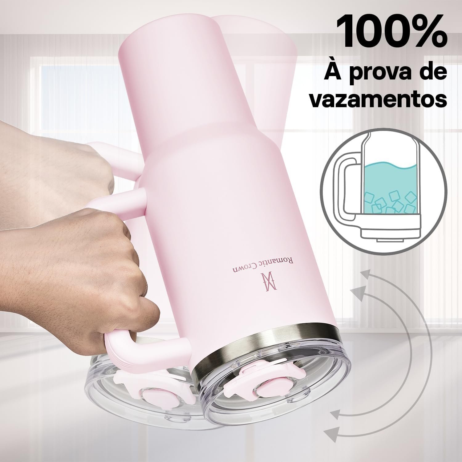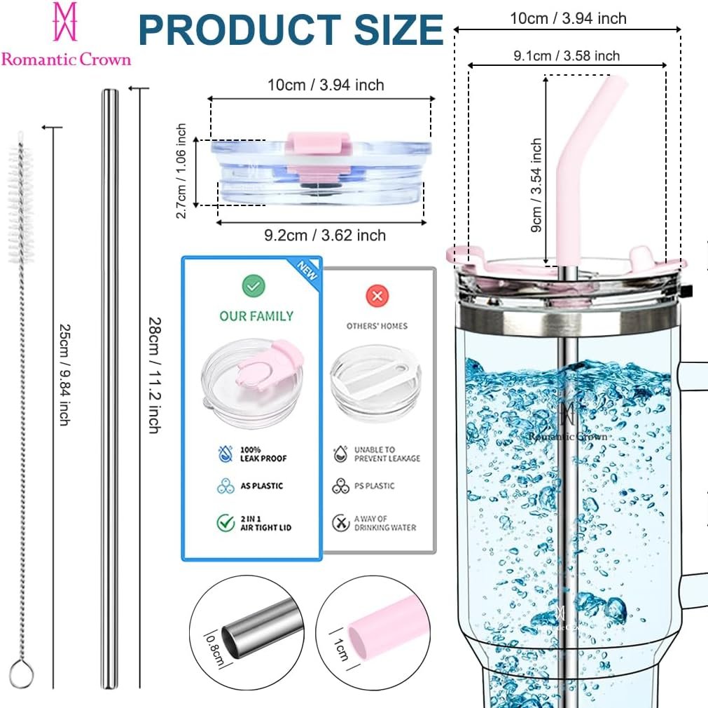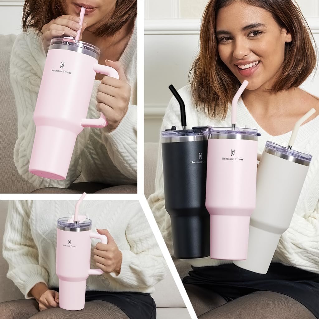Romantic Crown Copo Térmico com Canudo Tampa e Alça 1,18L, Copos Garrafas Termico para viagem vácuo dupla camada aço inoxidável, Caneca Termica Cafe Água Chá,Presente, Fitness (Rosa claro)