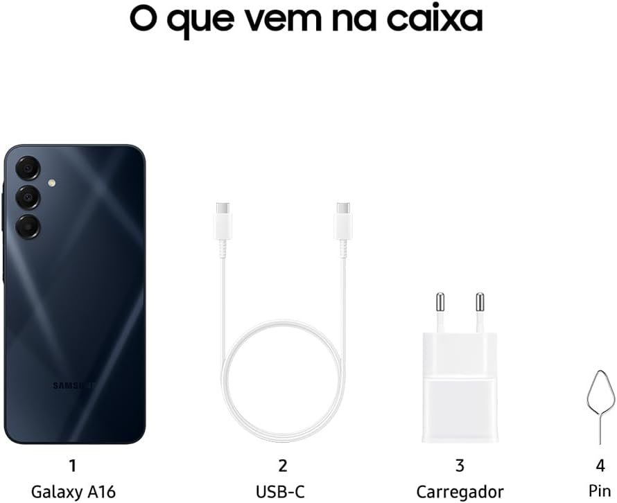 Samsung Celular Galaxy A16, 128GB + 4GB RAM, Câmera de até 50MP, Tela 6.7″, NFC, IP54, Bateria 5000 mAh (Preto)
